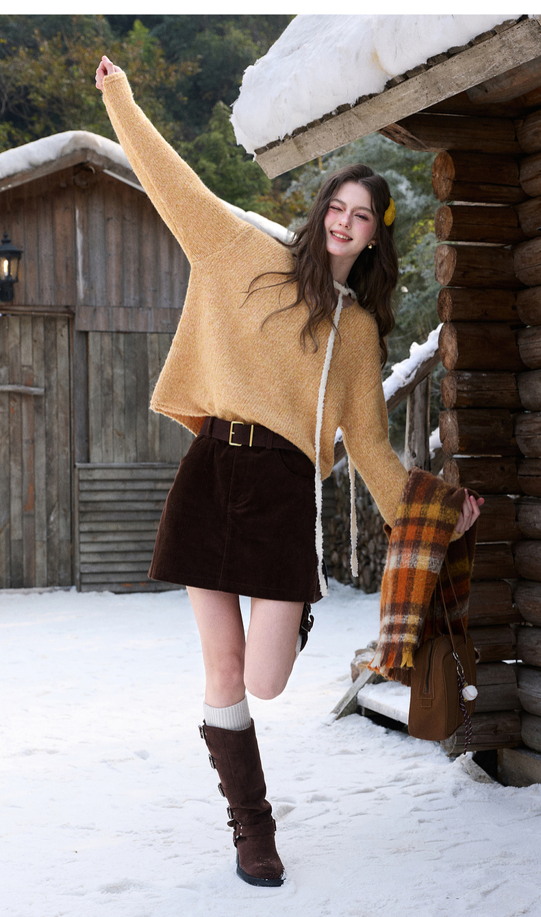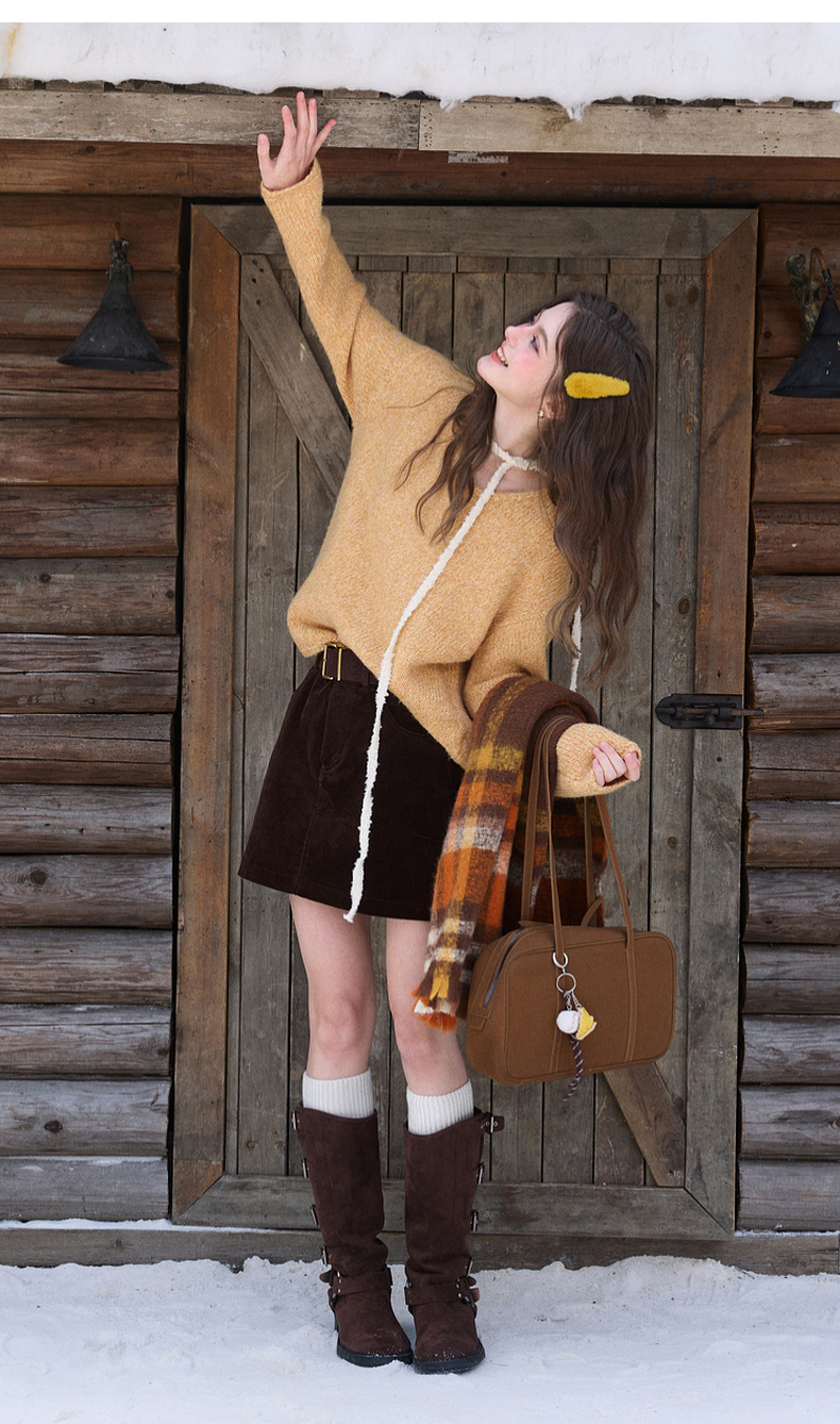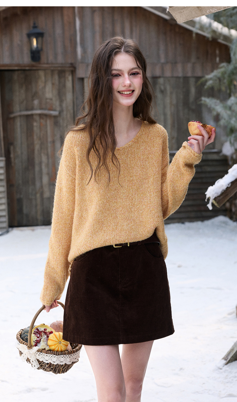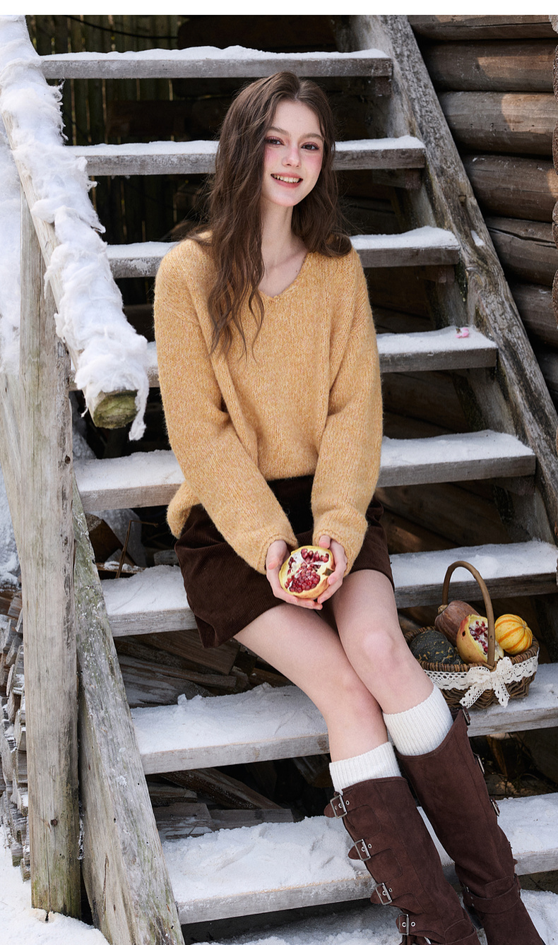 三彩2025冬季新款休闲简约V领针织衫落肩袖宽松套头毛衫上衣M