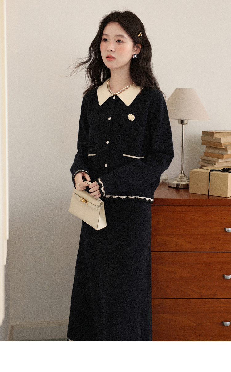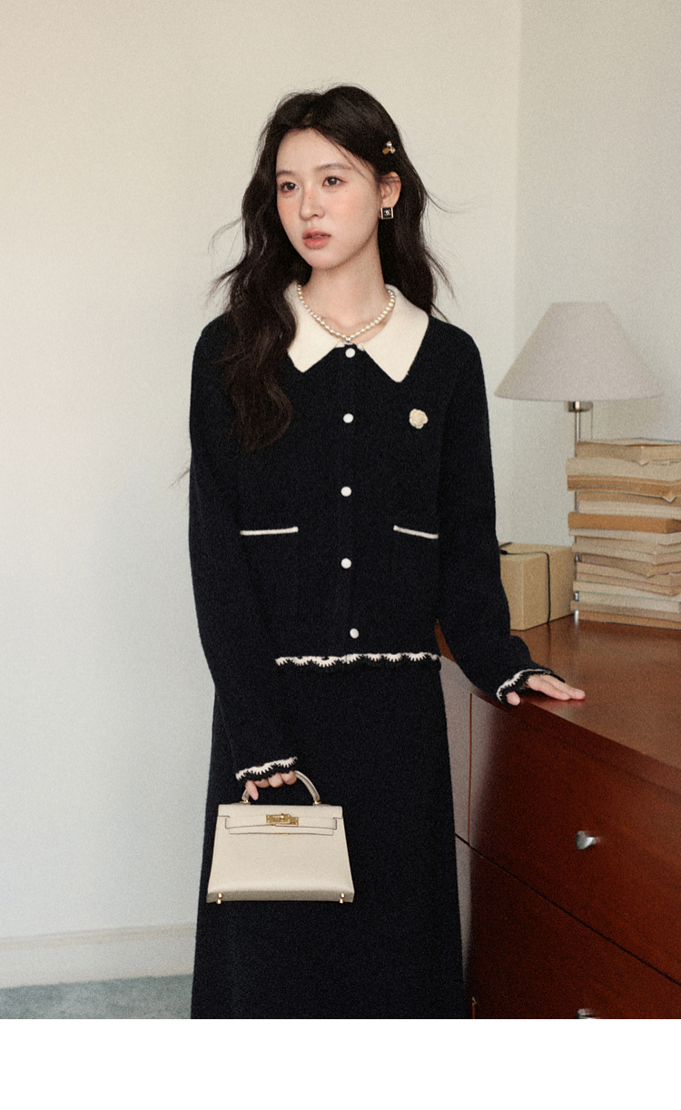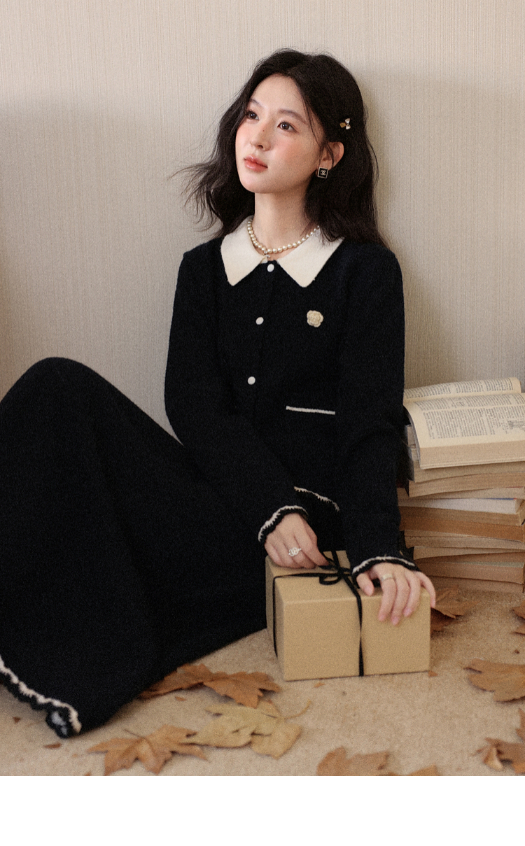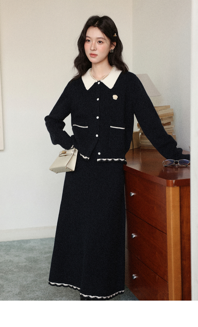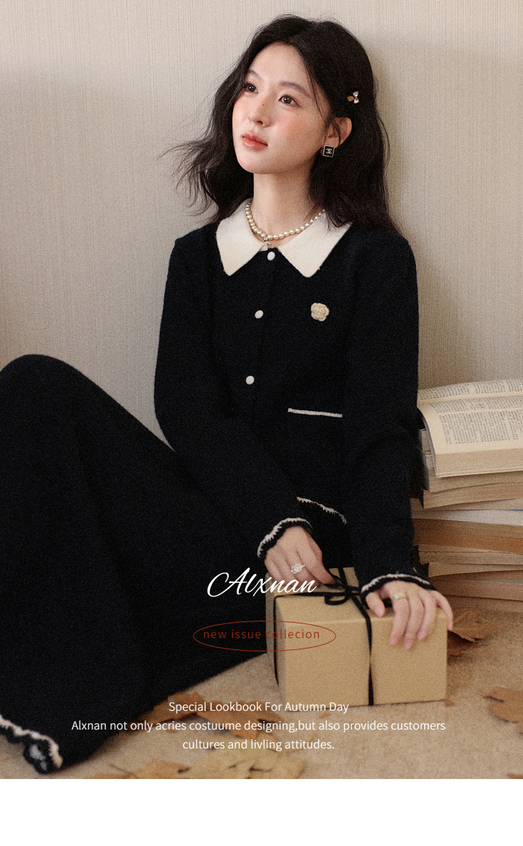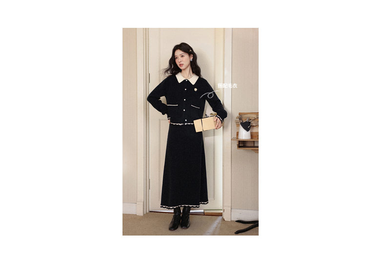 鹿向南「山茶花语」黑色长袖毛衣半身裙两件套女秋冬新款气质套装