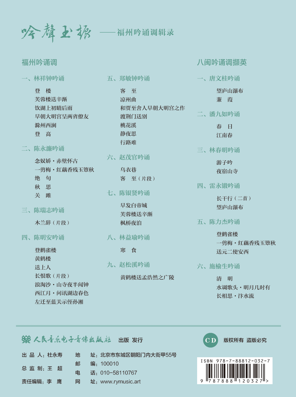 《“吟声玉振”——福州吟诵调辑录》是作者黄晓涛老师自2015年以来先后八次对陈侣白、陈炳铮、林祥钟等八位吟诵者进行采录,共整理200首左右的福州吟诵调,综合考量音质、画面、内容等因素,将其中的33首收入此专辑。因福建方言保留了丰富的中古音,这一地区的吟诵对传统的文白异读有着更高的自觉意识,这对民族文化的挖掘无疑有着重要意义和理论价值。