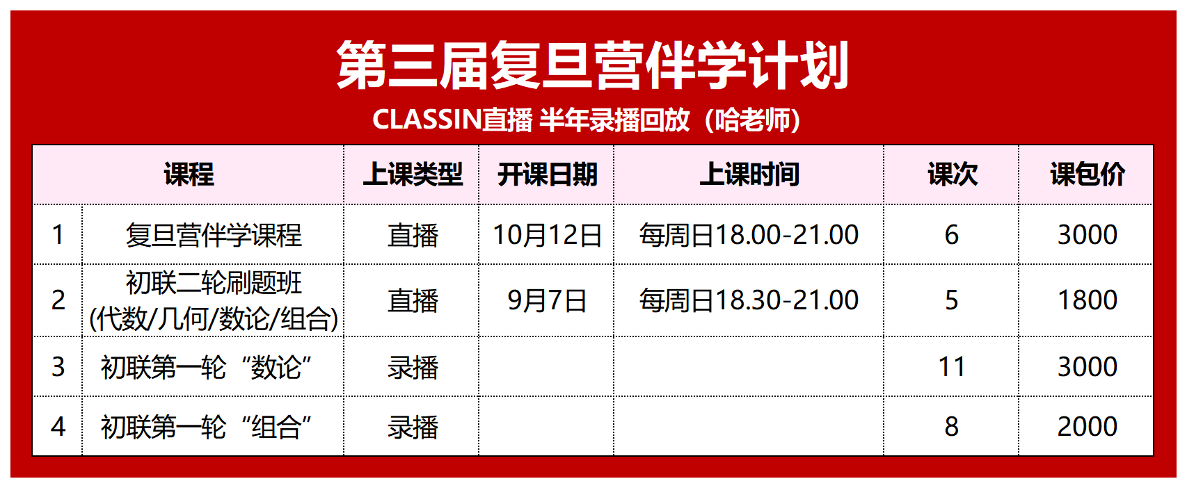 先迅速过完3️⃣和4️⃣,这两门录播课是非常系统的数论和组合课程,能涉及到大部分旦旦营的知识点和考点,至少前铺完全覆盖,然后上2️⃣,进行思维的进一步提升,最后上1️⃣,跟上大部队