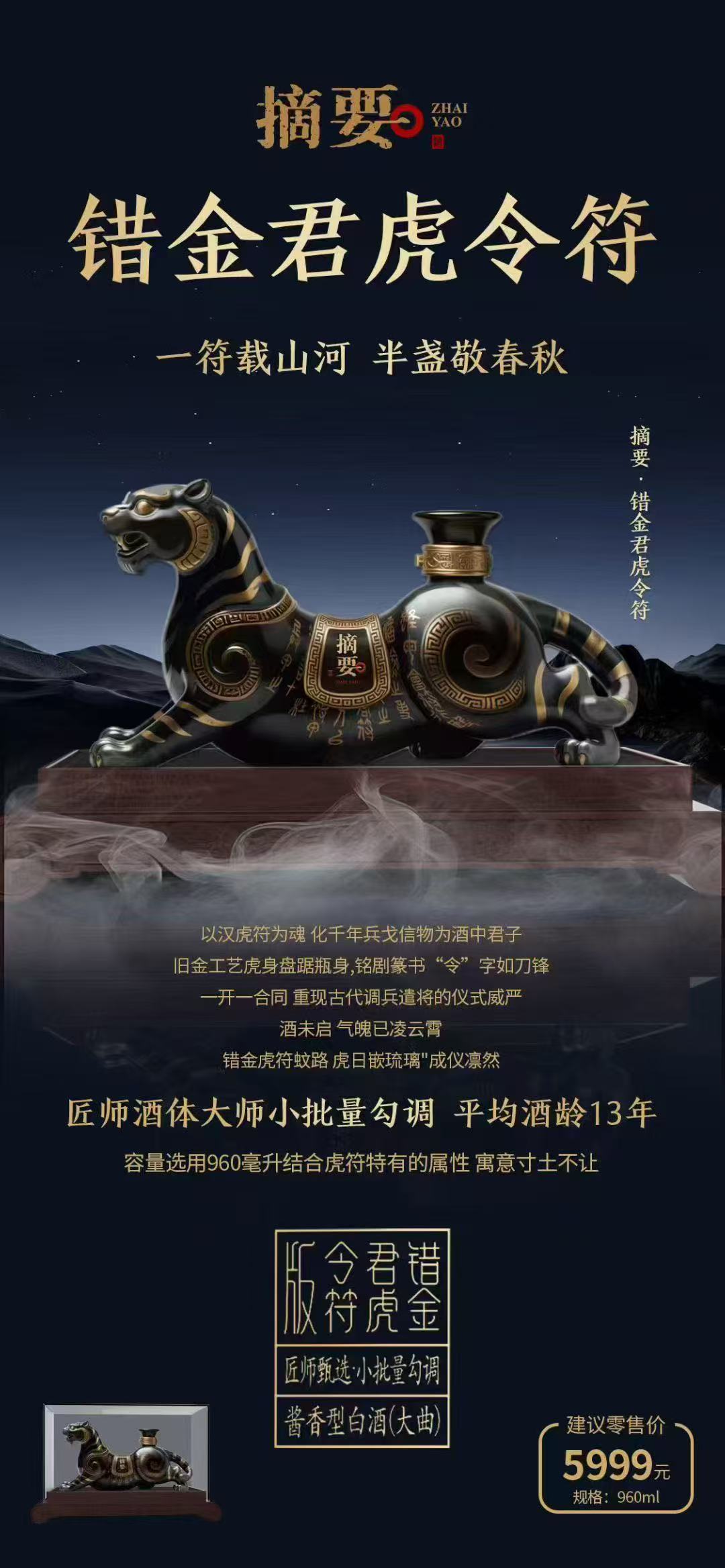 【稀缺收藏】摘要 错金君虎令符 53度 酱香型白酒 960ml*1(含底座+外罩)