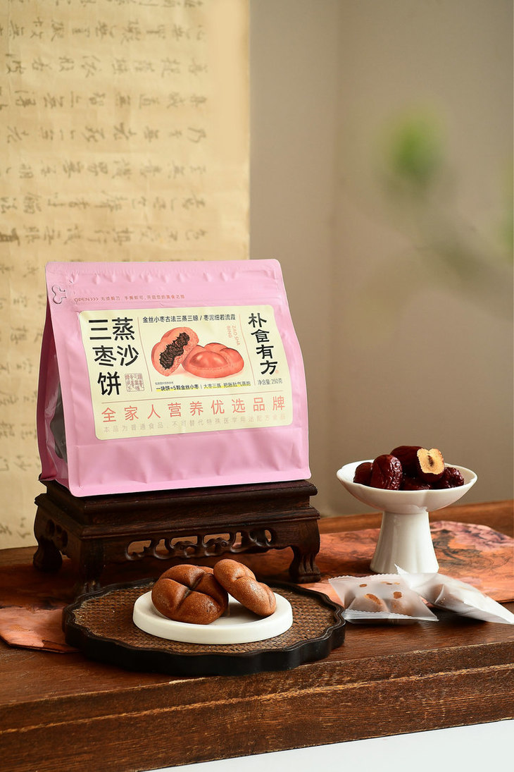 一枚枣沙饼有着5颗金丝小枣的营养, 枣泥含量≥50%,膳食纤维提升40%,铁含量超普通饼干3倍。
