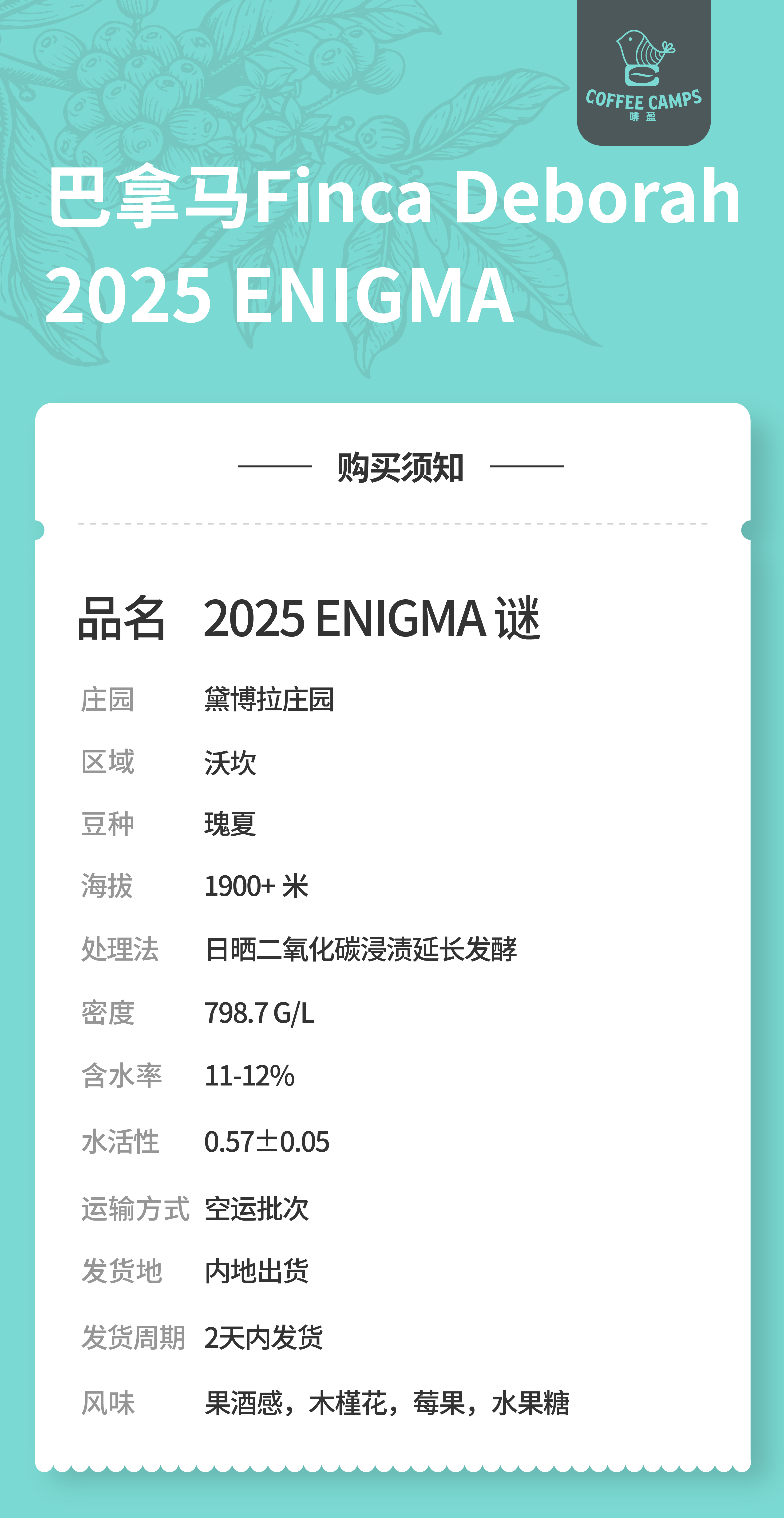 25产季 巴拿马 黛博拉 Finca Deborah 谜 ENIGMA 瑰夏 日晒二氧化碳浸渍延长发酵(生豆)空运批次