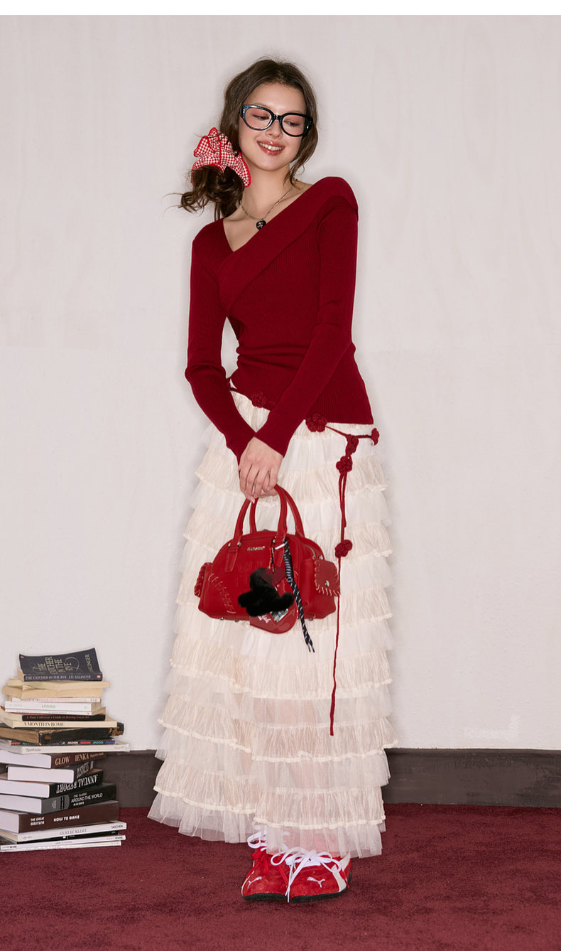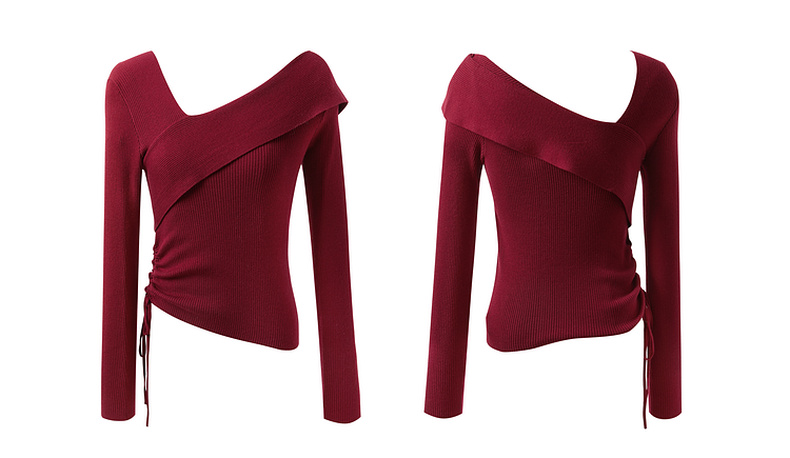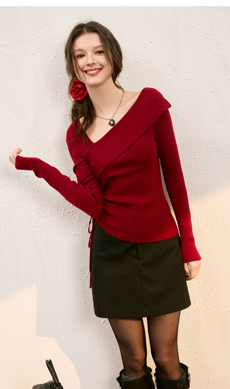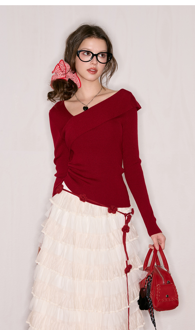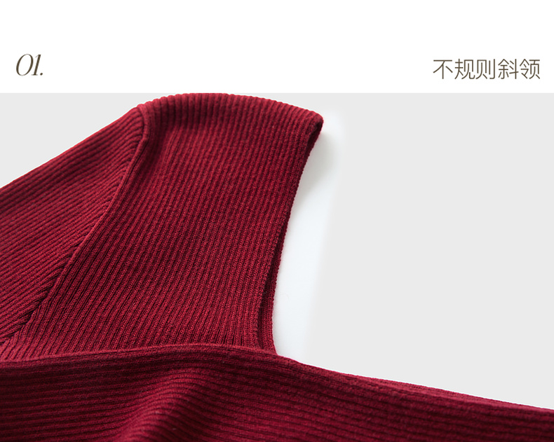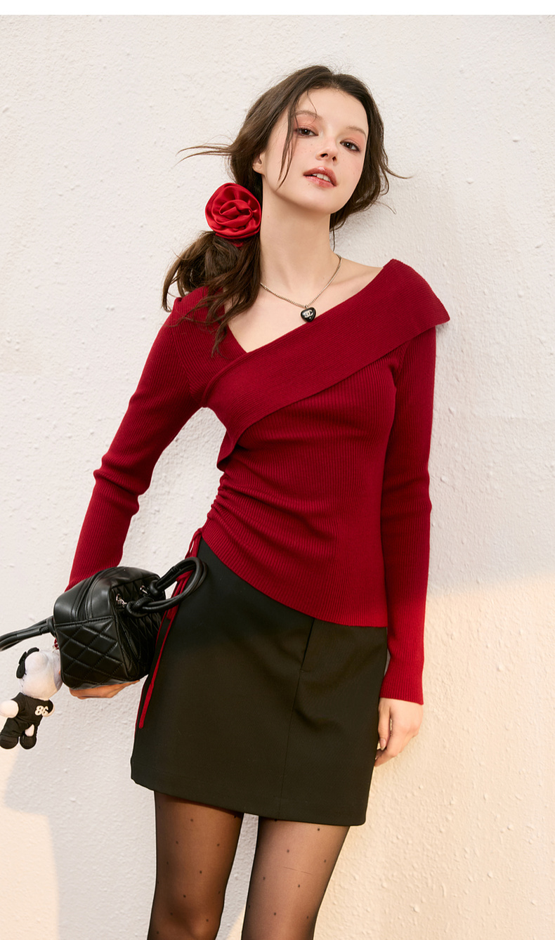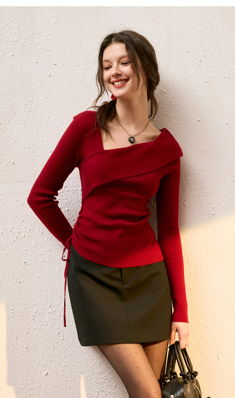 三彩独醒2025秋季新款不规则斜领针织衫设计感毛衫修身打底F