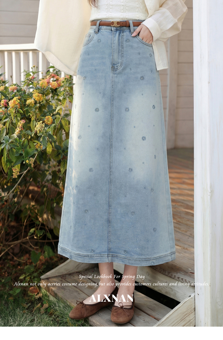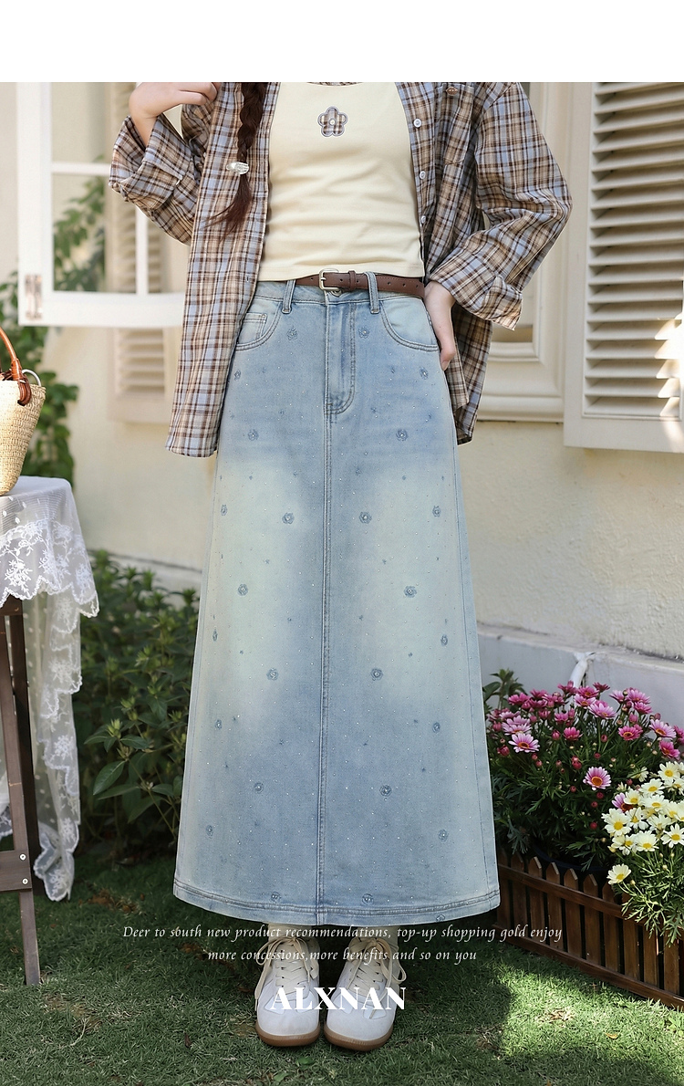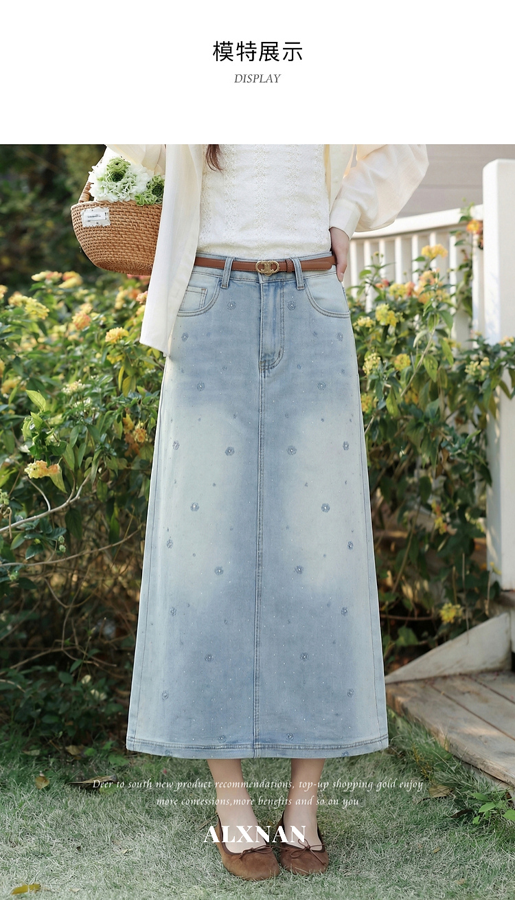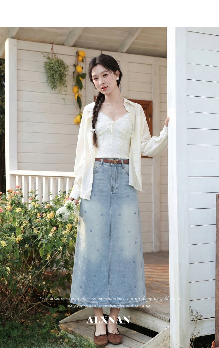 鹿向南「青枝绾裾」蓝色半身裙女夏新款时尚印花设计中长款A字裙
