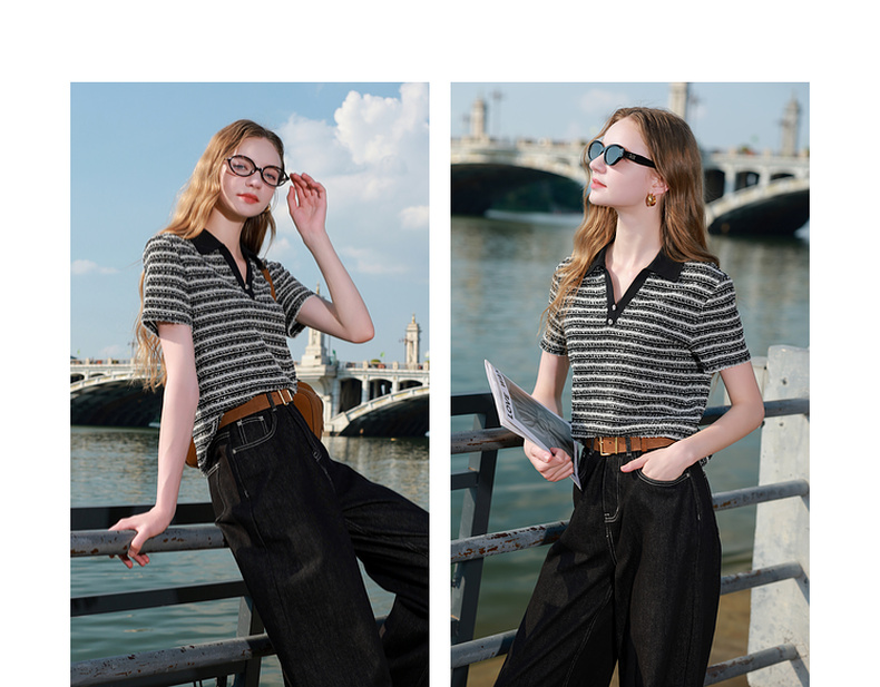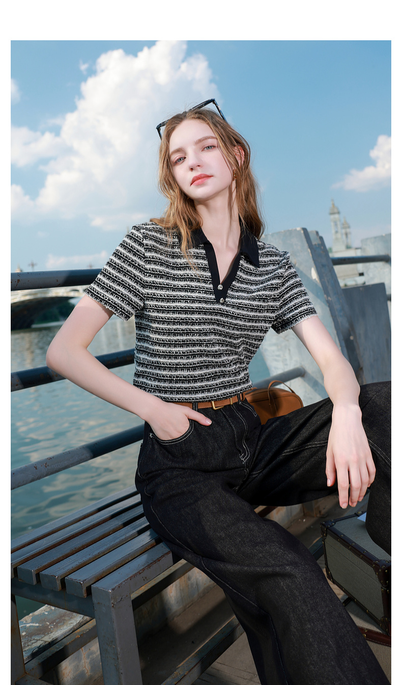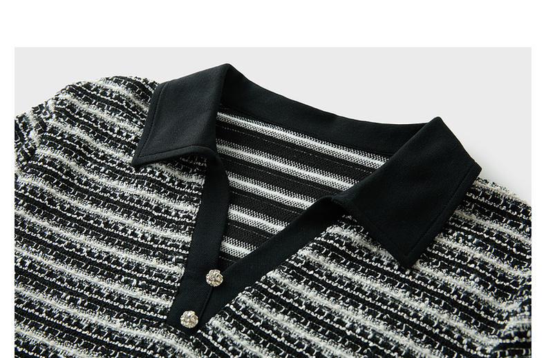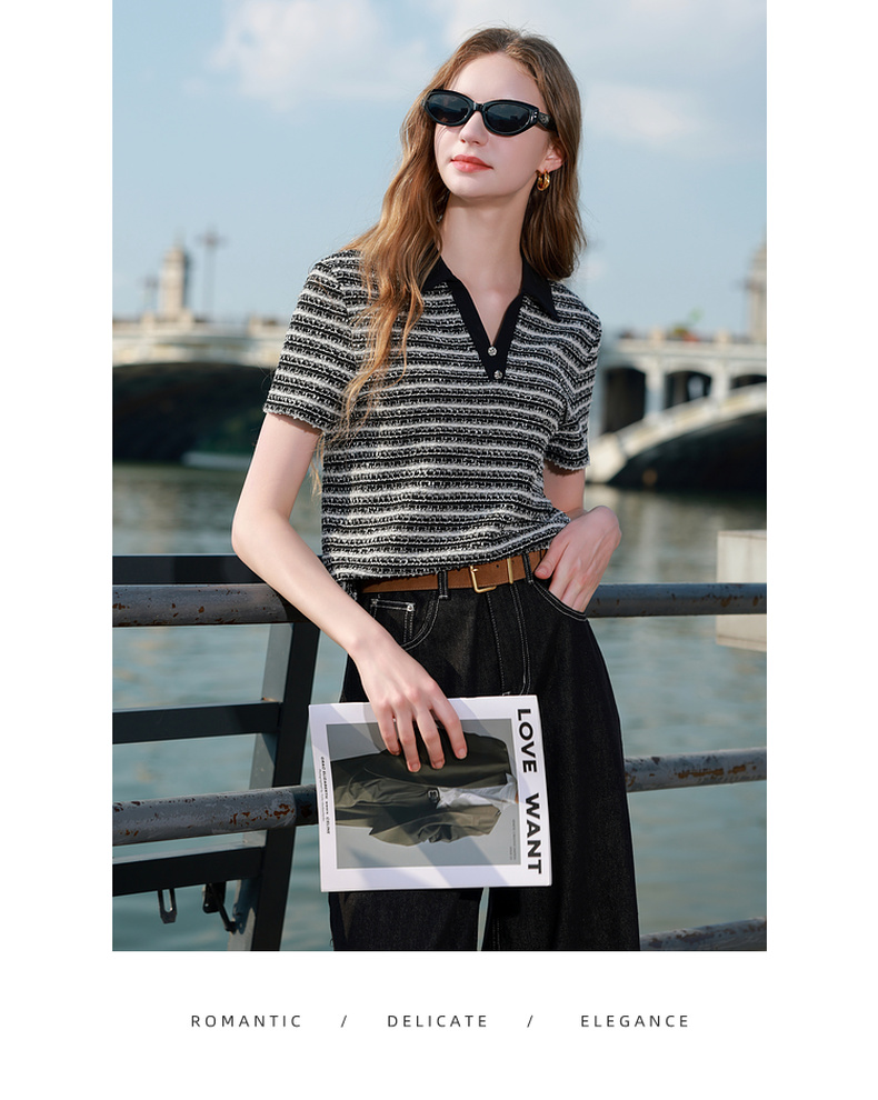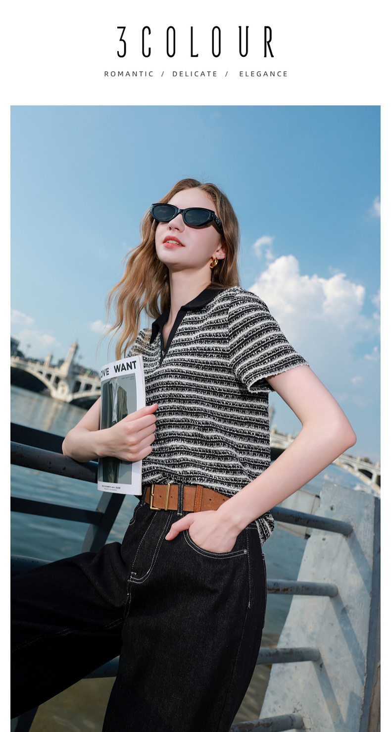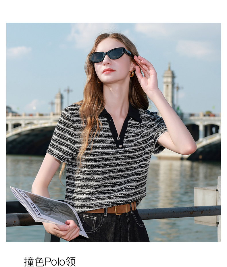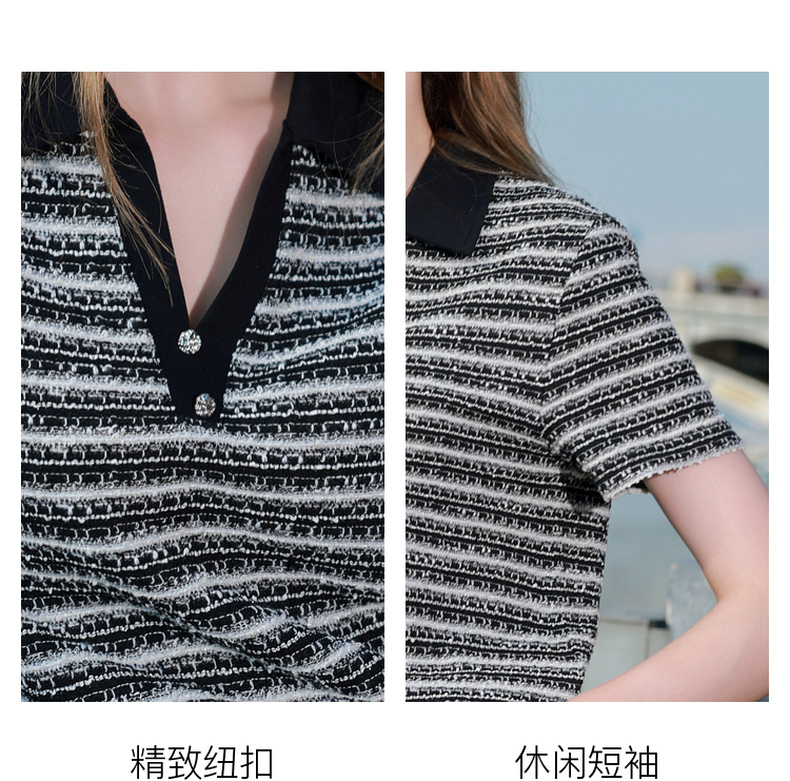 三彩2025秋季新款Polo领撞色条纹T恤香风套头衫短袖上衣气质M