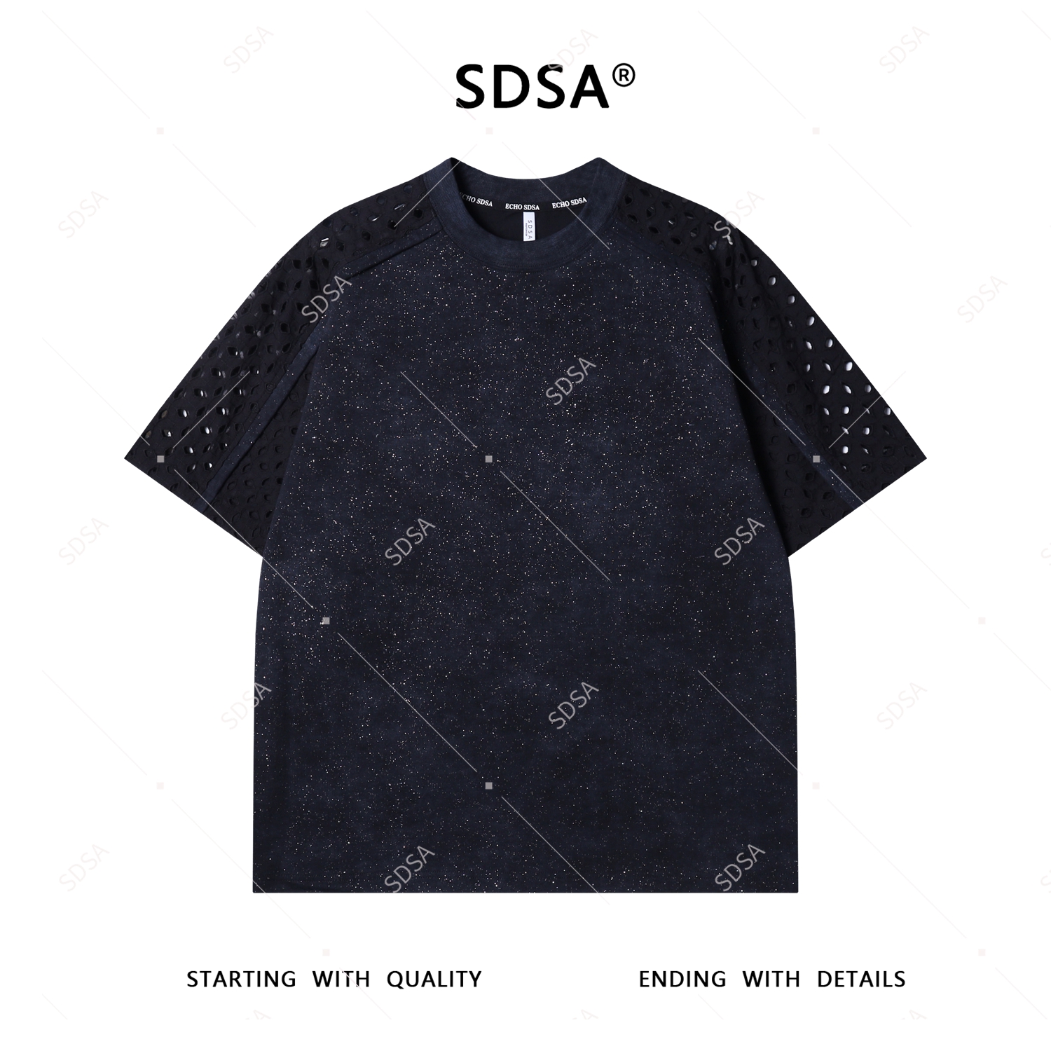 T4147夏季高级感新款男士美式满天星拼接镂空设计短袖T恤时尚圆领上衣