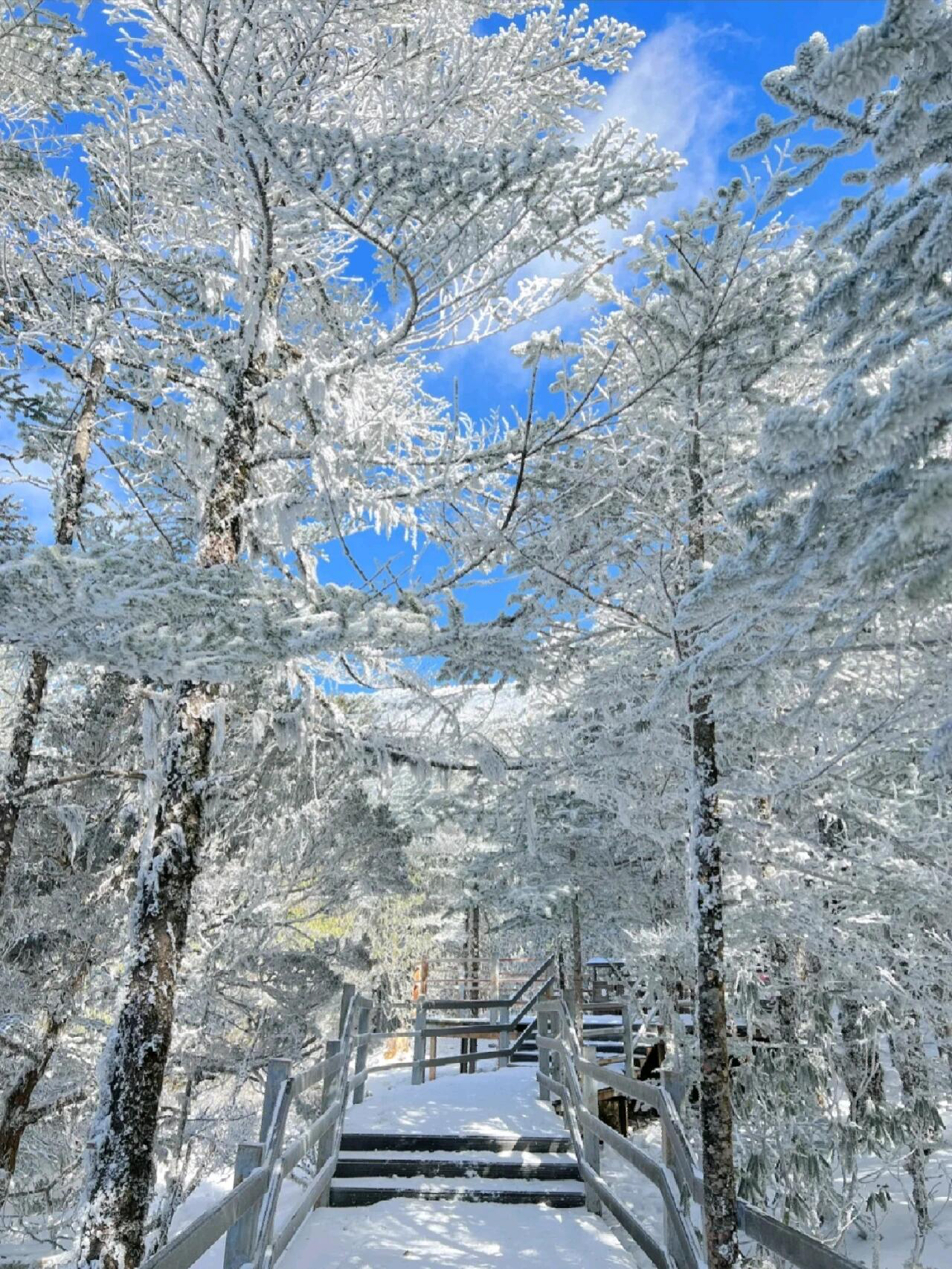 3.下索道后,可根据自身体力选择徒步或继续乘坐下坪子索道,直达更高处的游览起点。看冬季高山湖泊森林、冰瀑奇观等绝佳观赏地。 建议自带简餐或在山腰服务点补给,在高山美景中享用别有风味。