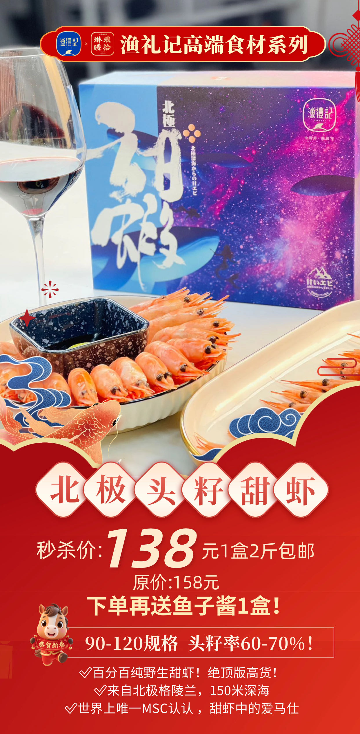 【顺丰冷链】渔礼记北极头籽甜虾2斤/盒 90-120规格 超高头籽率 100%纯野生 世界MSC认证 甜虾中的爱马仕 - AYLJ