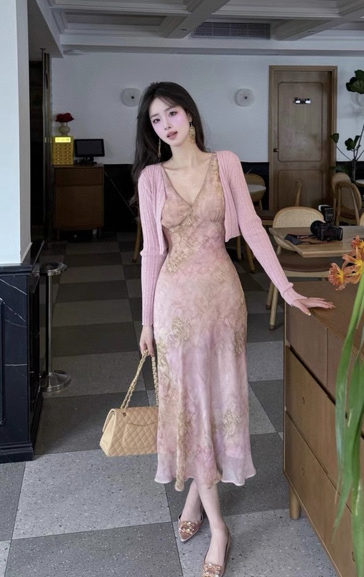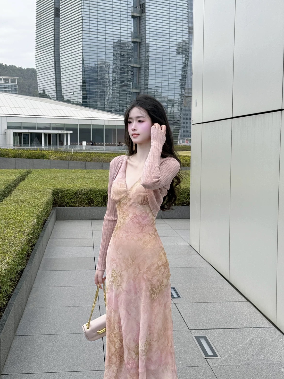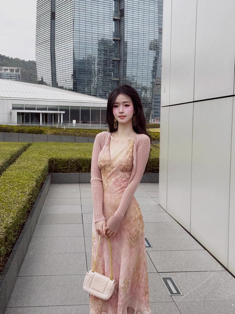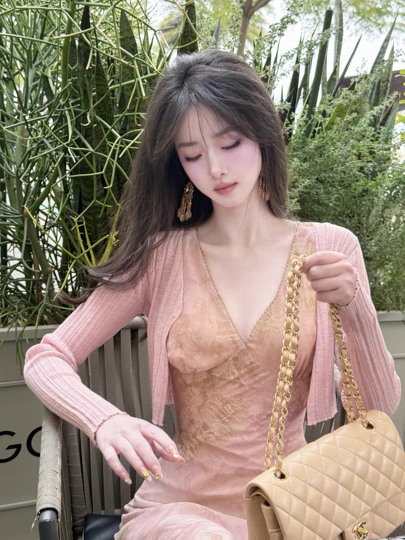 纪*希 凝脂芙蓉温柔显白斜裁显瘦V领连衣裙+披肩两件套