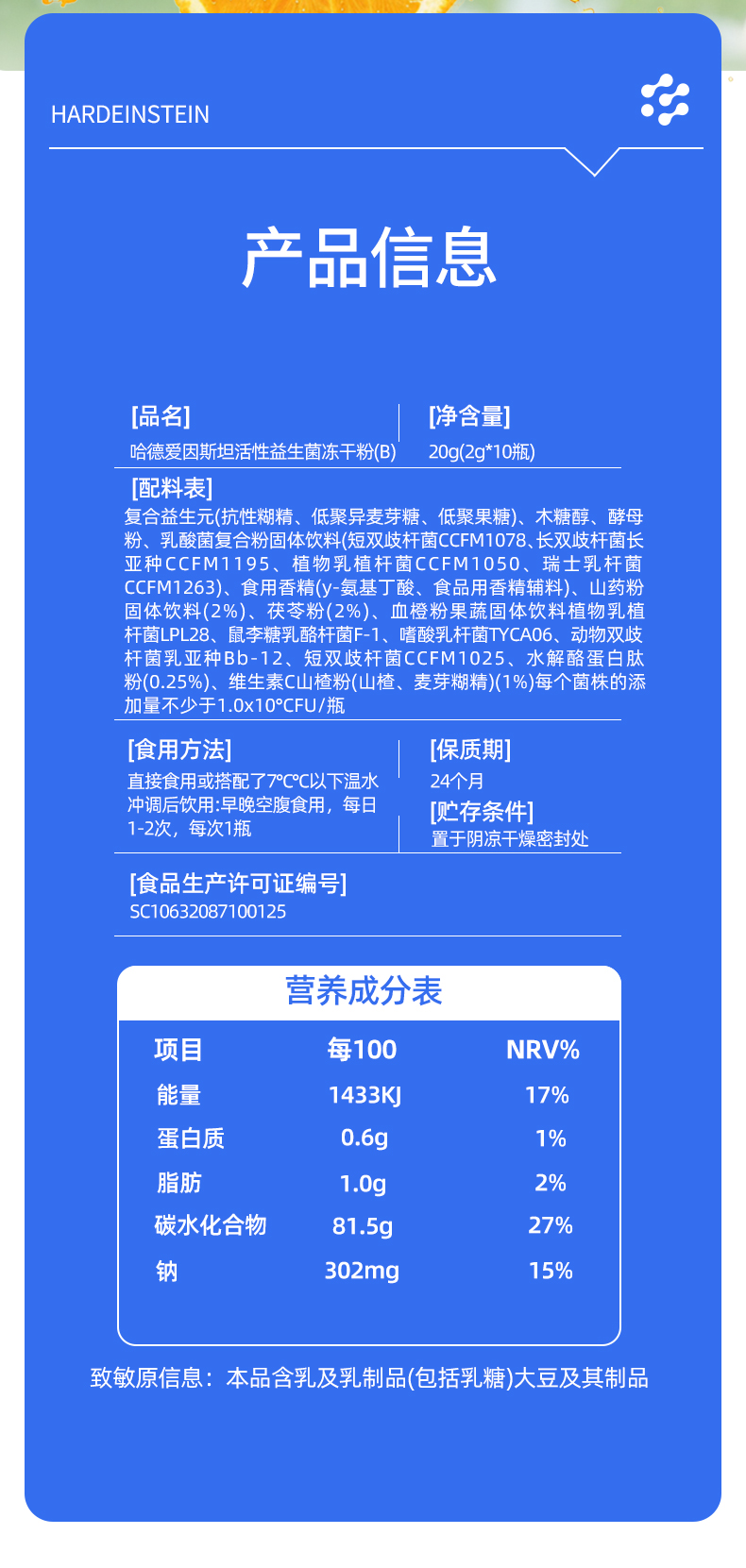 哈德爱因斯坦活性益生菌冻干粉3000亿活性益生菌添加乳酸菌冻干粉营养小蓝瓶 20g*1盒(男童专用款)
