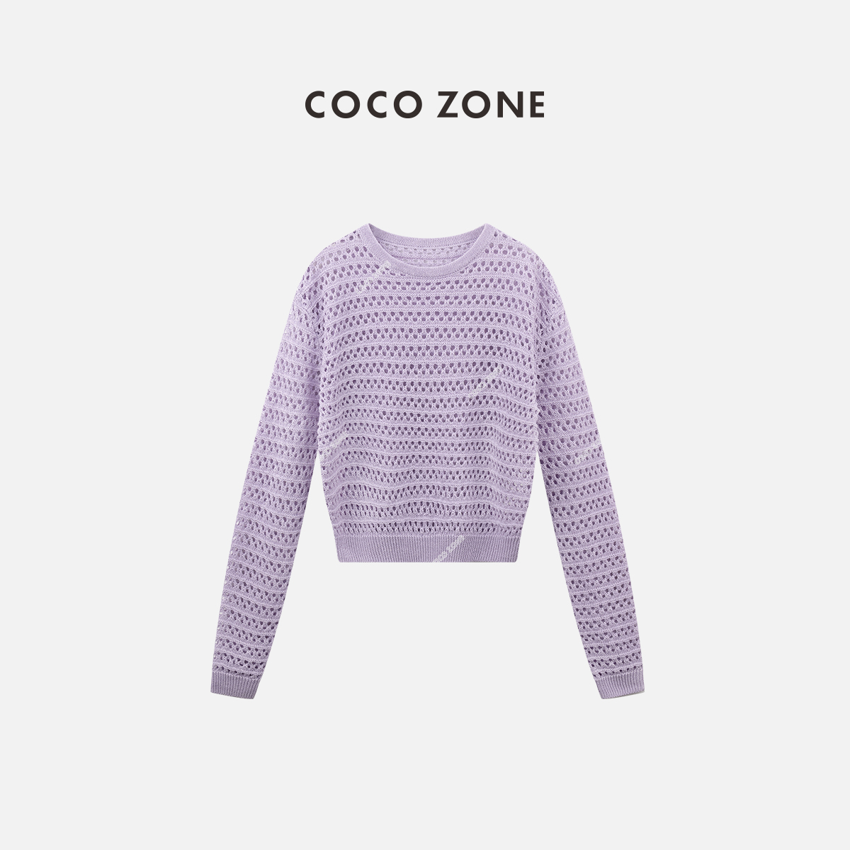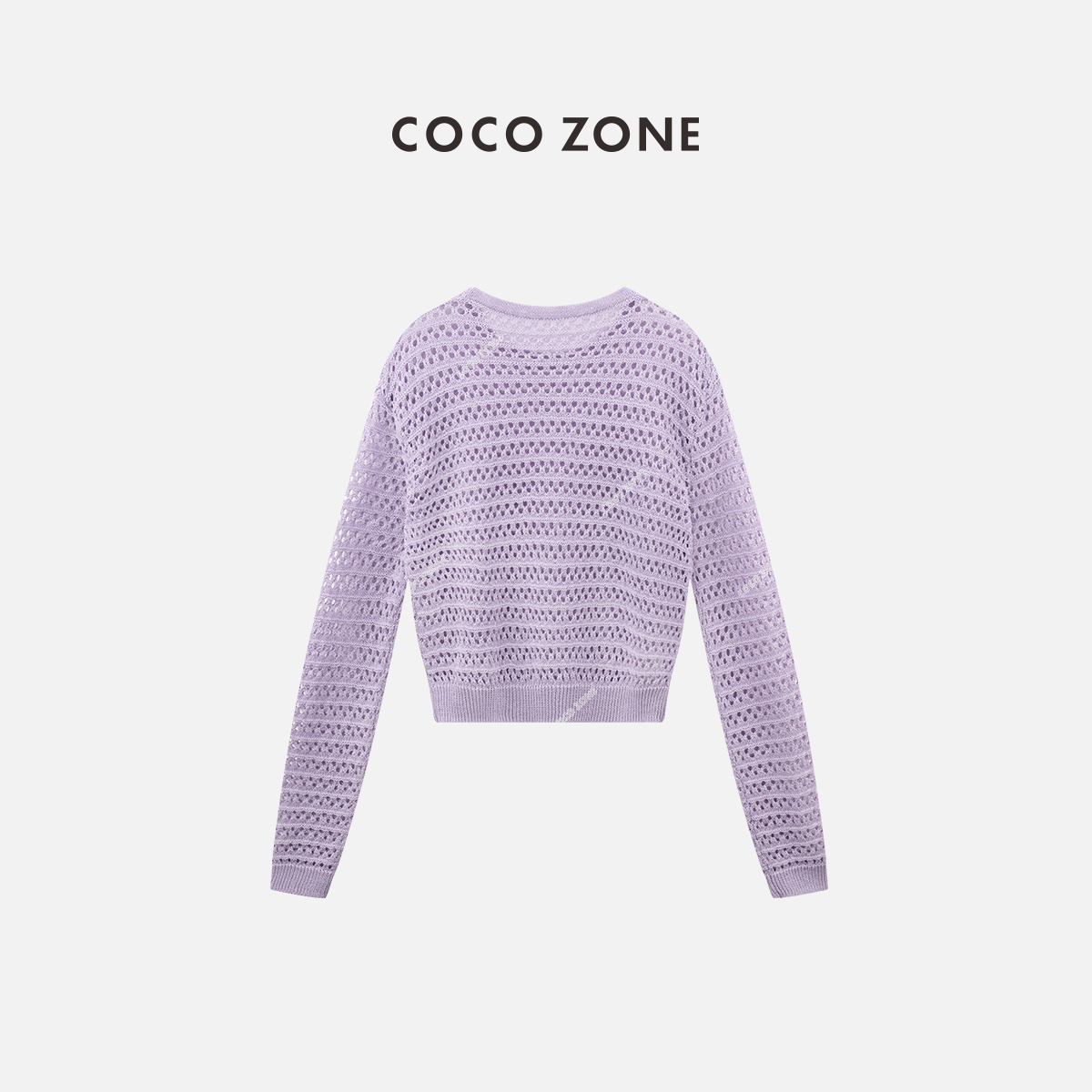 COCO ZONE2024春季百搭圆领镂空针织衫纯色长袖上衣CC1A0612