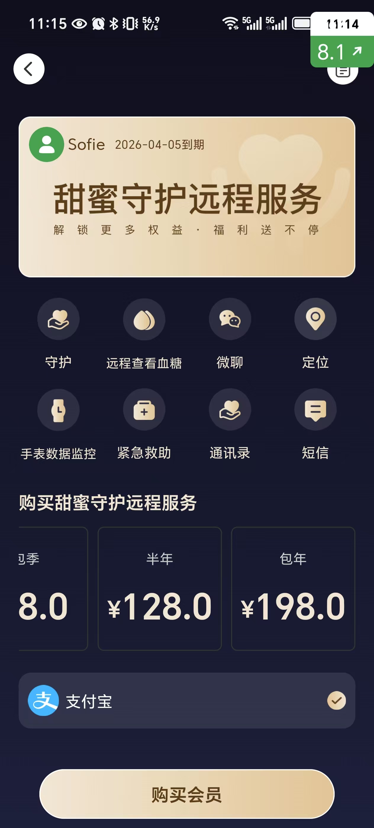 会员权益可以享受:远程查看血糖,远程定位,远程查看手表信息,家长助手一键控制手表软件,对手表进行远程操控