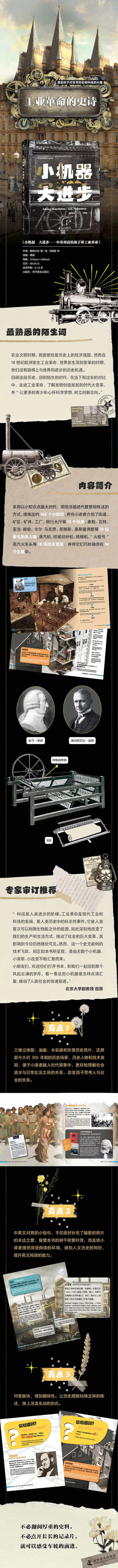 本书通过14个主题向小读者介绍了距今大约300年前,世界工业化、现代化的起源——工业革命。从小机器——蒸汽机、纺纱机、梳棉机等机器的出现;到家庭结构和住所的新变化;到新行业——煤矿业、银行业和国际贸易的产生;到新的社会阶层——无产阶级和资产阶级的出现;再到大城市改造、社会运动的兴起等。全面梳理出近百年间的科技、经济、政治、文化、社会生活等各个领域的新事物、新思想、新变化。