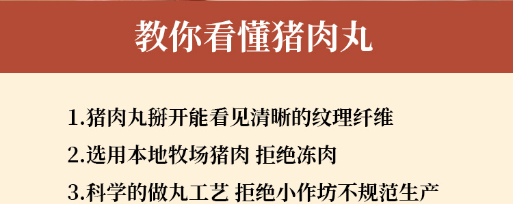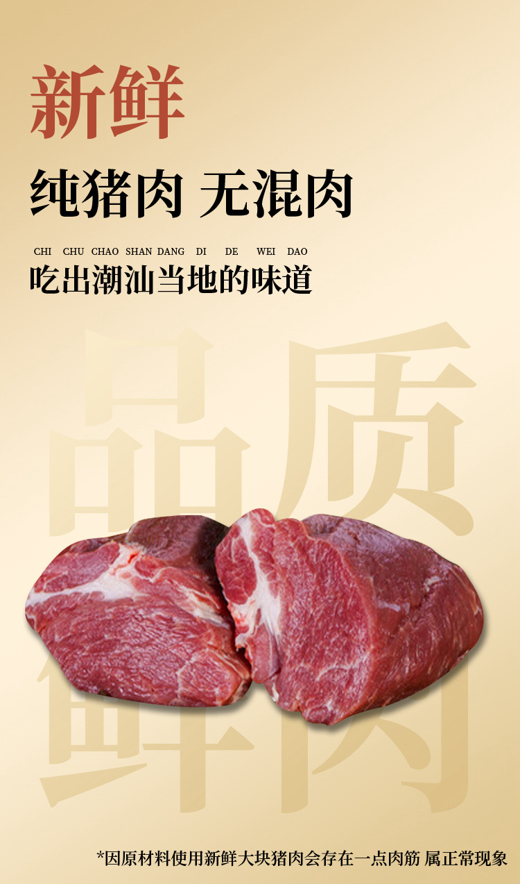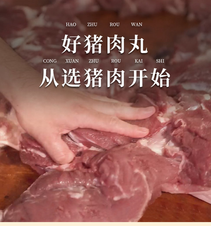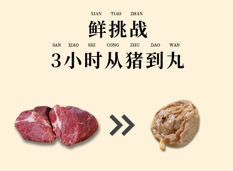 龙晖猪肉丸,是由鲜猪肉制作,拒绝劣质猪肉、鸡肉等来鱼目混珠,原料优秀,吃起来才更放心!每天凌晨,负责人都会亲自前往屠宰场,凭借多年的经验特别挑选后腿肉的部分,肉质更加紧实鲜美。选好的猪肉会迅速送往工厂,在16℃的恒温环境下,被悬挂自然冷却后进行细致的“精修”,10斤的猪肉在剔除筋膜和油脂后,往往只剩下8斤,这才保证了猪肉丸的美妙口感。修好的猪肉再由经验丰富的师傅不断地捶打直至其变成细腻的肉糜。在此过程中,师傅还需要密切观察猪肉的变化,并适时用沙冰调节浆体的温度,确保在捶打过程中肉不会被“打熟”。捶打完成后,将肉糜从虎口挤出,形成小肉团,放入约70℃的温水中进行定型,再捞入沸水大锅中统一煮熟。经过这一系列的精心制作,一颗颗Q弹鲜美的猪肉丸,就终于诞生了!制作全程,0香精0防腐0色素,通过各项检测!