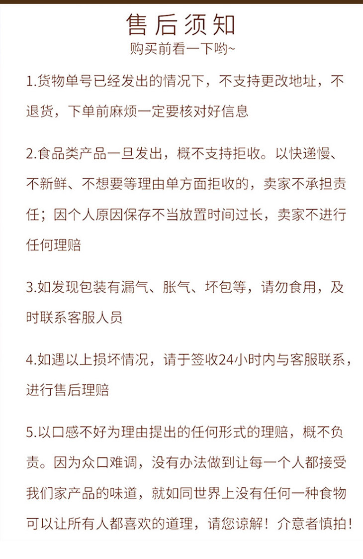 温馨小提示:品牌是现做现发,产量不多,所以不接急单哦!不过这样到手的也更新鲜好吃啦!天气炎热,大家注意收货地址并及时签收,避免吃不到新鲜美味!食品类不支持七天无理由退换或拒收,介意慎拍。