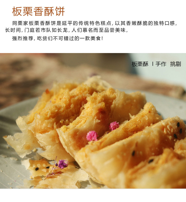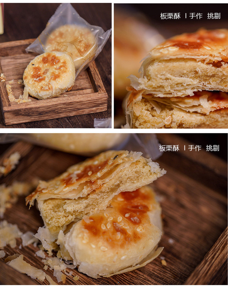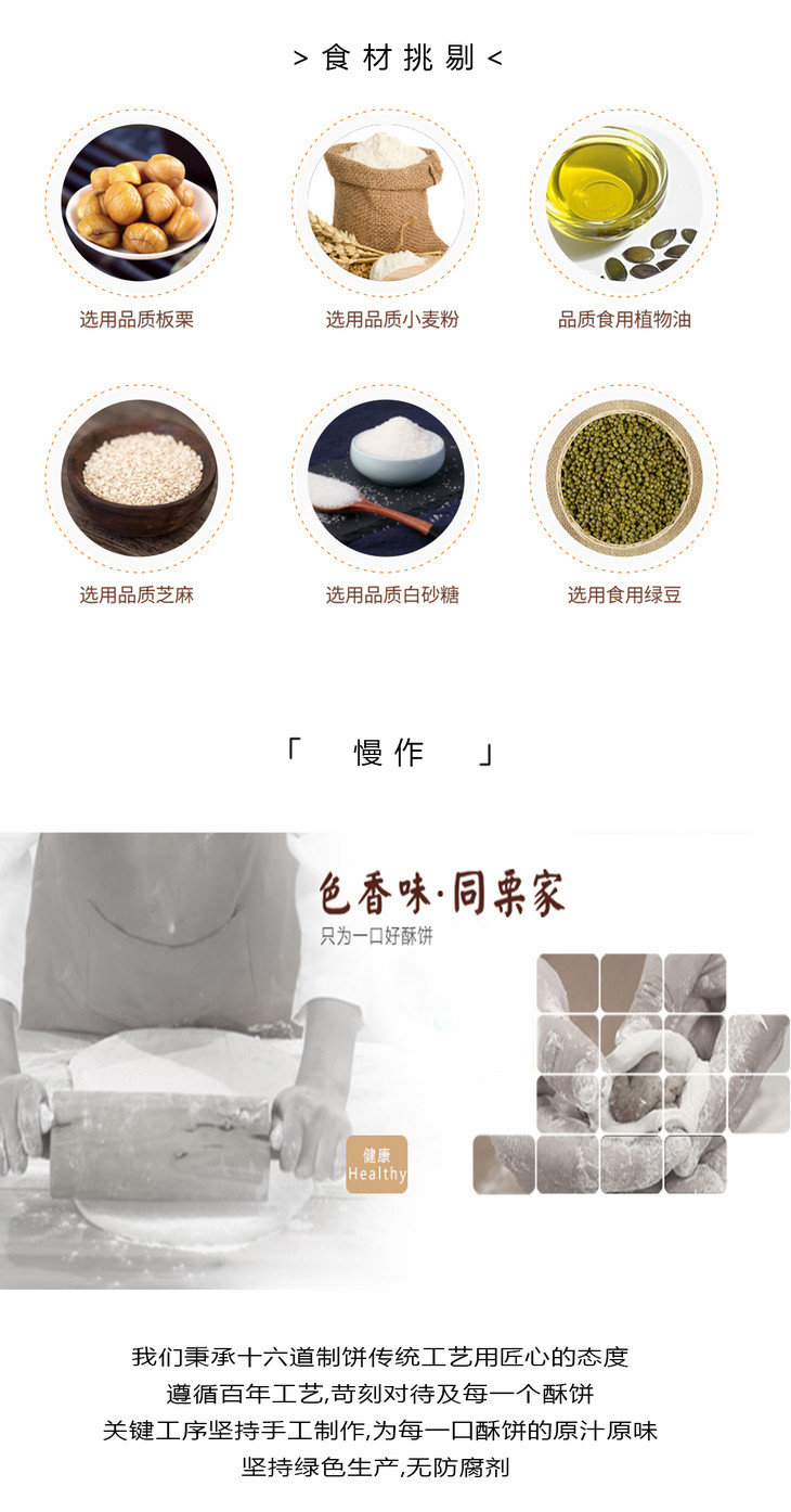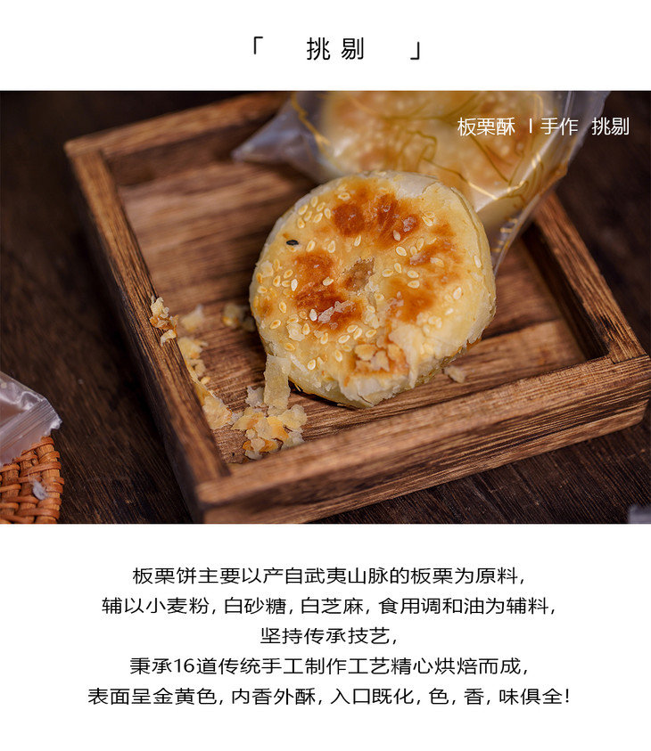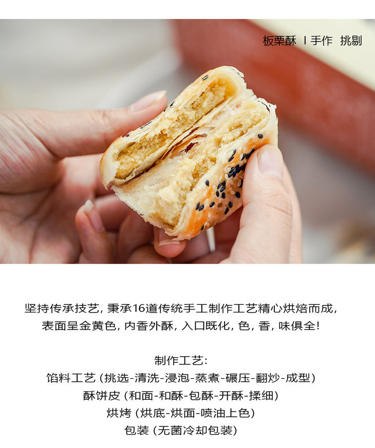同栗家的板栗饼,传承祖辈配方,选用武夷山脉的高山板栗为原料。武夷山脉海拔高达1000米左右,这里有着原始无污染的生态环境,由此长成的板栗个头圆润饱满,口感清甜,用来制作板栗酥甜而不腻,回味有余香。然后辅以小麦粉、白砂糖、白芝麻、食用调和油为辅料,秉承百年传承的技艺,依照16道传统工序,手工制作完成每一块板栗饼!表皮的酥软,离不开反复揉捏,这样压出来的饼才能又香又酥,入口即化。为了健康考虑,还特地调整了配料比例,减少了糖和油的使用量,让整个板栗饼香而不腻,甜而不腻。每天现做,当天发出,没有任何添加剂,保证尝到的每一口,都新鲜健康,原汁原味!