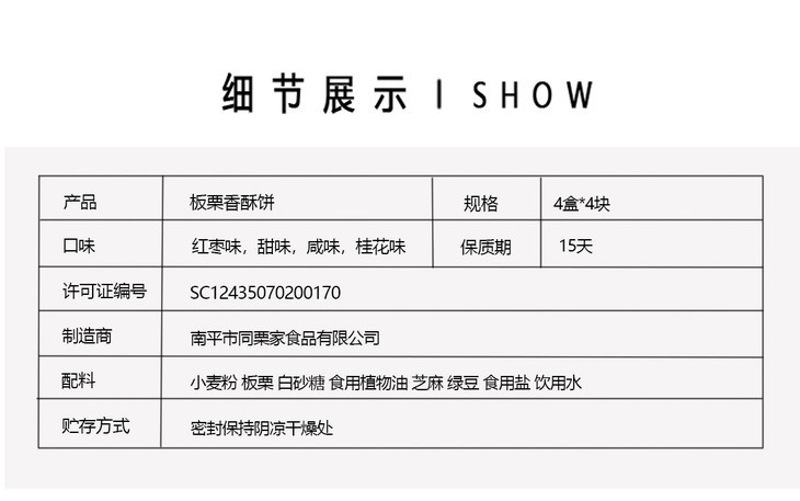 来上板栗酥咯,是福建南平百年老店同栗家的,配料表十分干净,无添加剂、防腐剂,板栗用料超过20%,入嘴就是浓浓香,甜度也正正好,还有四个口味!