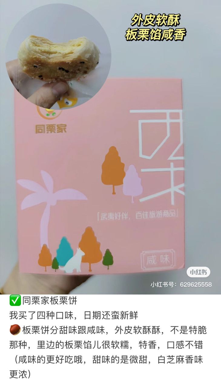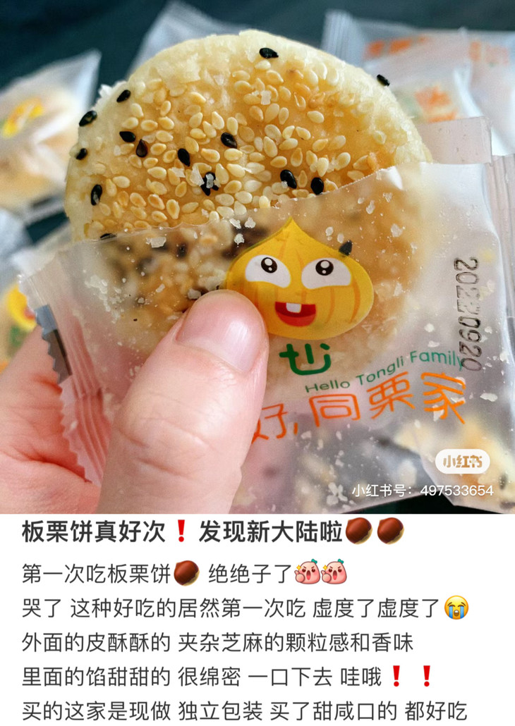 和街边单一口味的糕点不同,同栗家板栗饼有甜味、咸味、桂花味和红枣味,外皮金黄酥脆,板栗内馅粉面香甜,顶部还有零星芝麻粒增添香味,一抿即化,软糯甜美,带着芝麻香、桂花香或是红枣的甜香,偶尔想吃小咸点心还有咸味可选,真的都很好吃!