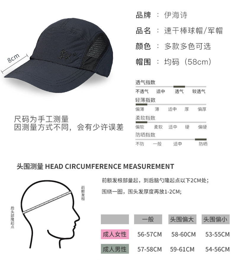 EX2伊海诗 男女款 棒球帽速干遮阳帽轻薄运动防晒鸭舌帽 365113