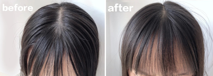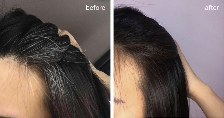 一段时间后,原本肉眼可见的白色头皮,被新长的头发盖住了,鬓边的白发也黑了。