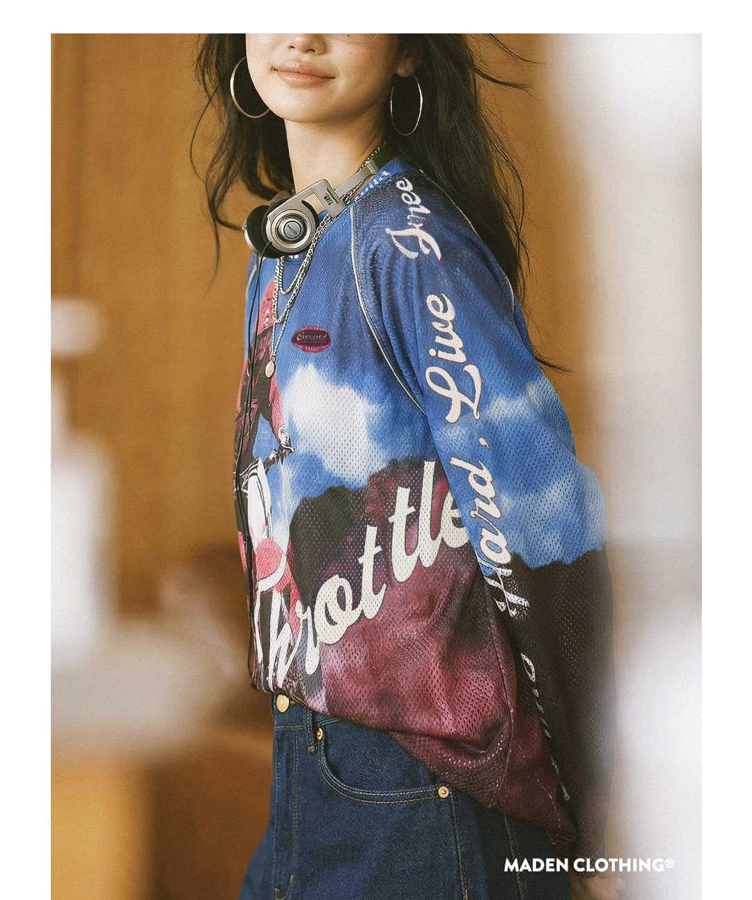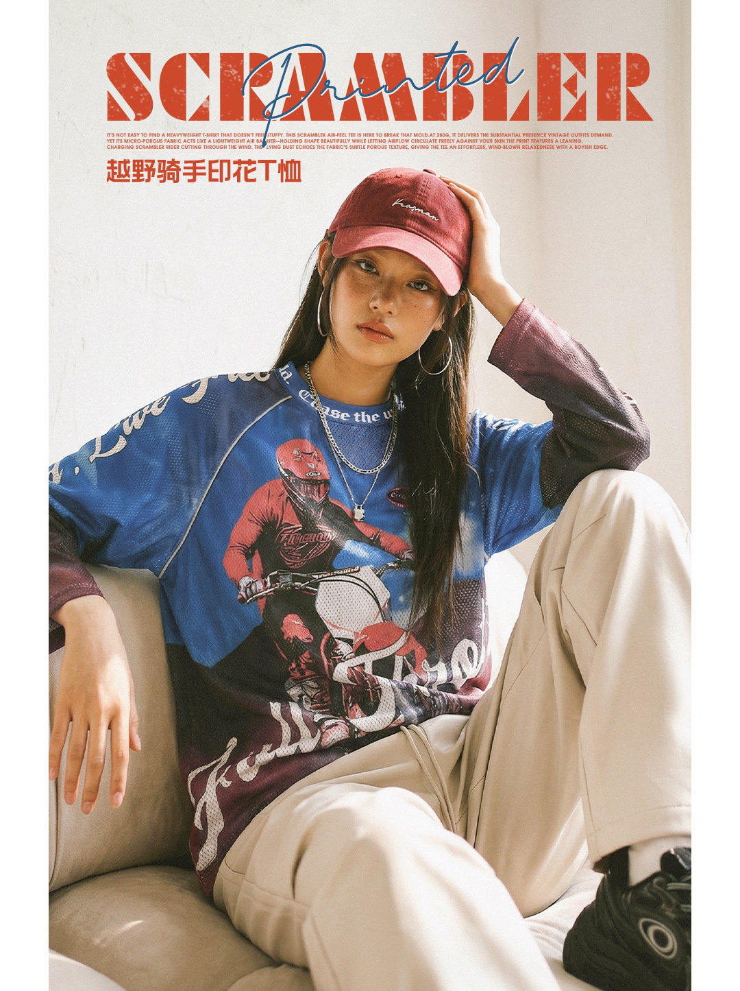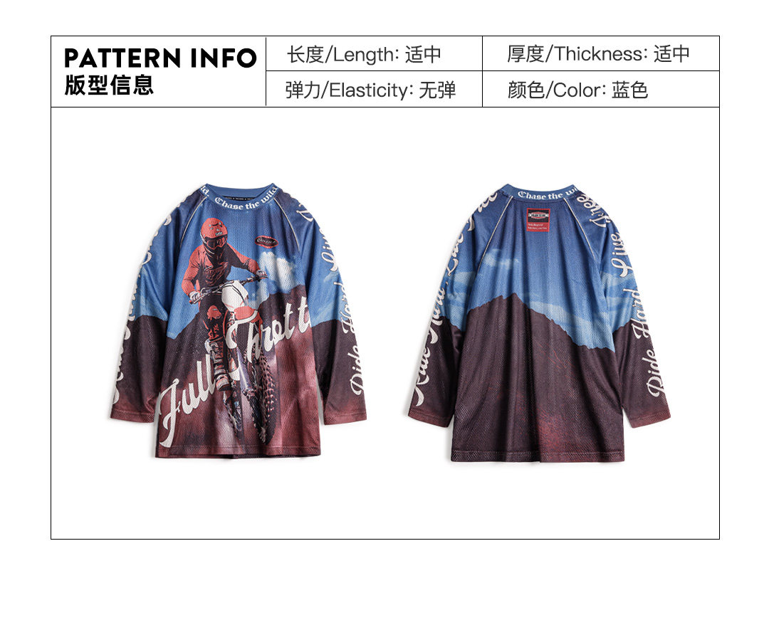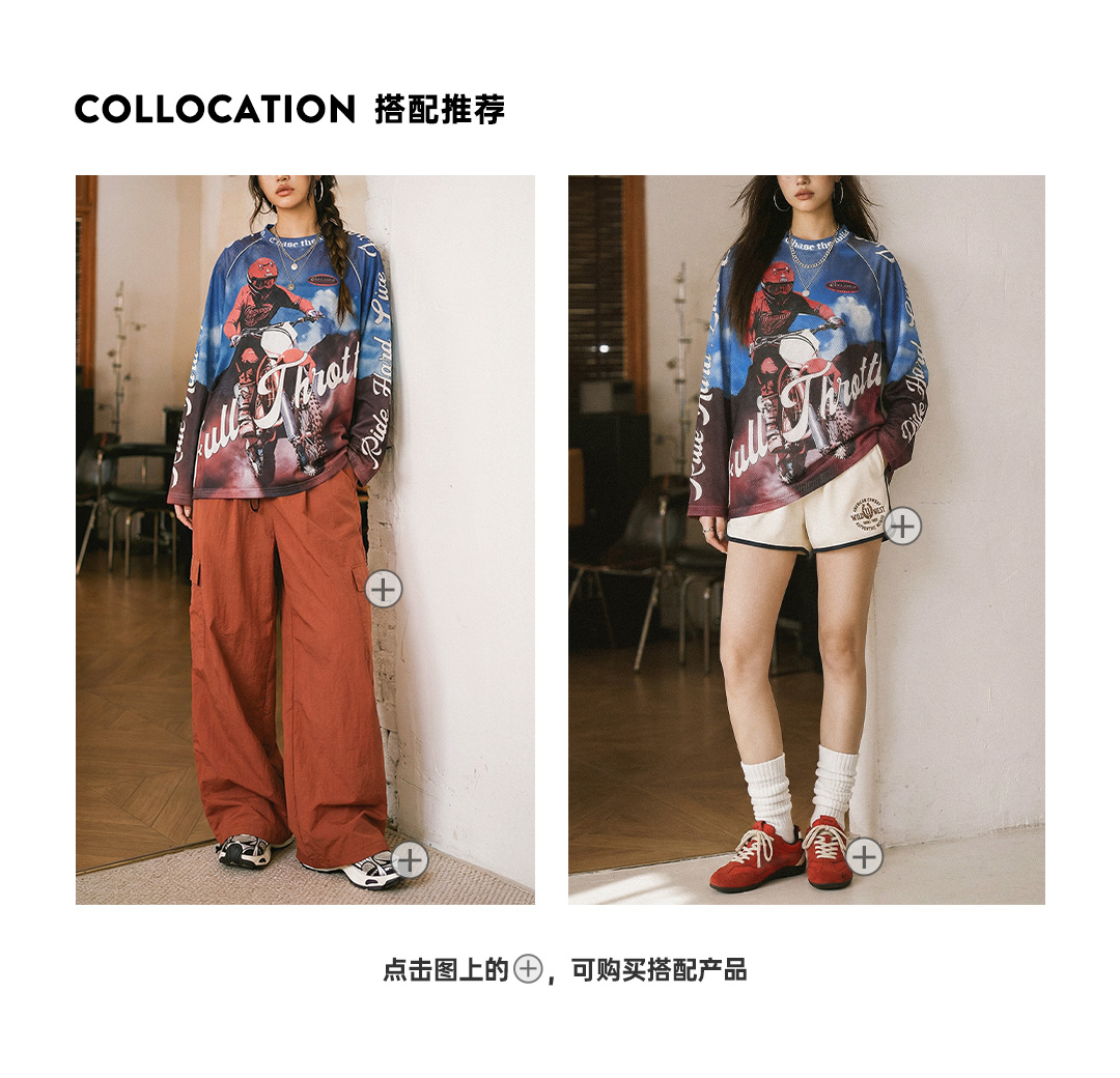 马登美式复古针织满印花长袖T恤薄款宽松立领套头外穿上衣女士春