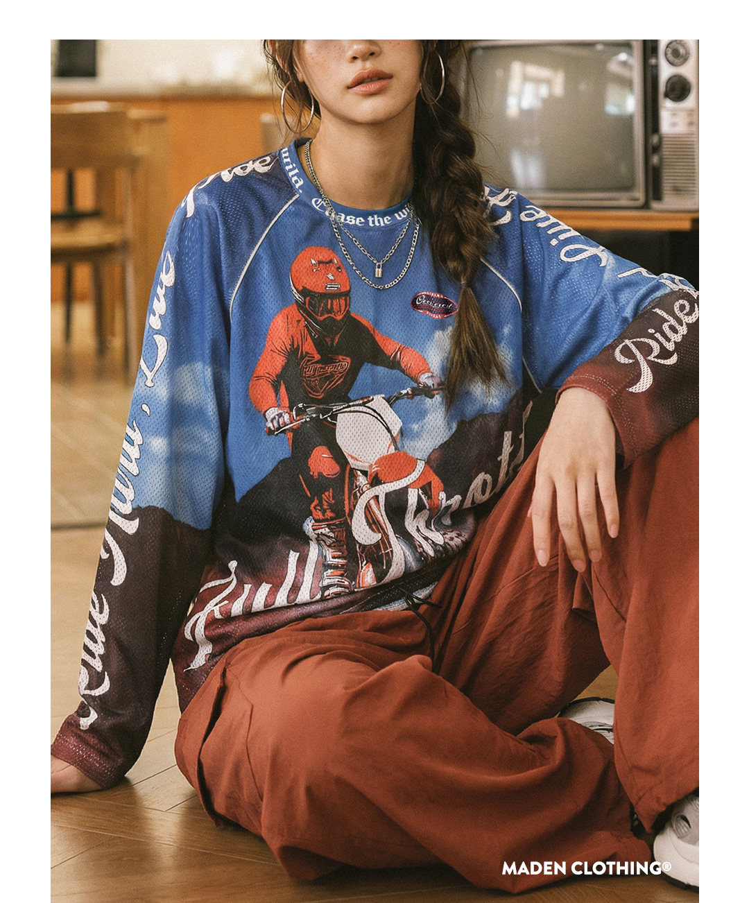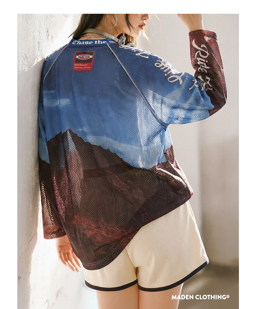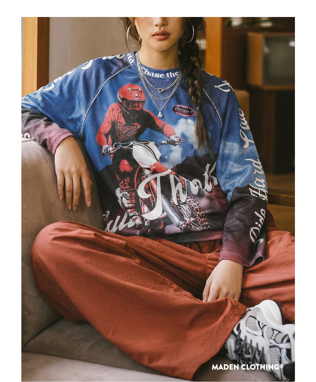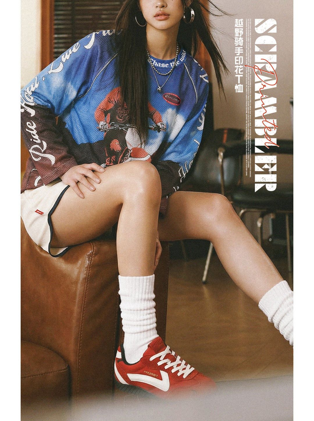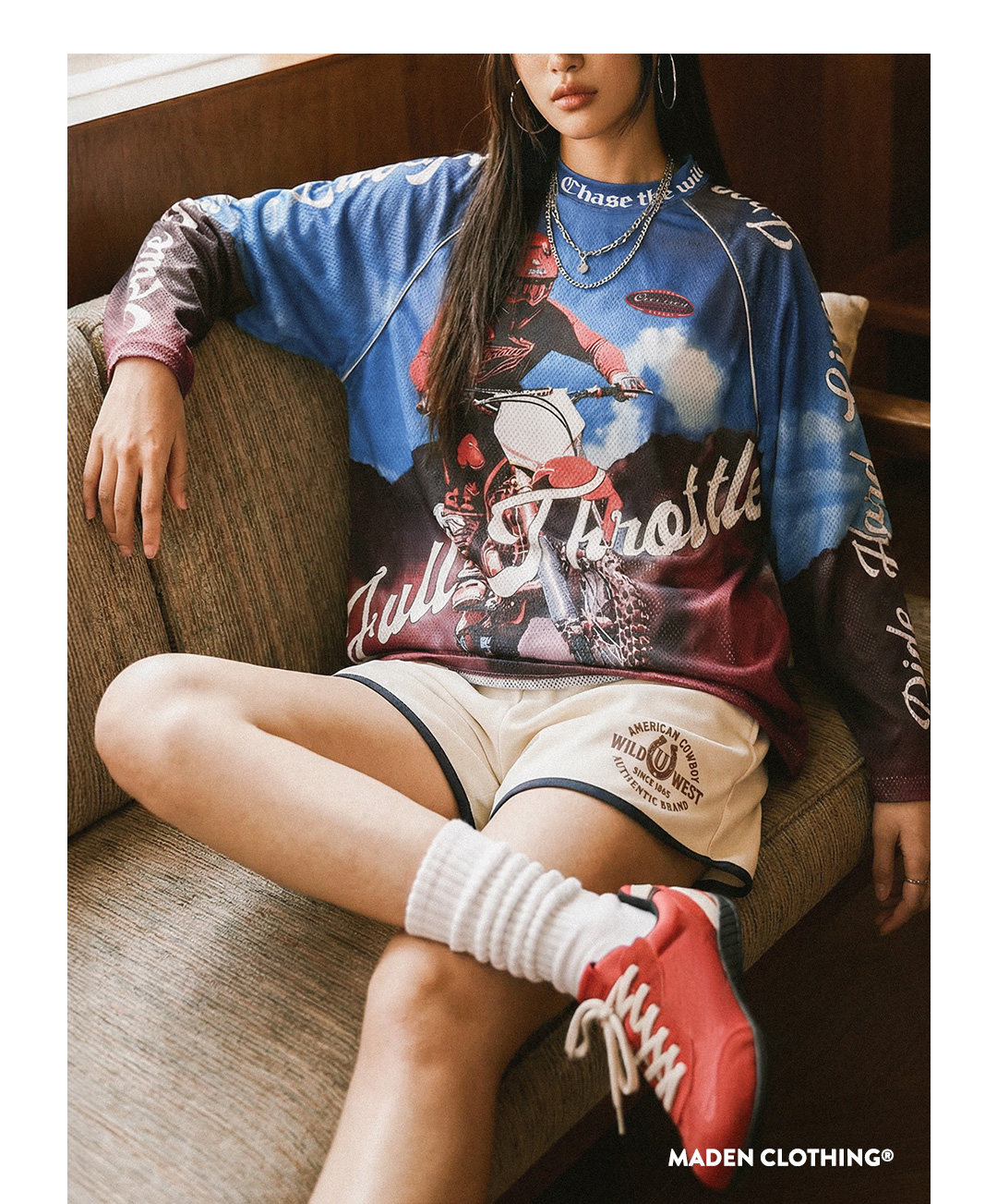 马登美式复古针织满印花长袖T恤薄款宽松立领套头外穿上衣女士春