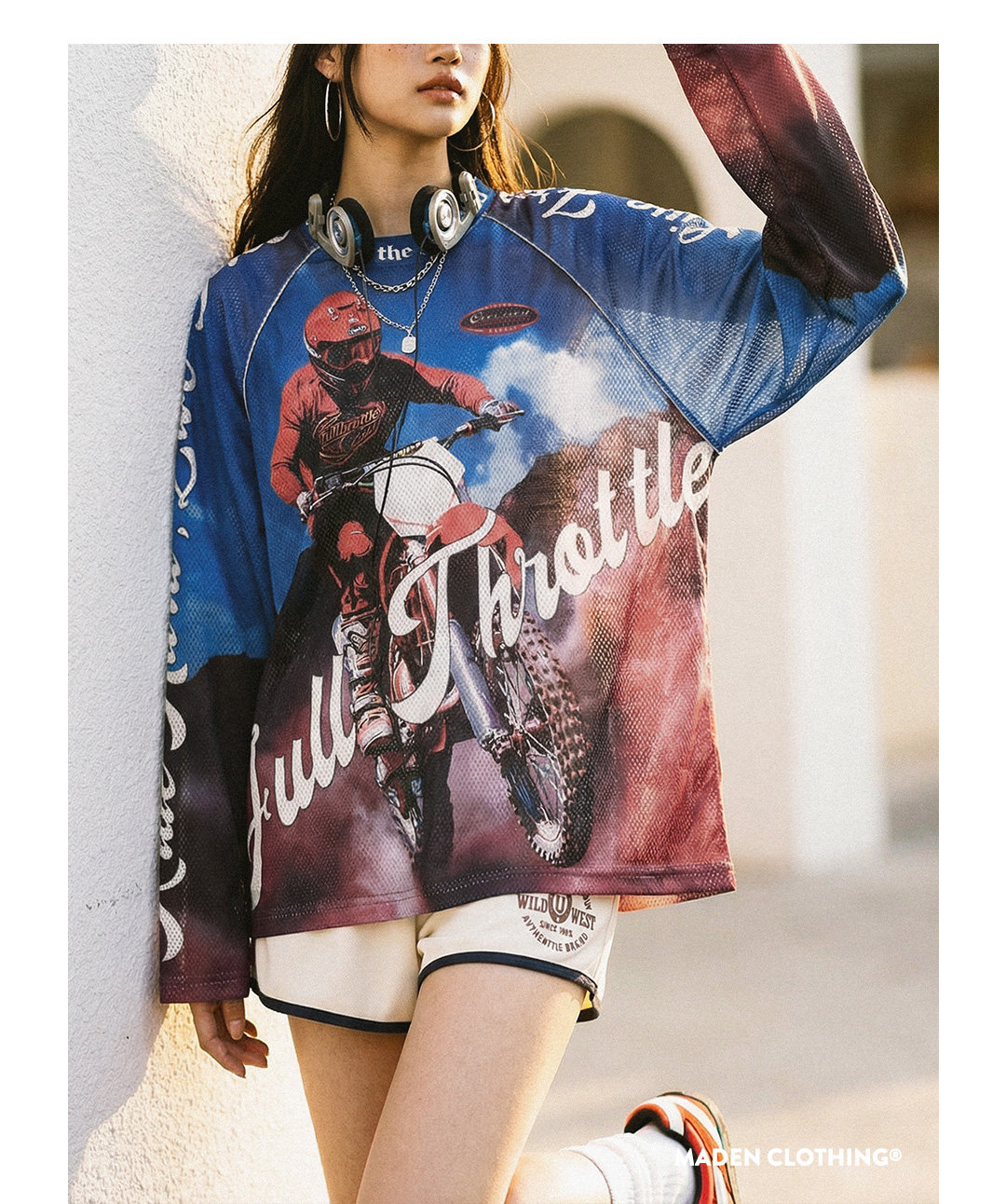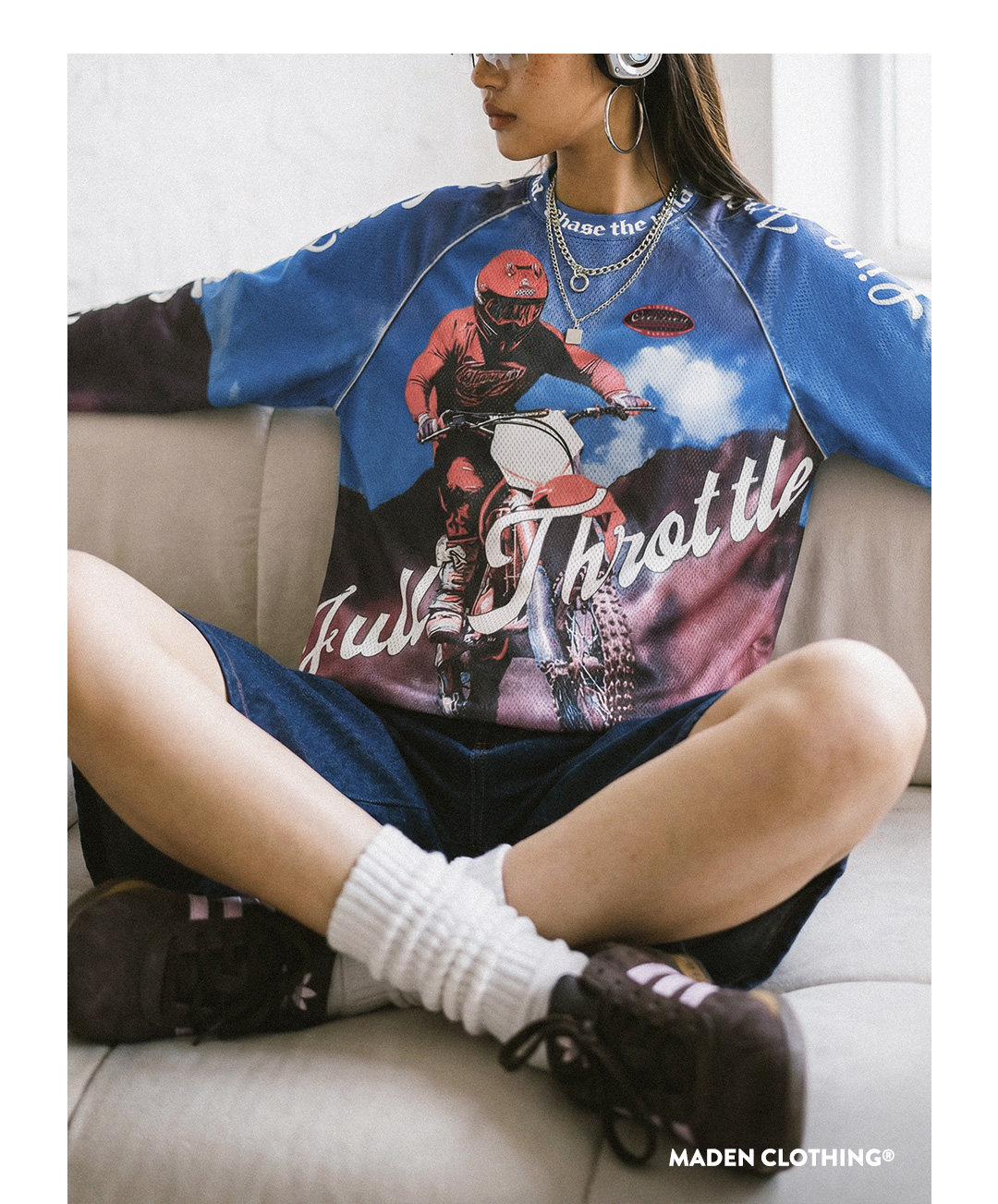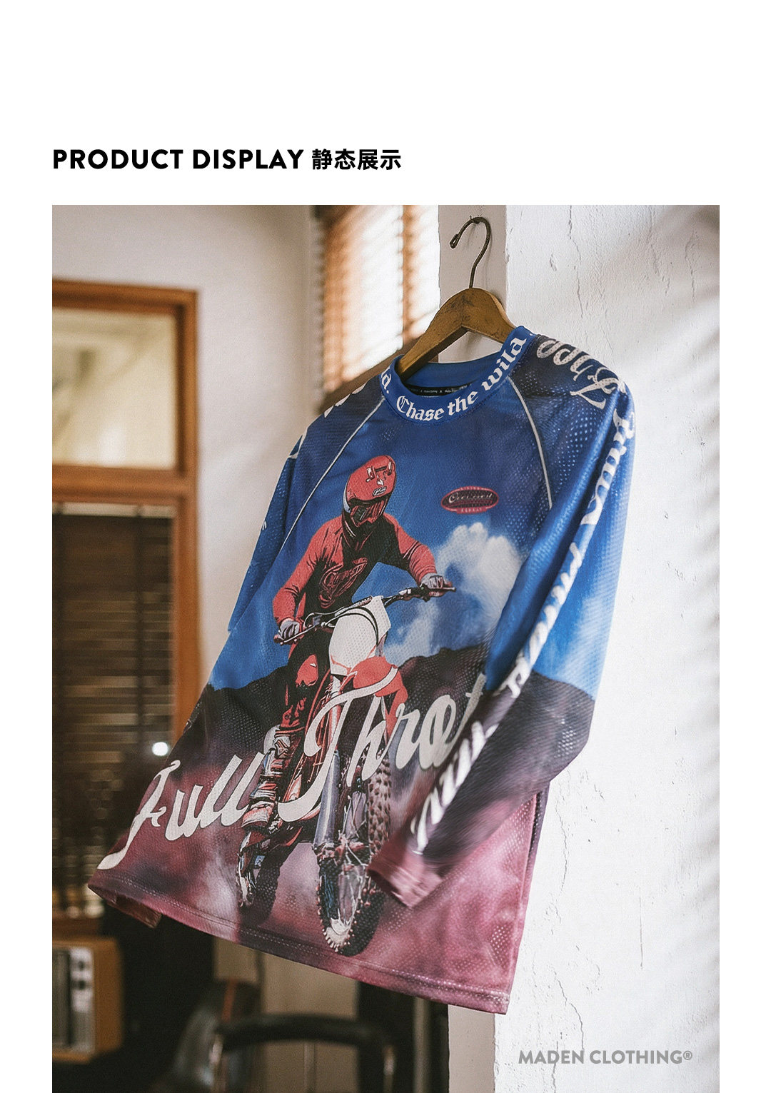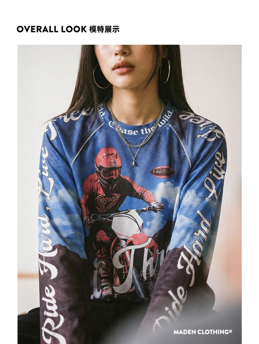 马登美式复古针织满印花长袖T恤薄款宽松立领套头外穿上衣女士春