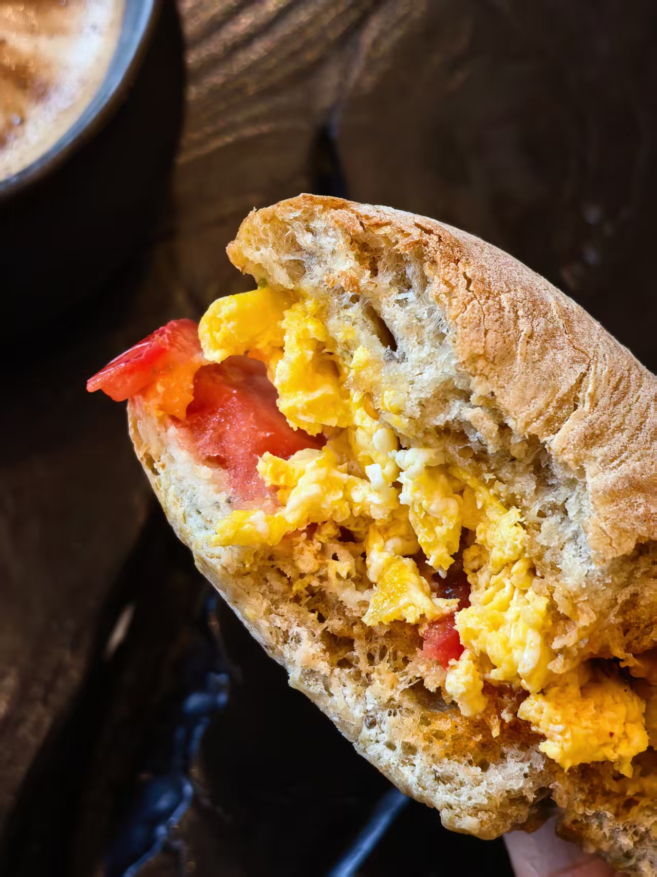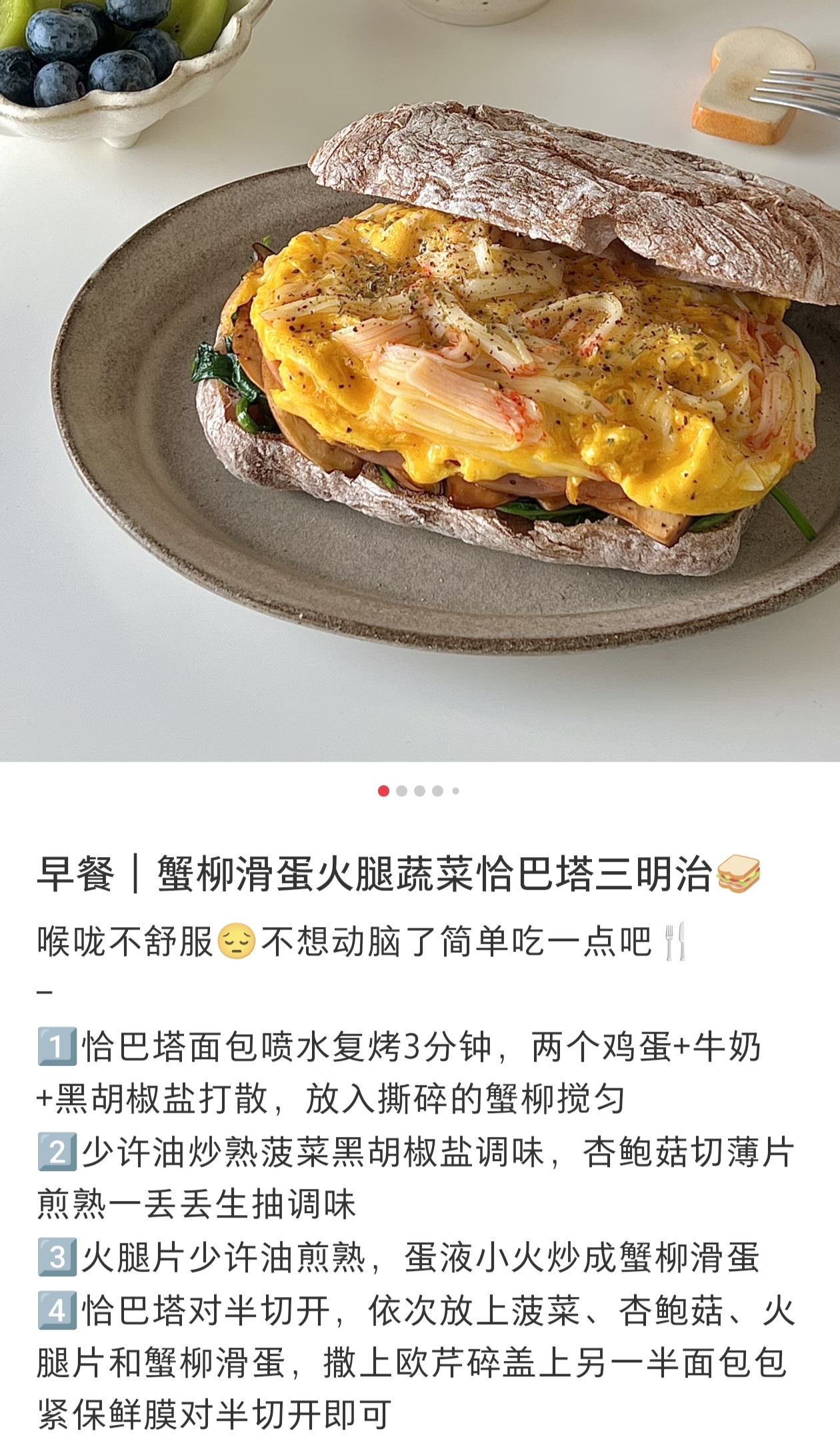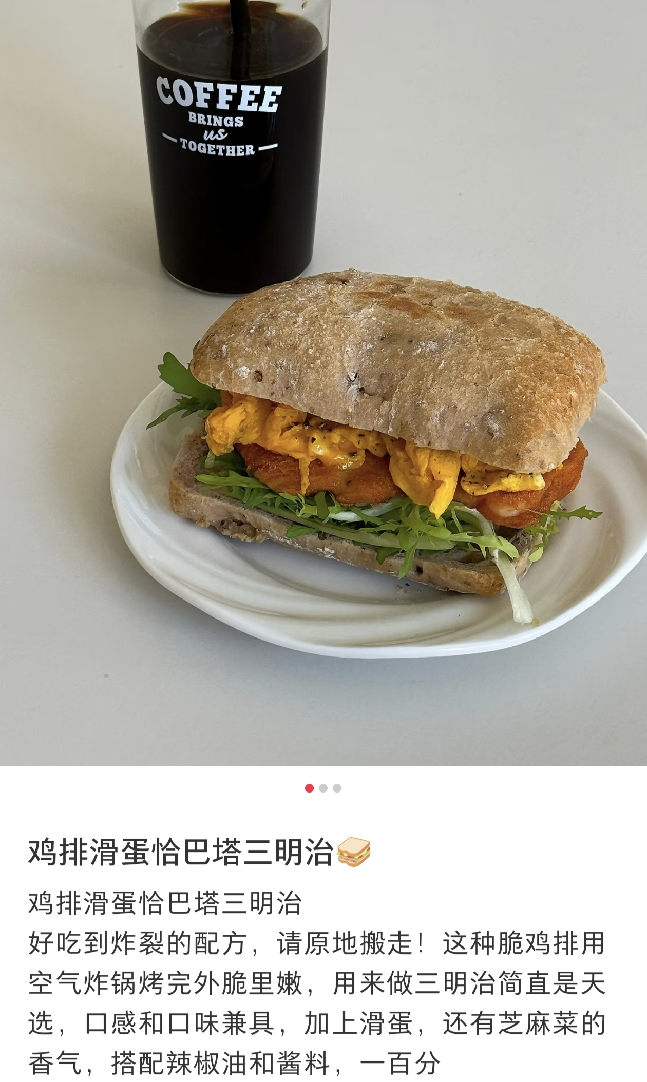 是可以直接啃的,但有时间的话可以把恰巴塔对半切开,放进空气炸锅烤一烤,再随手煎个鸡蛋,配上生菜番茄,来一勺酱,一夹!烤好的恰巴塔外壳带着烘烤后的焦香,内里却格外柔软蓬松,大气孔的纹理像海绵般轻盈,咀嚼时带着恰到好处的韧性,不粘牙、不噎口,麦香在齿间慢慢散开,还带着橄榄油的温润回甘,有点粗粝,有点微酸,但却很原始,越嚼越有滋味!