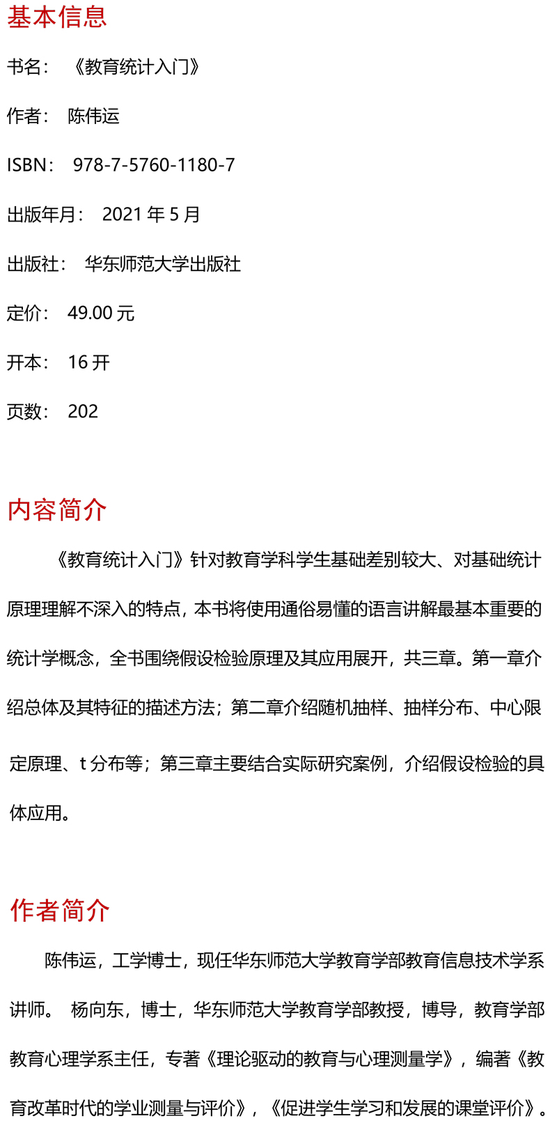 教育统计入门 教育量化研究方法系列丛书杨向东主编 描述统计统计推断实例分析研究生课程教材 陈伟运编著