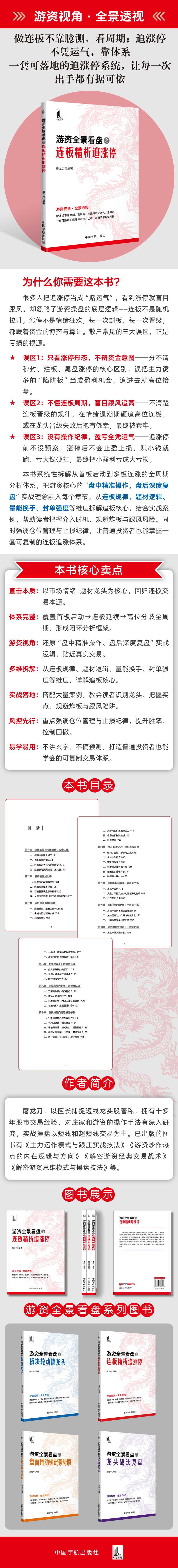 第一章 连板涨停与市场情绪、投资主线一、探寻连板股及成因/ 2二、连板股评估指标/ 4三、连板股走势与市场情绪变化/ 8四、连板股与投资主线、龙头股/ 10第二章 解密追涨成功率一、涨停板更具续涨优势/ 23二、连板涨停概率分析/ 25三、行情差异决定涨停概率/ 26四、从连板概率看投资主线与板块轮动/ 28第三章 连板股涨停基础分析一、连板基因:量能决定一切/ 33二、主线地位与涨停次序/ 35三、弱转强信号/ 39四、竞价与股价上攻爆发力/ 41五、市场连板梯队建设/ 43六、反包信号/ 50第四章 抢入涨停金矿:探秘首板涨停一、时间、金额、形态与力度/ 56二、主流炒作概念/ 65三、首板打板买入/ 67四、捕捉快速涨停第一板/ 69五、新股初次涨停打板/ 71六、捕捉第一板战法/ 73第五章 涨停板强弱分化:首板到二板一、高概率分析/ 78二、大盘、风格及热点对连板率的影响/ 81三、炒作题材分化/ 83第六章 连板股成龙之路:二板到三板一、高概率分析与捕捉三板股/ 87二、龙头现身与炒作概念继续分化/ 92三、一字板是龙头股的门票/ 97第七章 高胜率打板战法:三板到四板一、高胜率抢入涨停板/ 103二、一字板、震荡与回封频现身/ 107三、游资接力炒作与概念升温/ 108第八章 龙头股现身:四板到五板一、抢入涨停板的突破口/ 113二、识别大龙头与二线龙头/ 115三、防控封板失败/ 117第九章 炒股就炒大龙头:五板及以上一、五板龙头股的典型特征/ 121二、市场大龙头的产生/ 123三、九板大龙头与六板二龙头的区别/ 125四、在地天板中把握震荡机会/ 127第十章 游资如何交易连板涨停股一、打板与做核心寻找确定性/ 132二、杭州上塘路:滚动交易/ 134三、宁波桑田路:跟对热点,反复操作/ 136四、绍兴人民东路:小波段,高频交易/ 138五、炒股养家:有利则止,积少成多/ 139