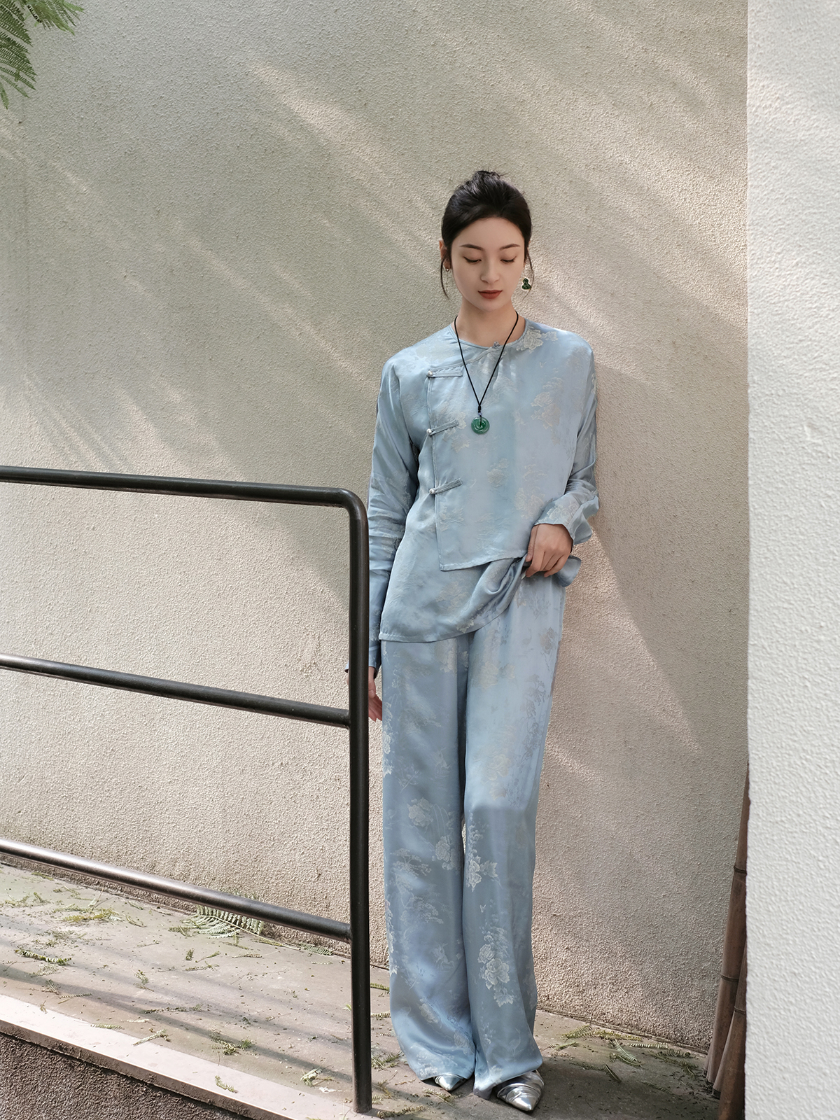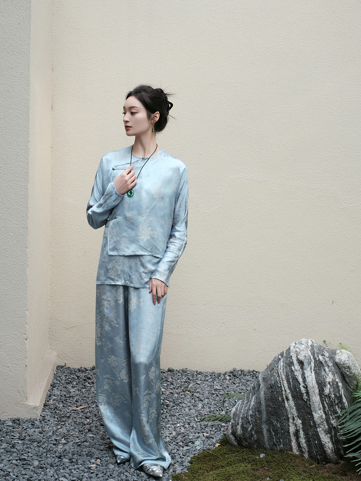 盛唐牡丹 |孔雀蓝双面穿菊花纹提花真丝外套