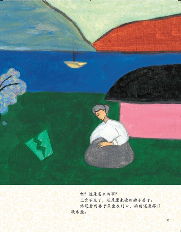“你这个笨蛋,世上哪有像你这么傻的人!就要来一只木盆。赶紧再到金鱼那儿去,向它要栋新房子。住在这种破旧的房子里,我早就烦透了。”