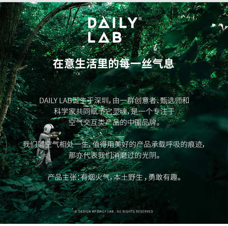 - DAILY LAB|日常实验室,立足东方美学,是专注于「香气可视化」的轻奢空气交互品牌。
