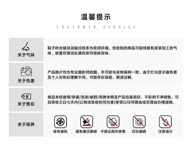 1.因穿用不当(鞋面因磕碰、磨损、鞋底漫水时间过长等)、保养不当或人为原因造成鞋子损坏。