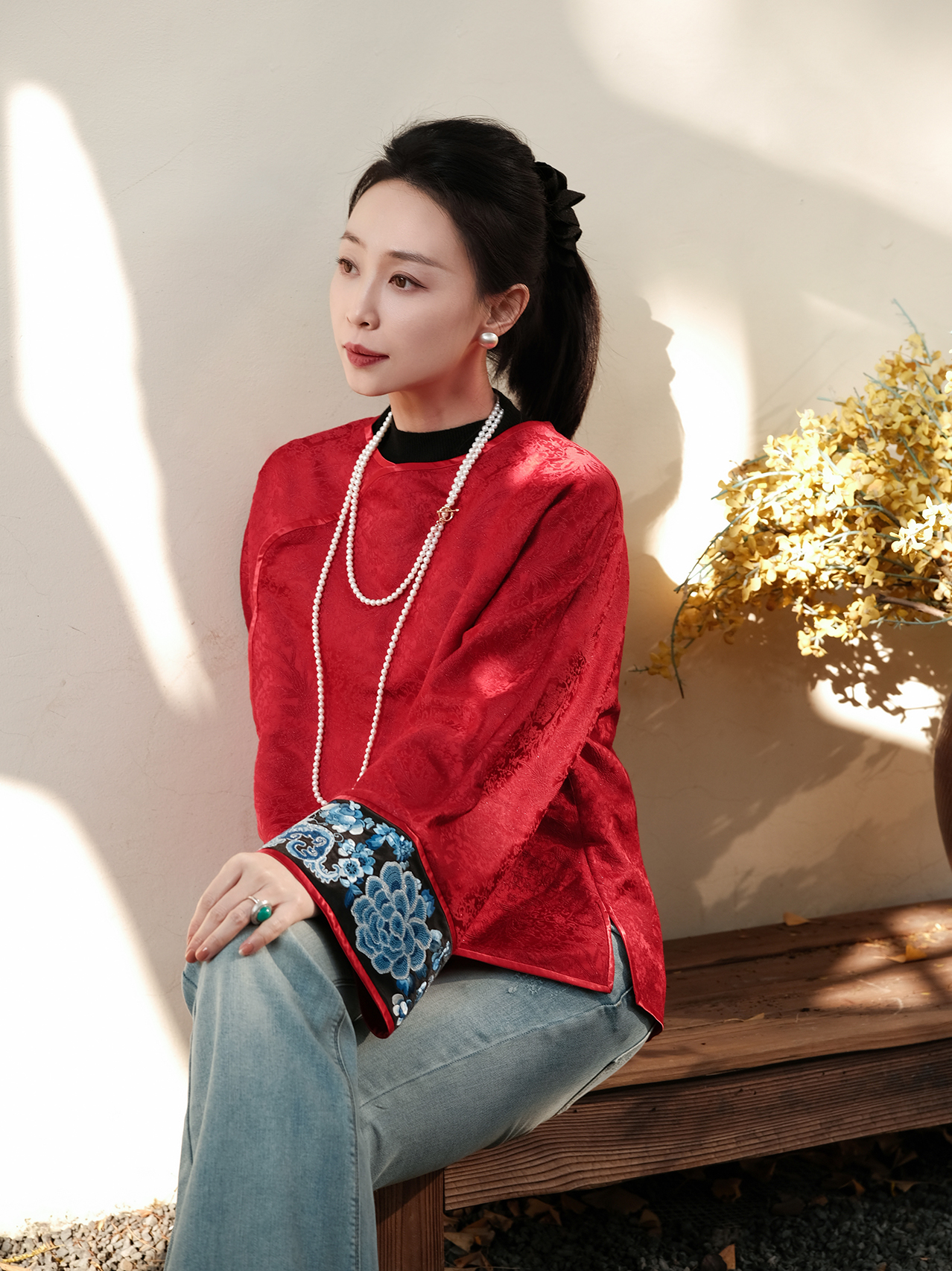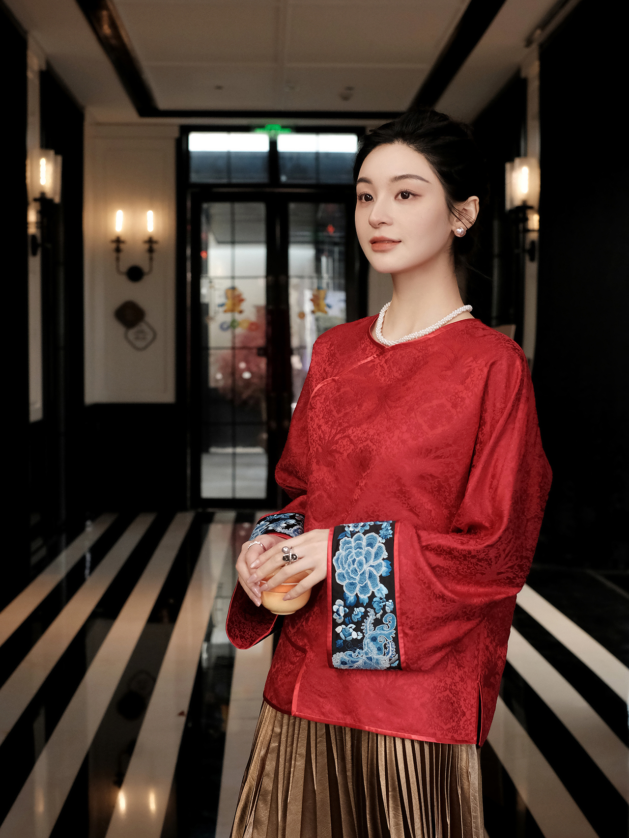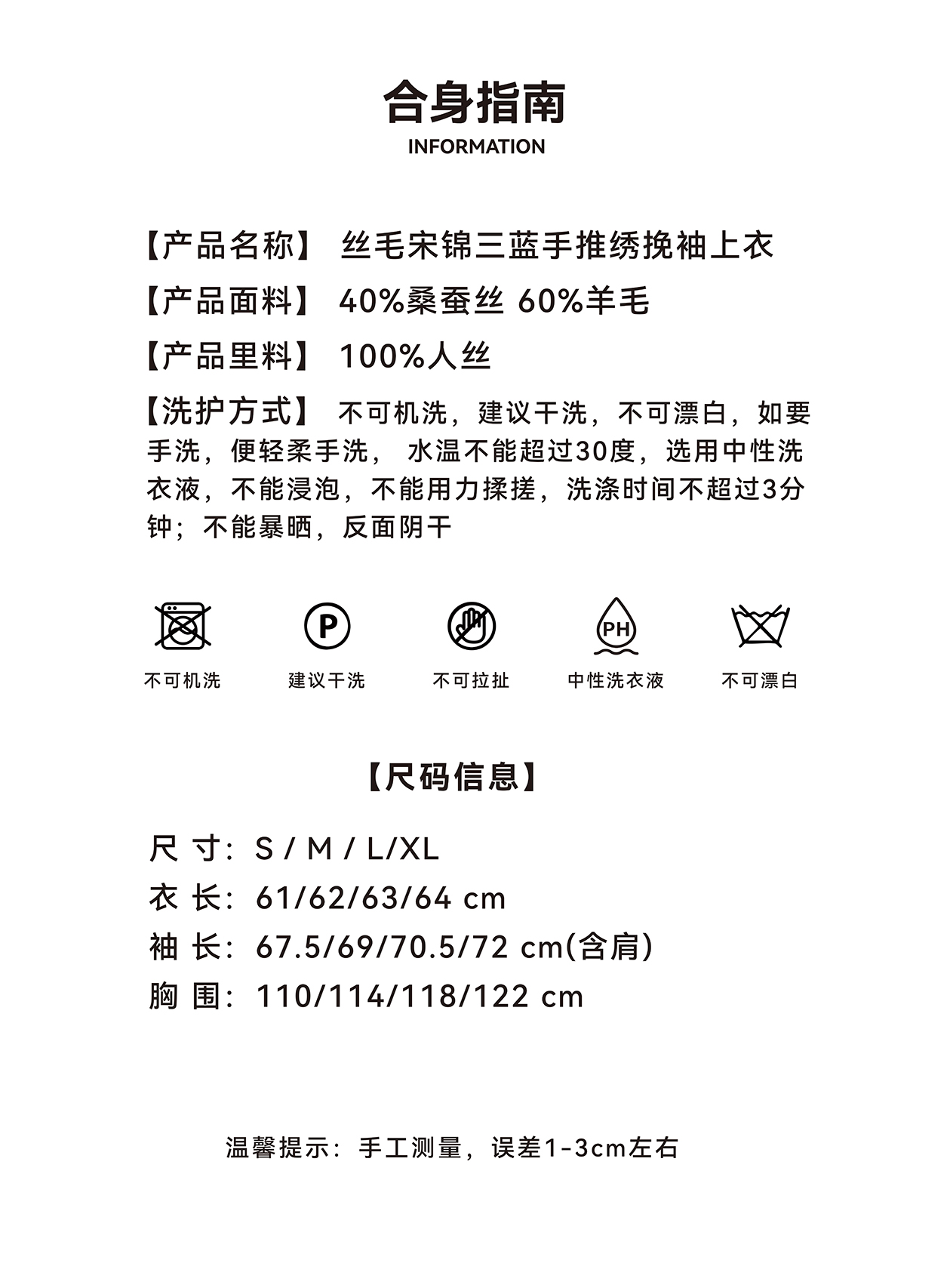 盛唐牡丹盛奢系列| 丝毛宋锦三蓝手推绣挽袖上衣