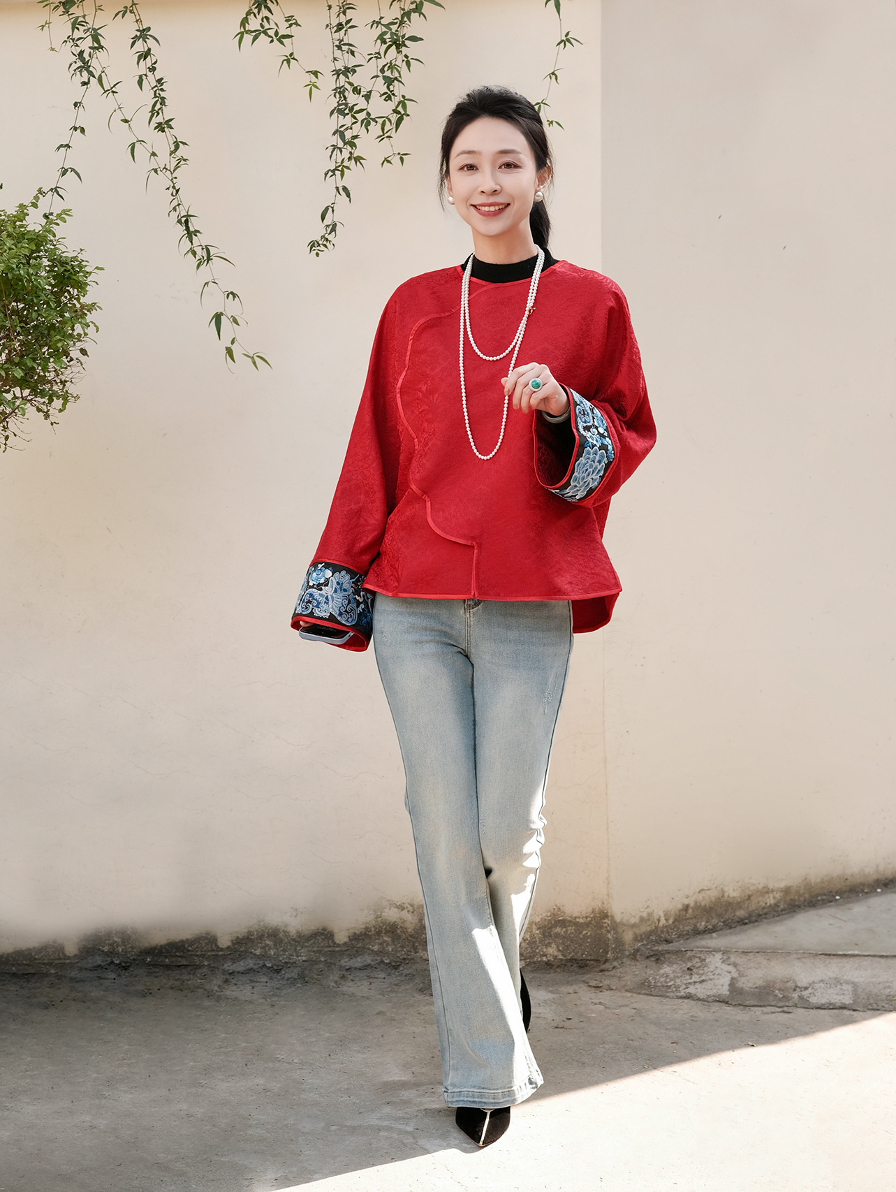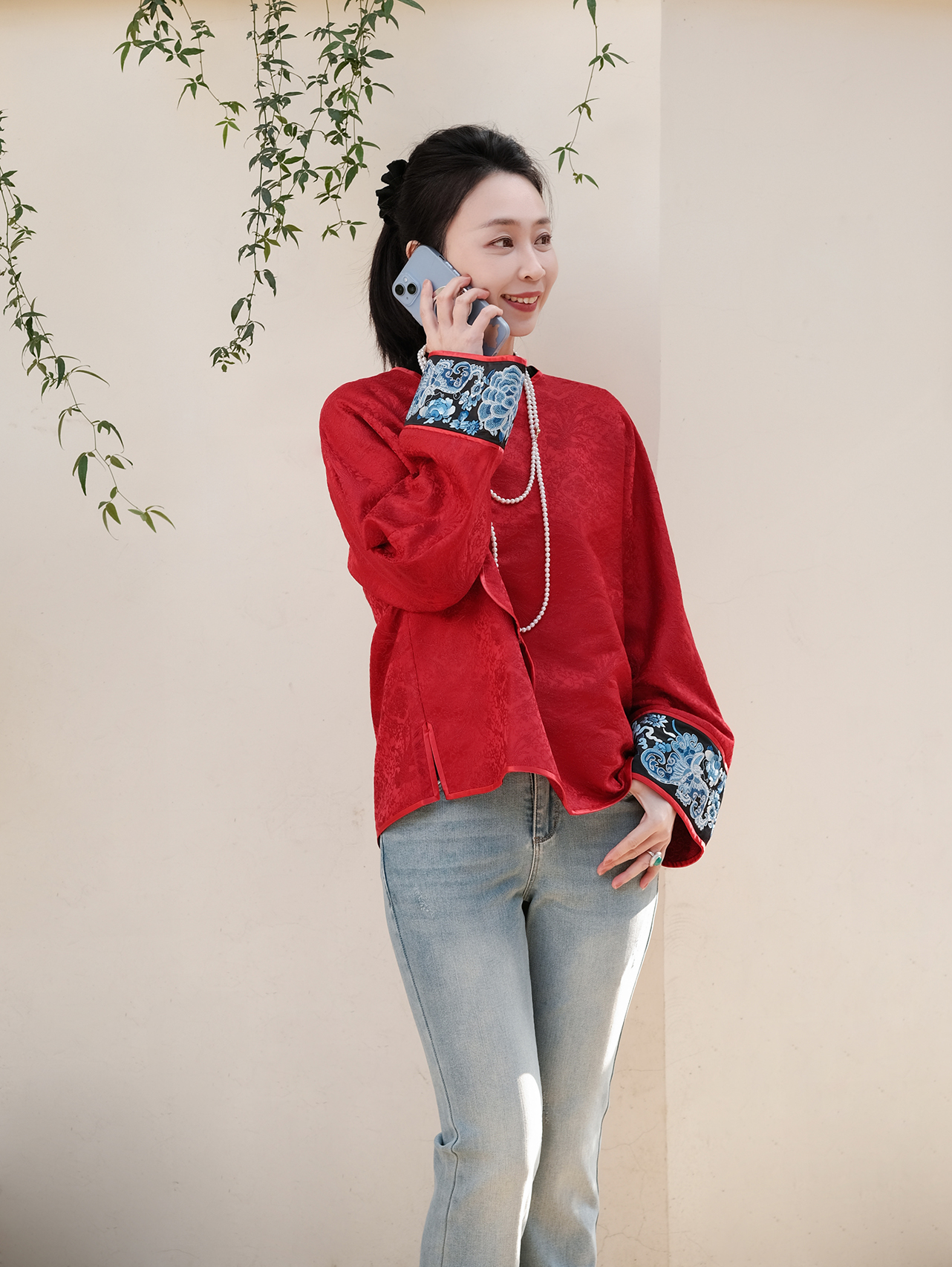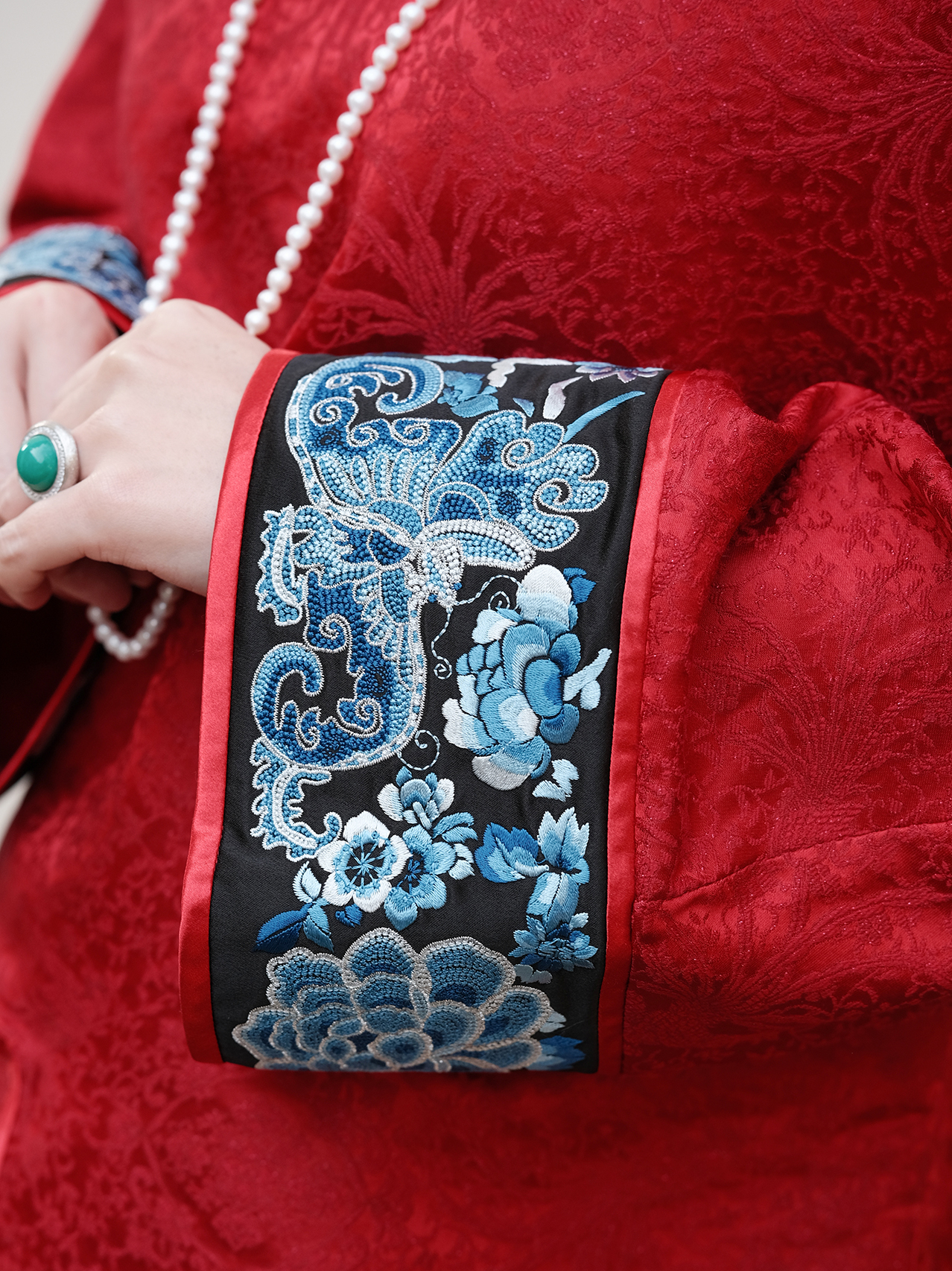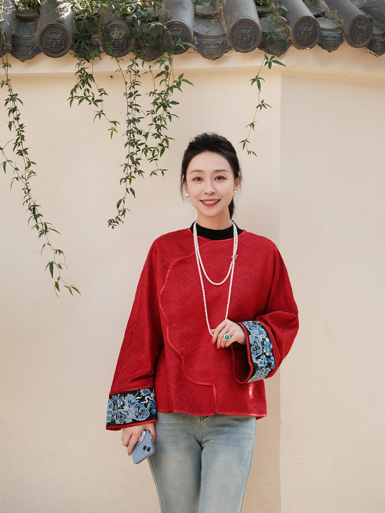 盛唐牡丹盛奢系列| 丝毛宋锦三蓝手推绣挽袖上衣