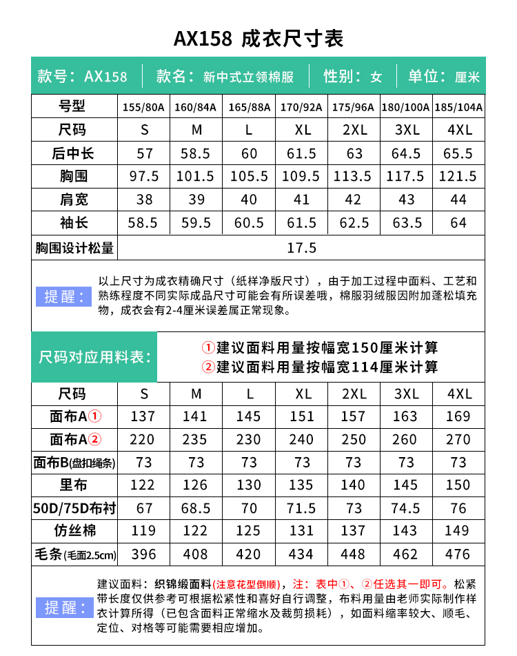 裁缝学苑AX158新中式立领复古棉服纸样女装改良旗袍式夹棉外套上衣样板