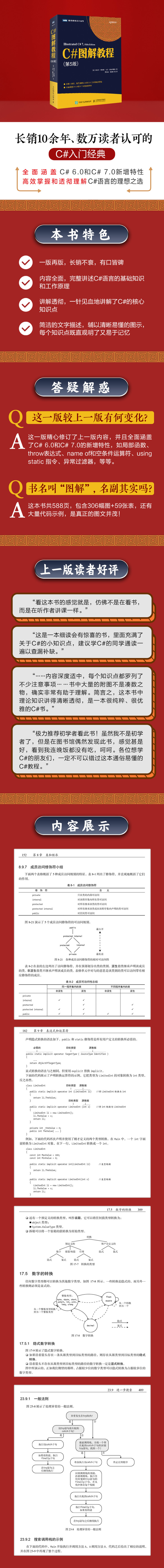 本书是广受赞誉的《C# 图解教程》的*新版本。作者在本书中创造了一种全新的可视化叙述方式,以图文并茂的形式、朴实简洁的文字,并辅以大量表格和代码示例,全面、直观地阐述了C# 语言的各种特性。新版本除了精心修订旧版内容外,还全面涵盖了C# 6.0 和C# 7.0 的新增特性,比如局部函数、throw 表达式、name of 和空条件运算符、using static 指令、异常过滤器,等等。通过本书,读者能够快速、深入地理解C#,为自己的编程生涯打下良好的基础。