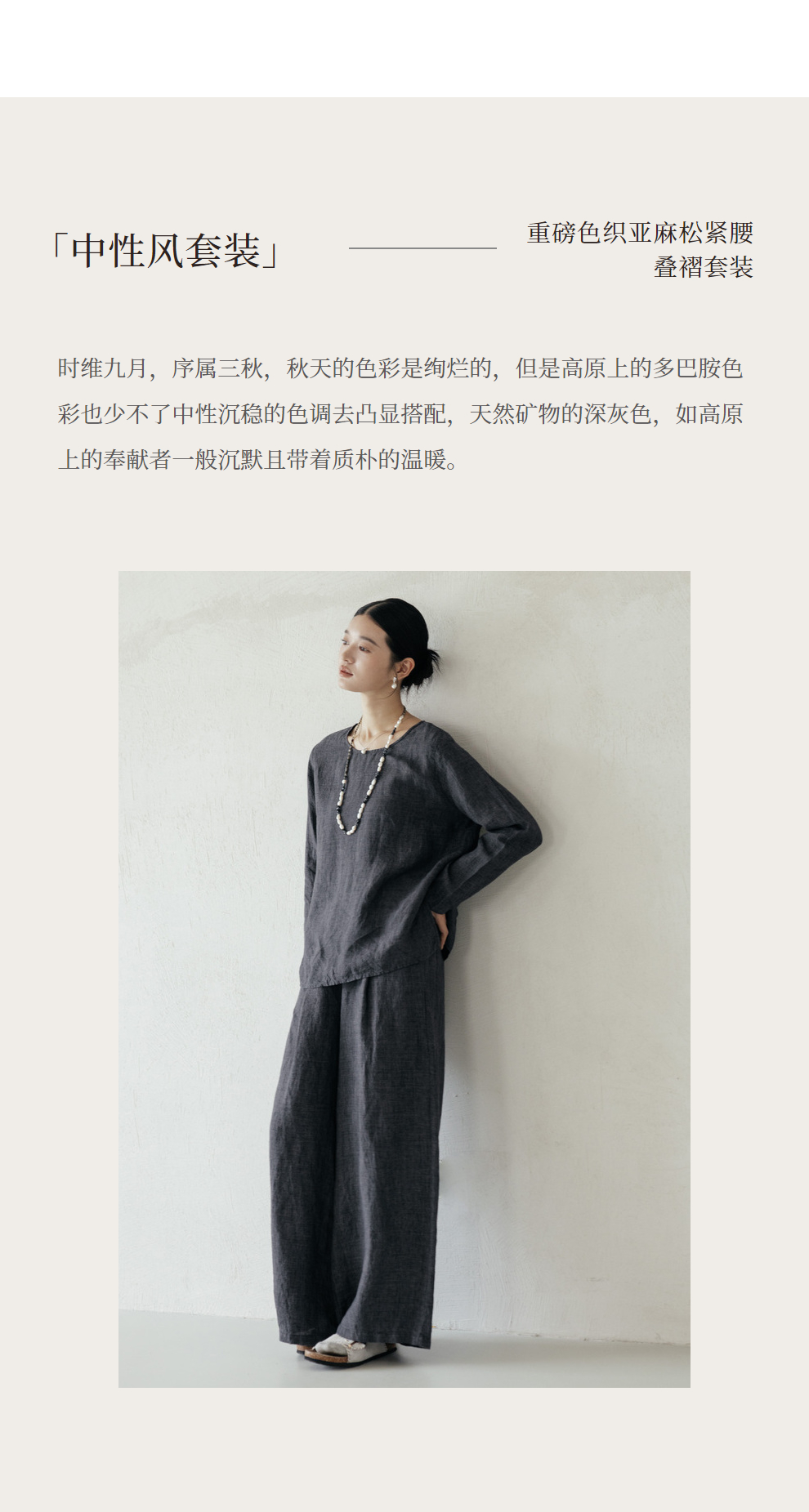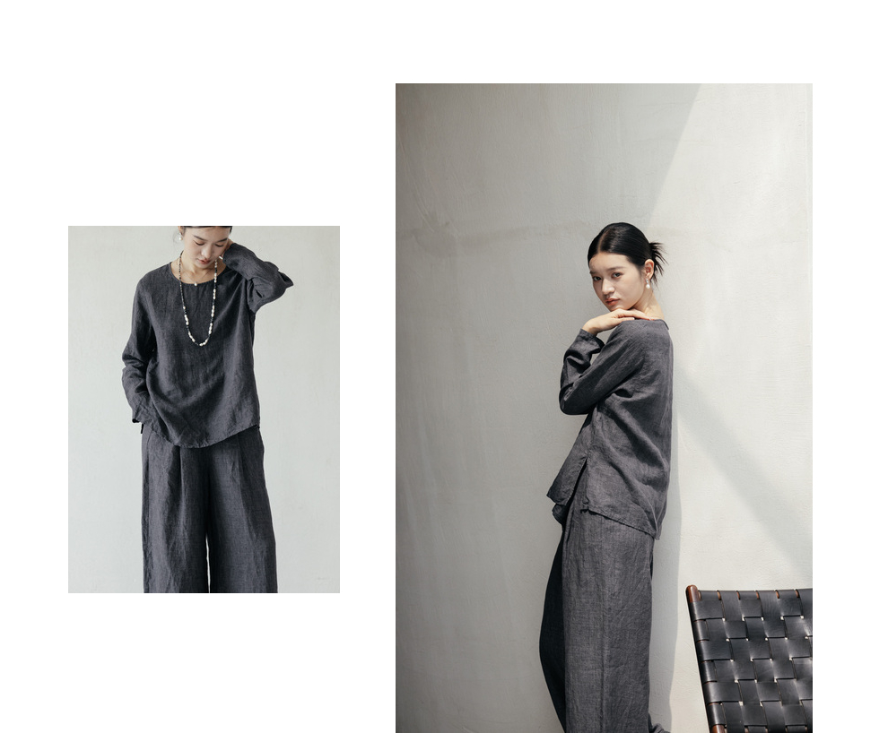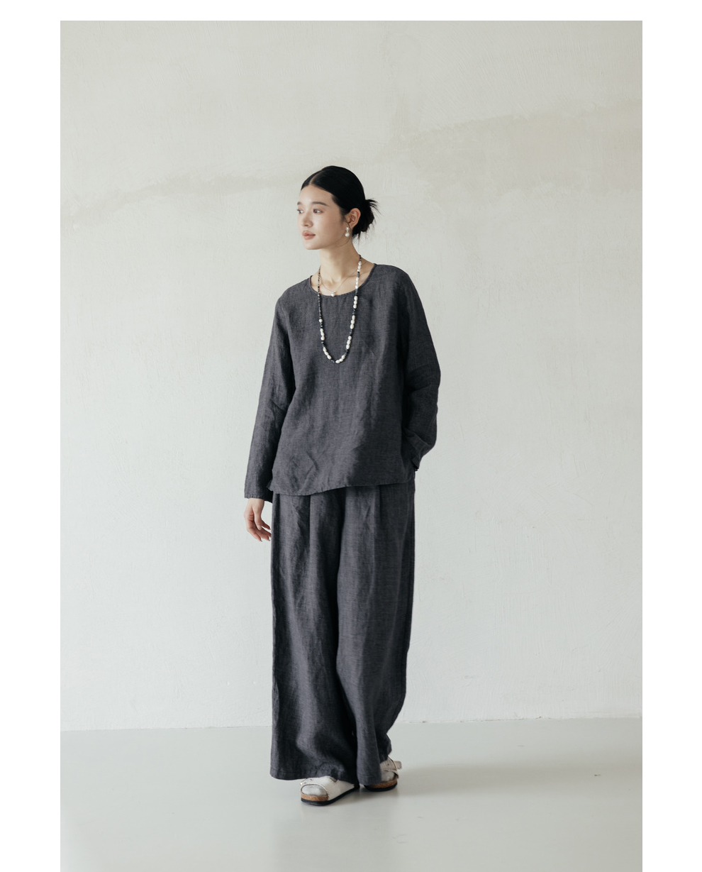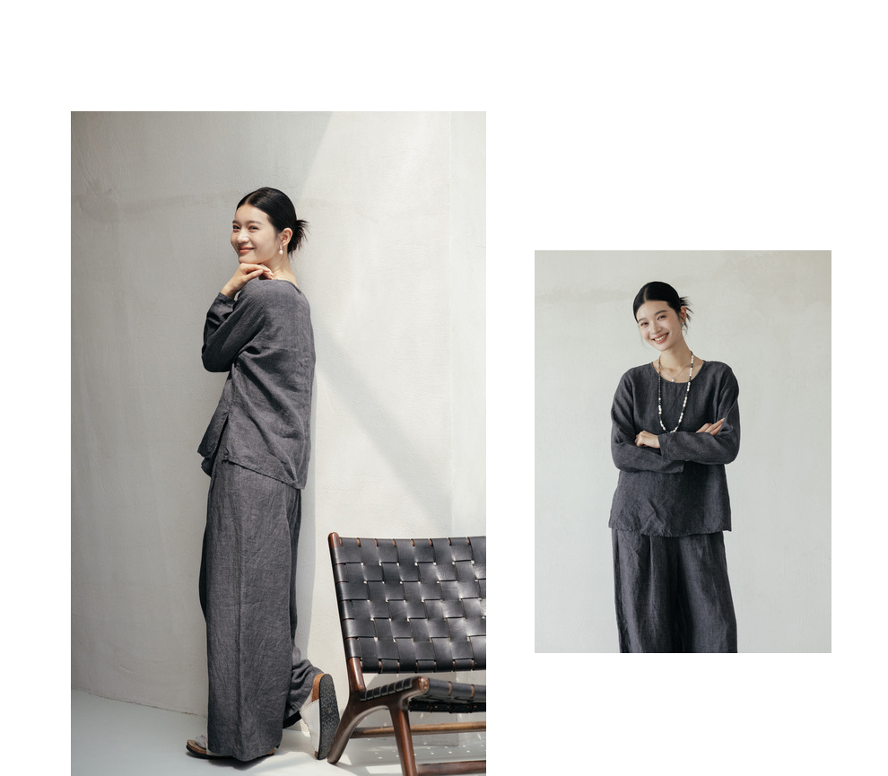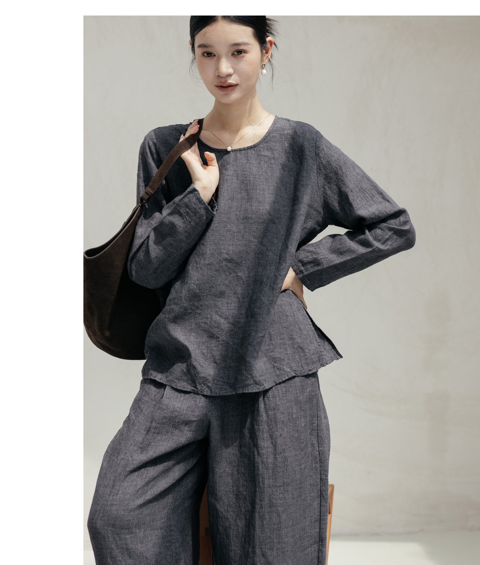 绽放646-647朵/早秋中性风重磅色织亚麻松紧腰叠褶小衫长裤套装