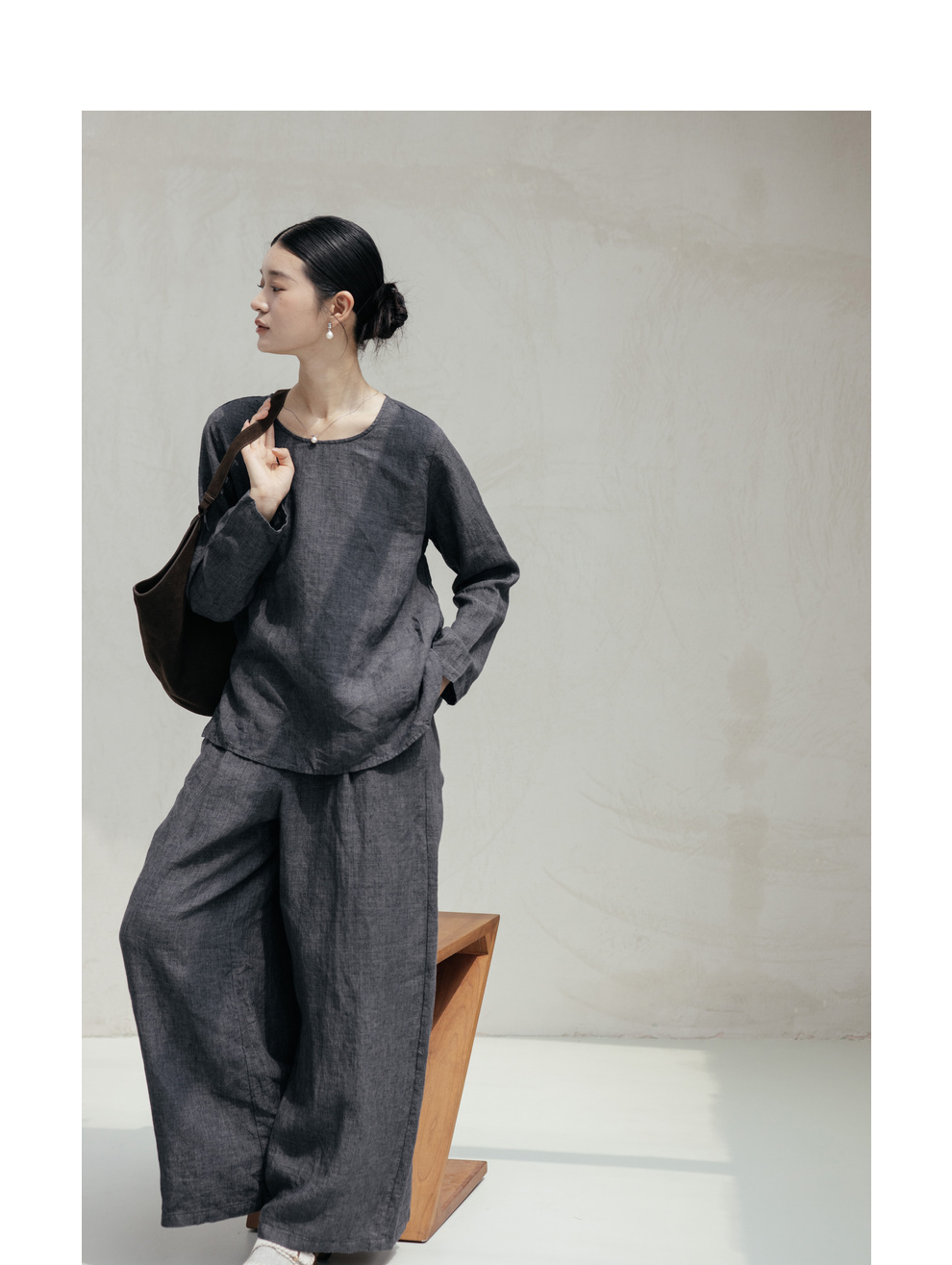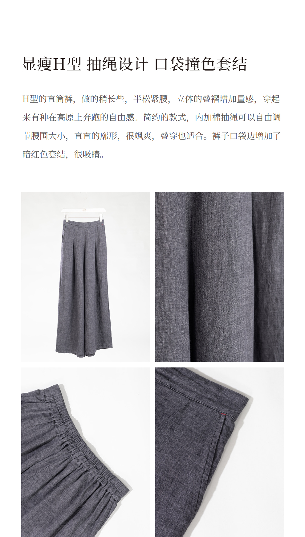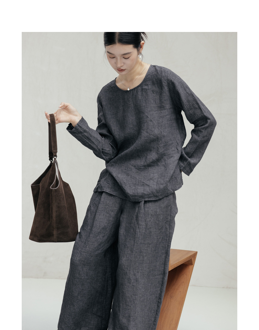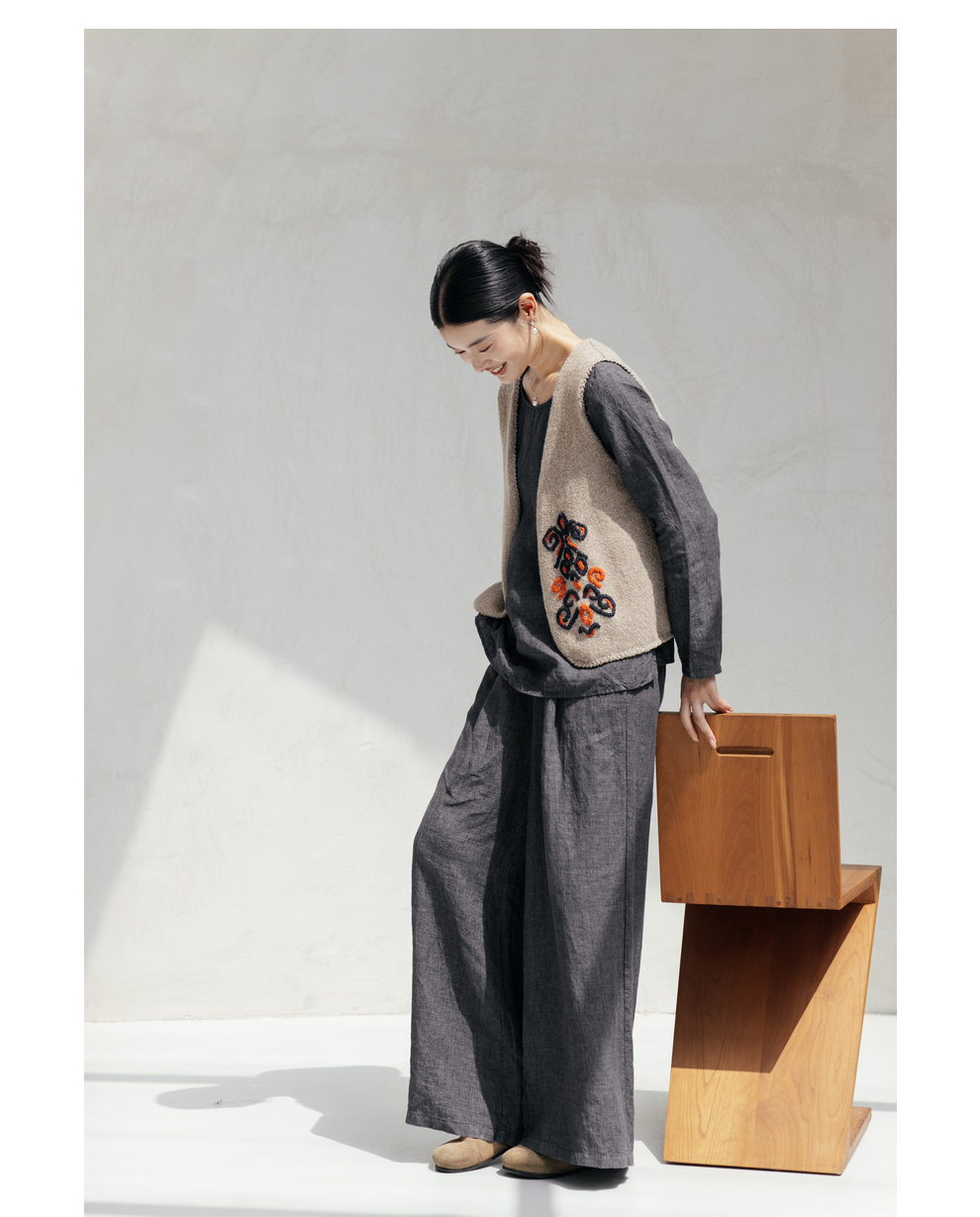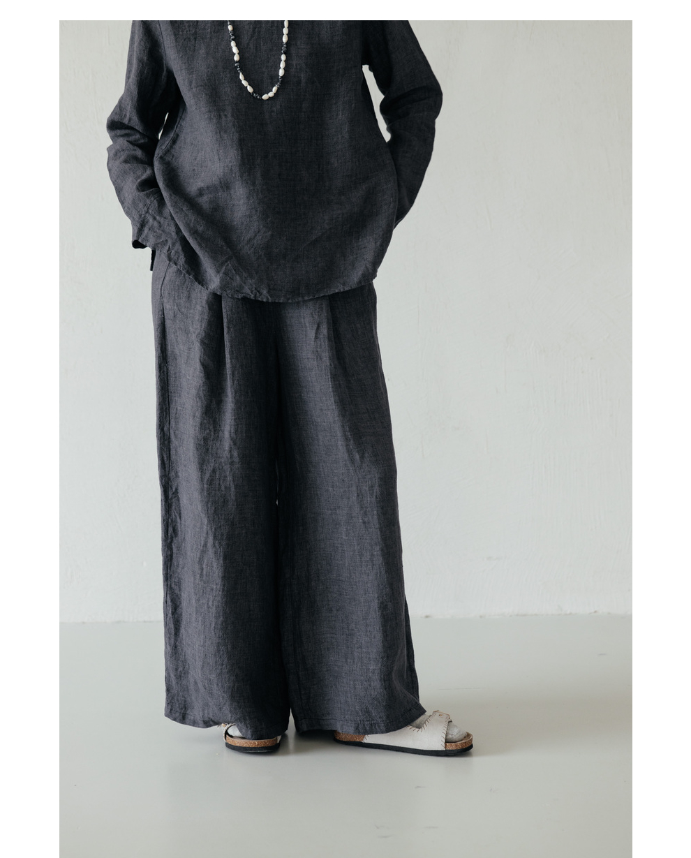 绽放646-647朵/早秋中性风重磅色织亚麻松紧腰叠褶小衫长裤套装