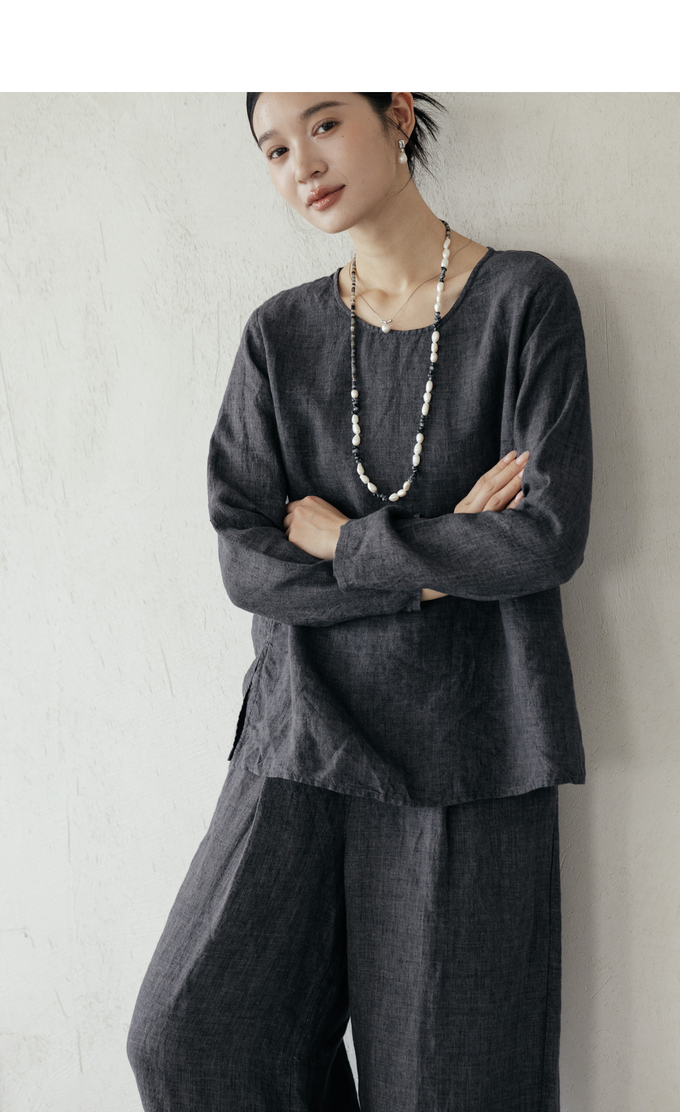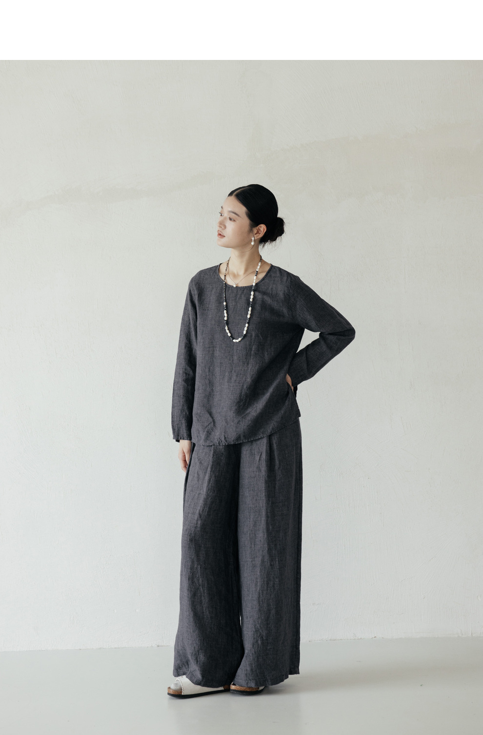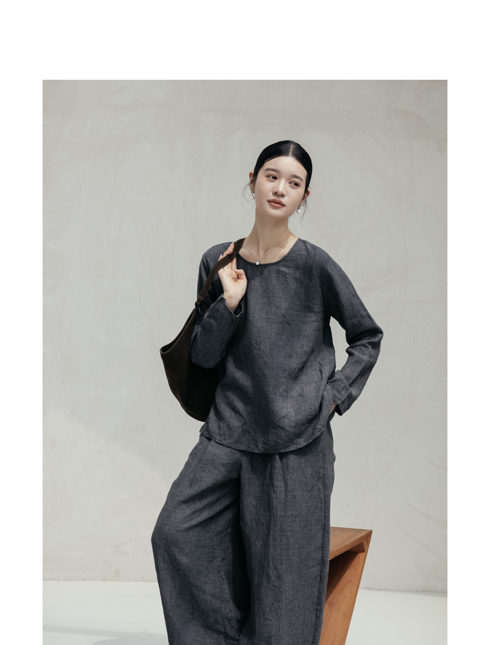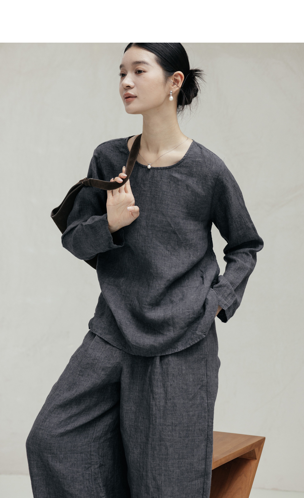 绽放646-647朵/早秋中性风重磅色织亚麻松紧腰叠褶小衫长裤套装