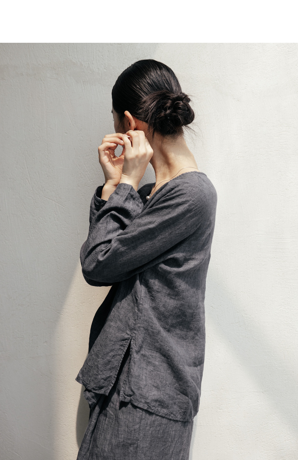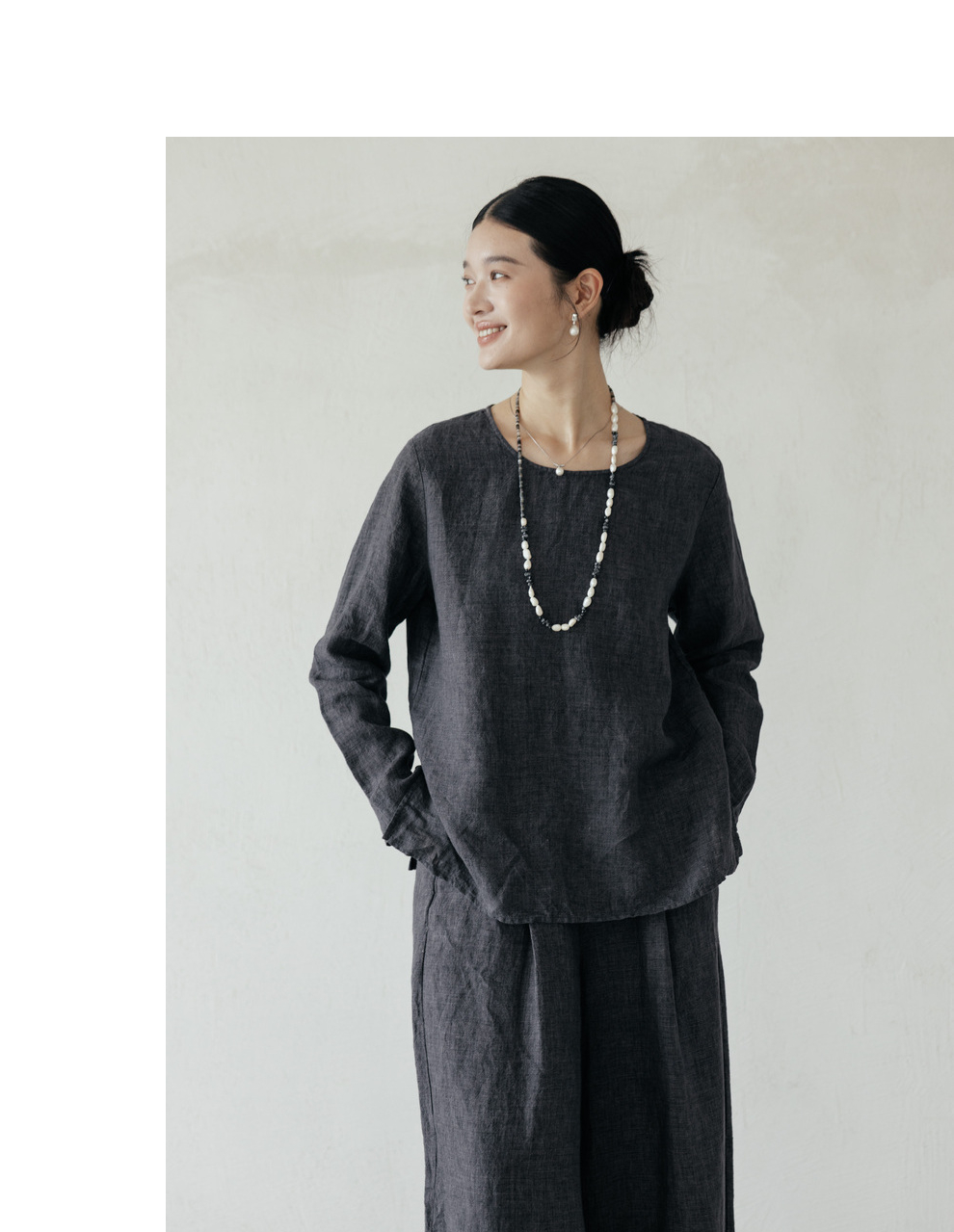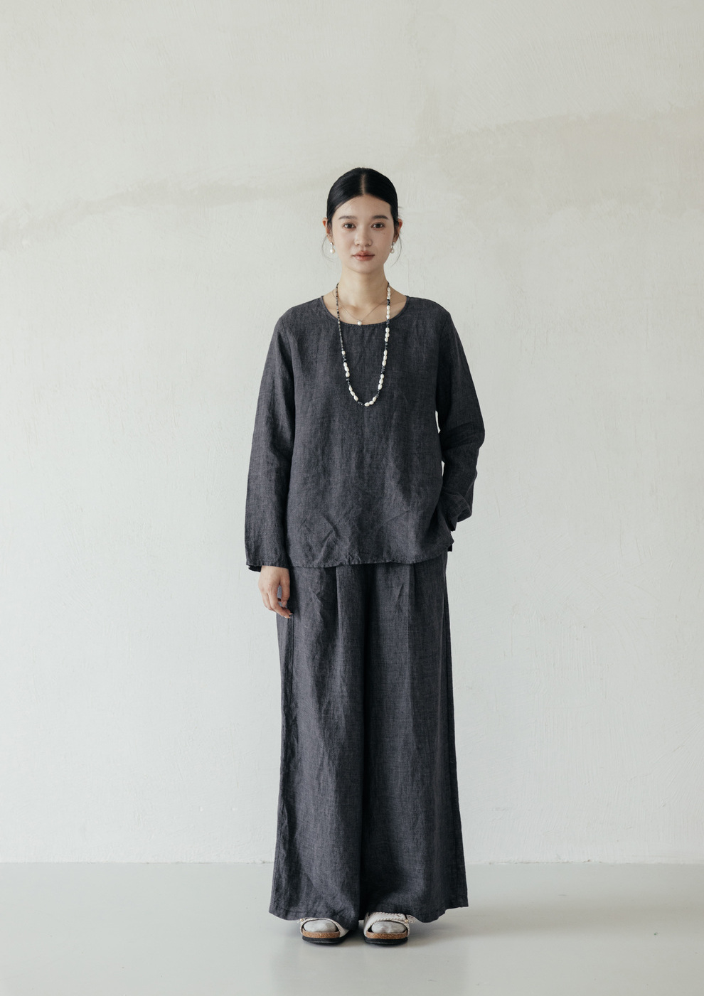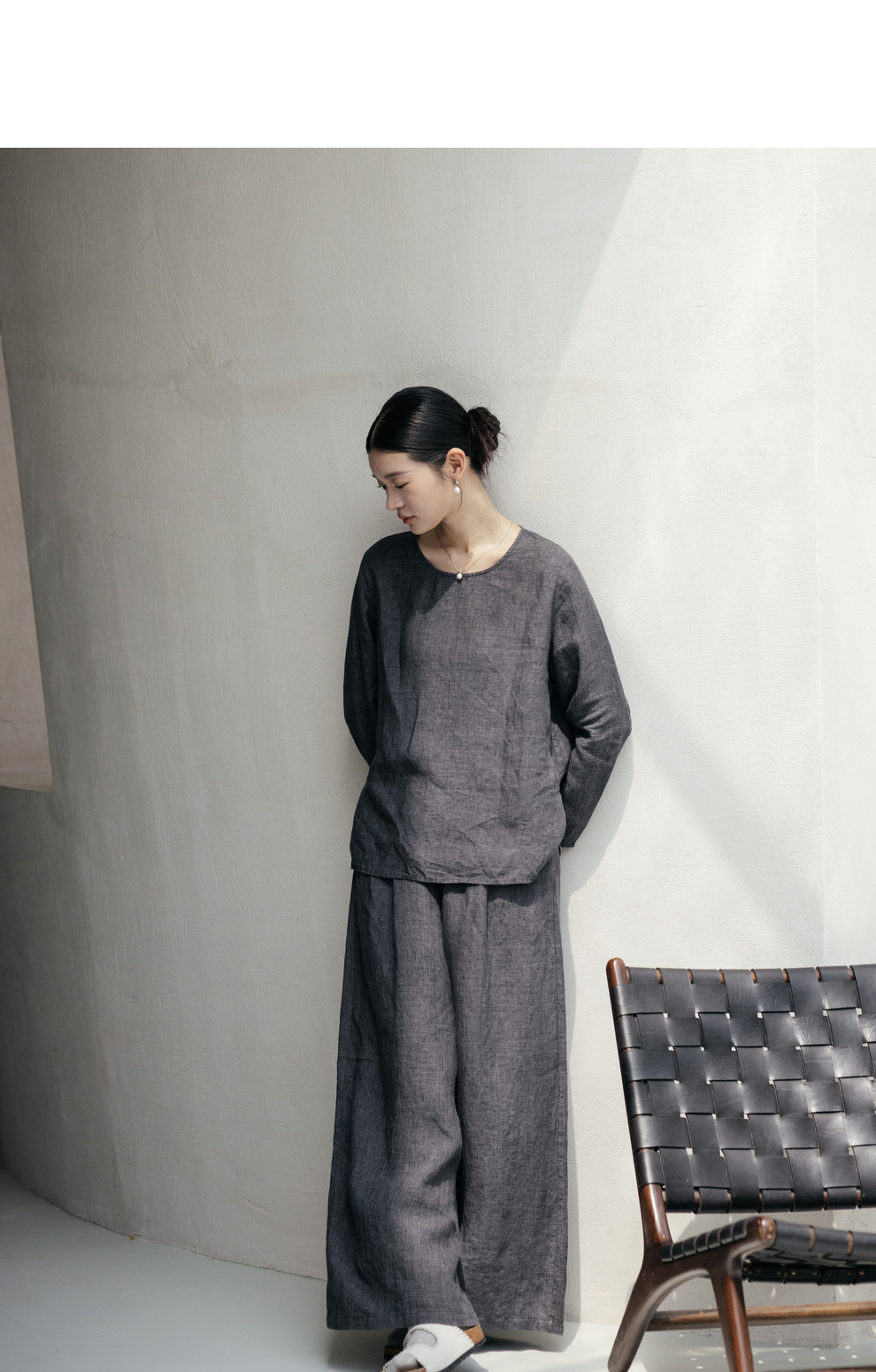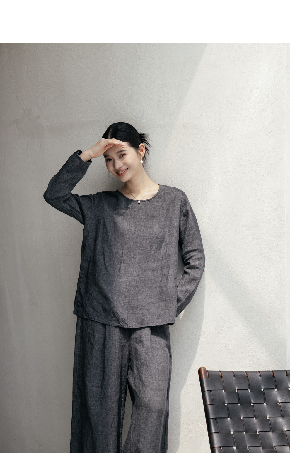 绽放646-647朵/早秋中性风重磅色织亚麻松紧腰叠褶小衫长裤套装