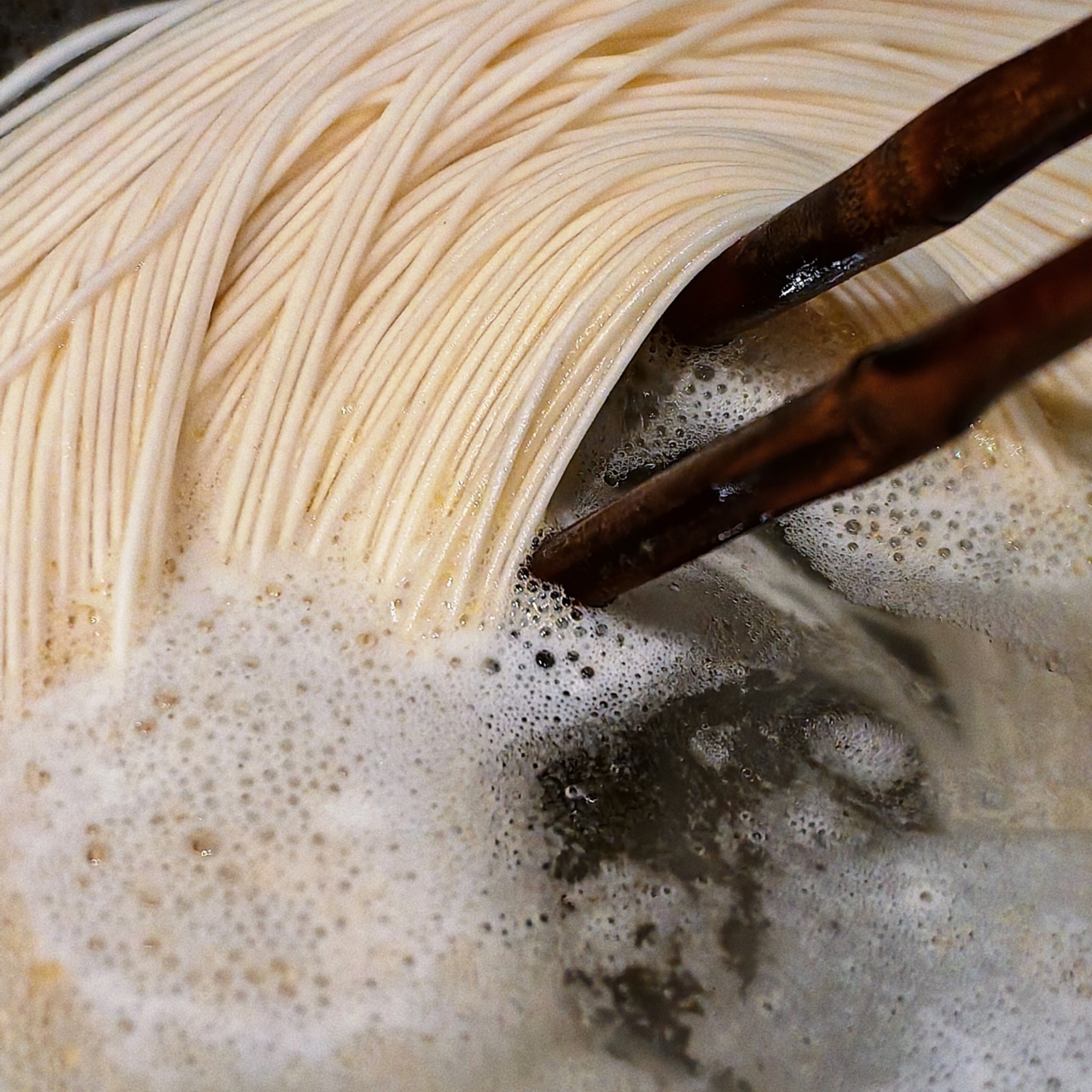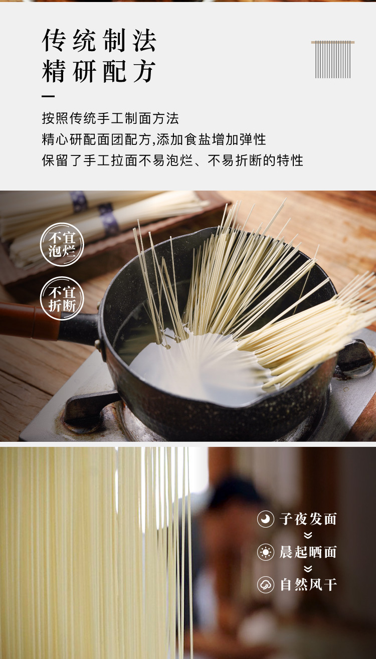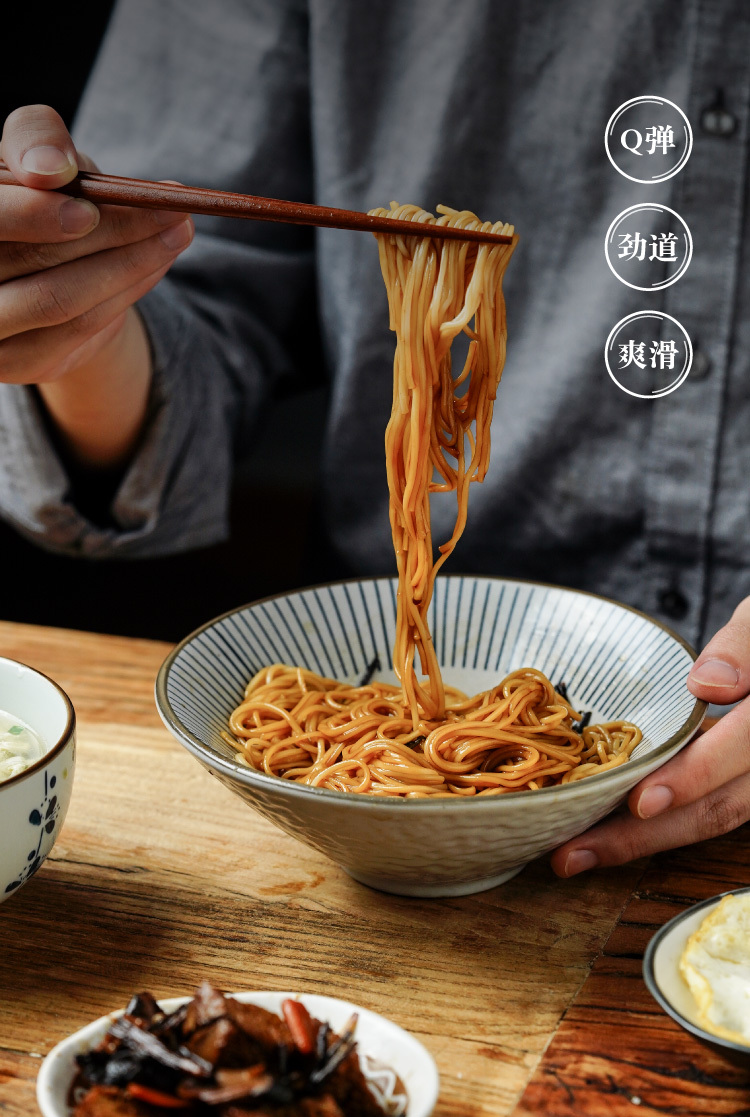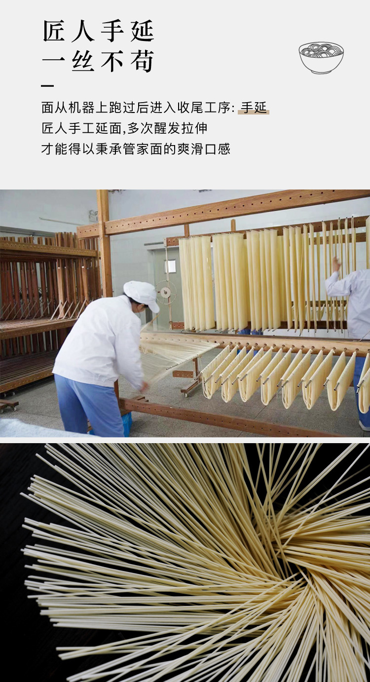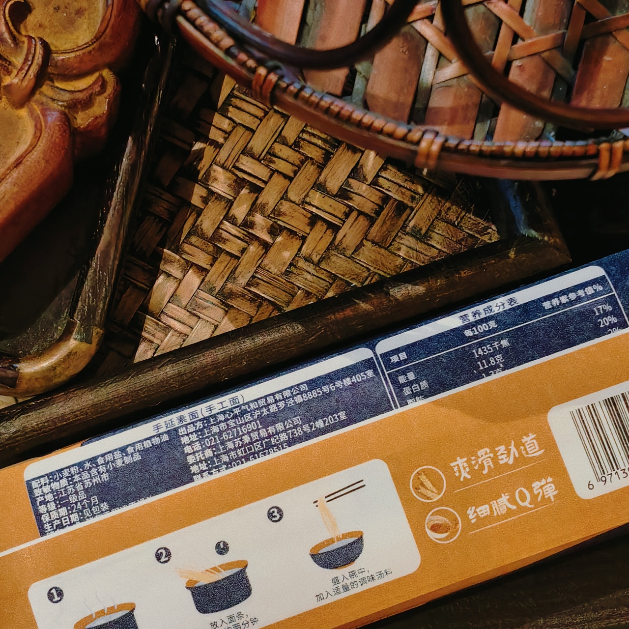 日食记的手延素面,真是一款能够拯救饥饿灵魂的神奇面条!选用的是优质高筋小麦为原料,经过十二道工序和二十多小时的醒发与拉伸,按照传统手工制面方法,添加食盐增加弹性,真的巨细巨细,但又很有韧性!非油炸,高品质,同时又保留了手工拉面不易泡烂折断的特性,每一根面条都充满了匠人的心血与智慧!