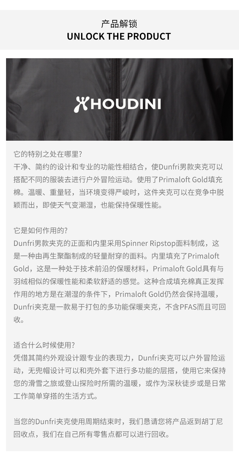 HOUDINI胡丁尼 Dunfri Jacket 邓菲 男款立领保暖棉服夹克820015