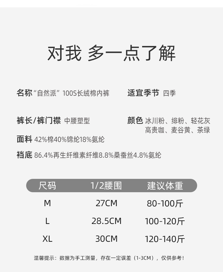 【品名】MEINS/梅因斯 舒适人生系列“自然派”100S长绒棉女士内裤 3条装 【规格】 冰川粉+绯粉+轻花灰 高贵咖+麦谷黄+茶绿 【尺寸】M-XL 【产地】国内 【材质】 面料:棉42% 锦纶40% 氨纶8% 裆底:再生纤维素纤维86.4% 桑蚕丝8.8% 氨纶4.8% 【发货包装】独立包装 【发货地】广东、浙江随机发 【发货快递】中通、申通随机发 【补邮费地区】新疆、西藏+10元 【发货时效】48-72小时,周末节假日顺延 |
