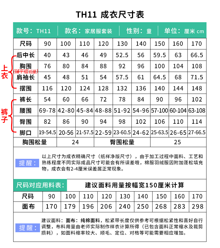 裁缝学苑TH11家居服套装纸样儿童男童女童睡衣童装上衣裤子样板