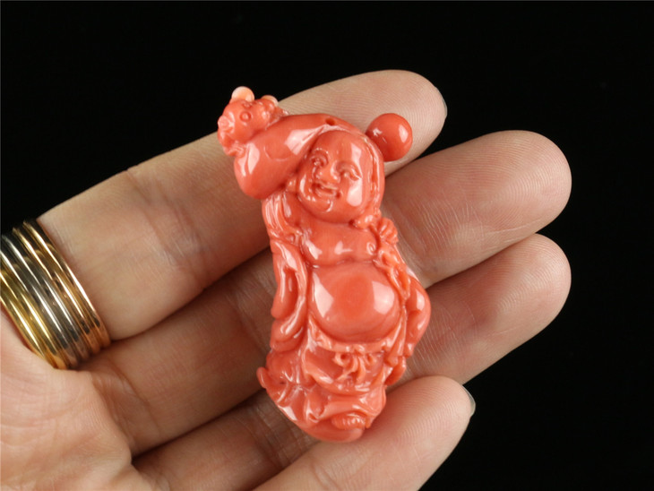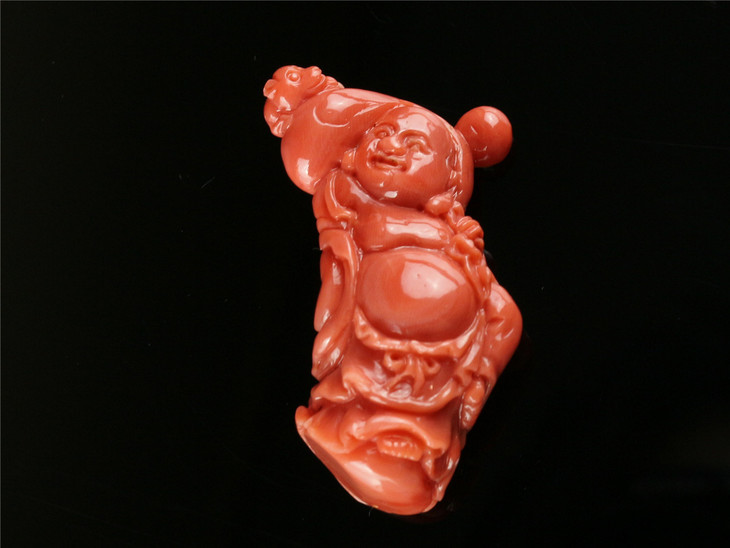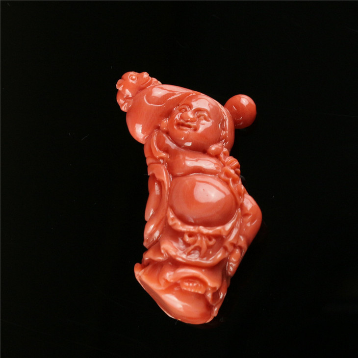 珊瑚雕布袋和尚挂件 布袋和尚形象通常为脸带笑容,手提布袋,因此常被世人认为带有有和气生财、累积财富的意味。此雕件用料讲究,雕工精湛,细节完美,人物神太栩栩如生。无论哪个角度欣赏都是一件相当完美的艺术品。(雕件顶部已开孔,可搭配各类挂绳)