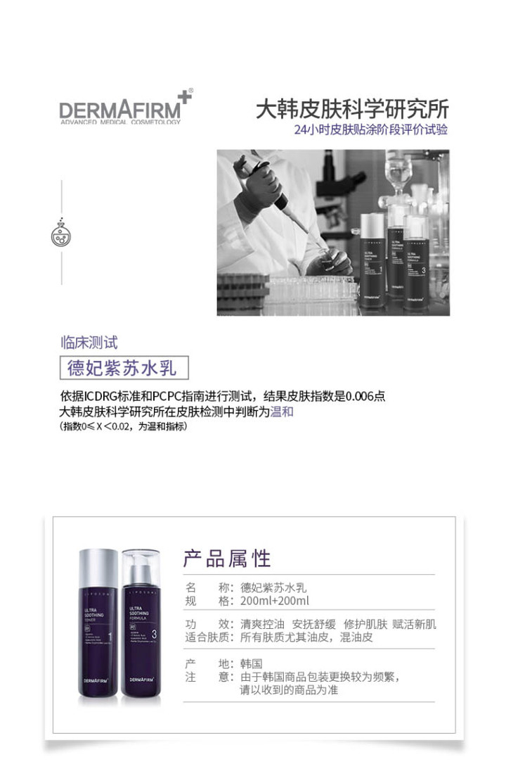 【 舒缓控油修护】韩国Dermafirm 德妃 限量版紫苏水乳套装新款 爽肤水200ml+乳液200ml