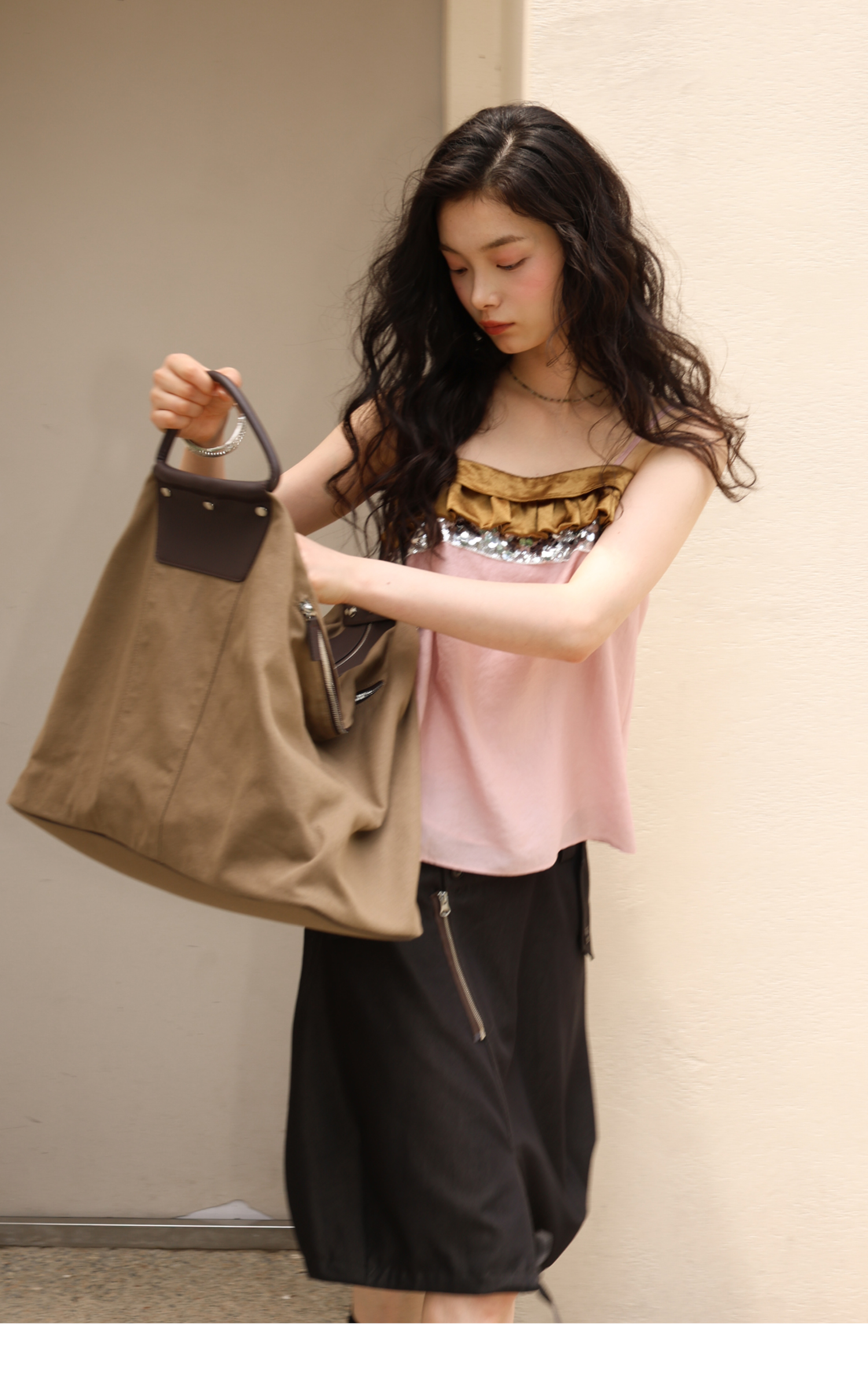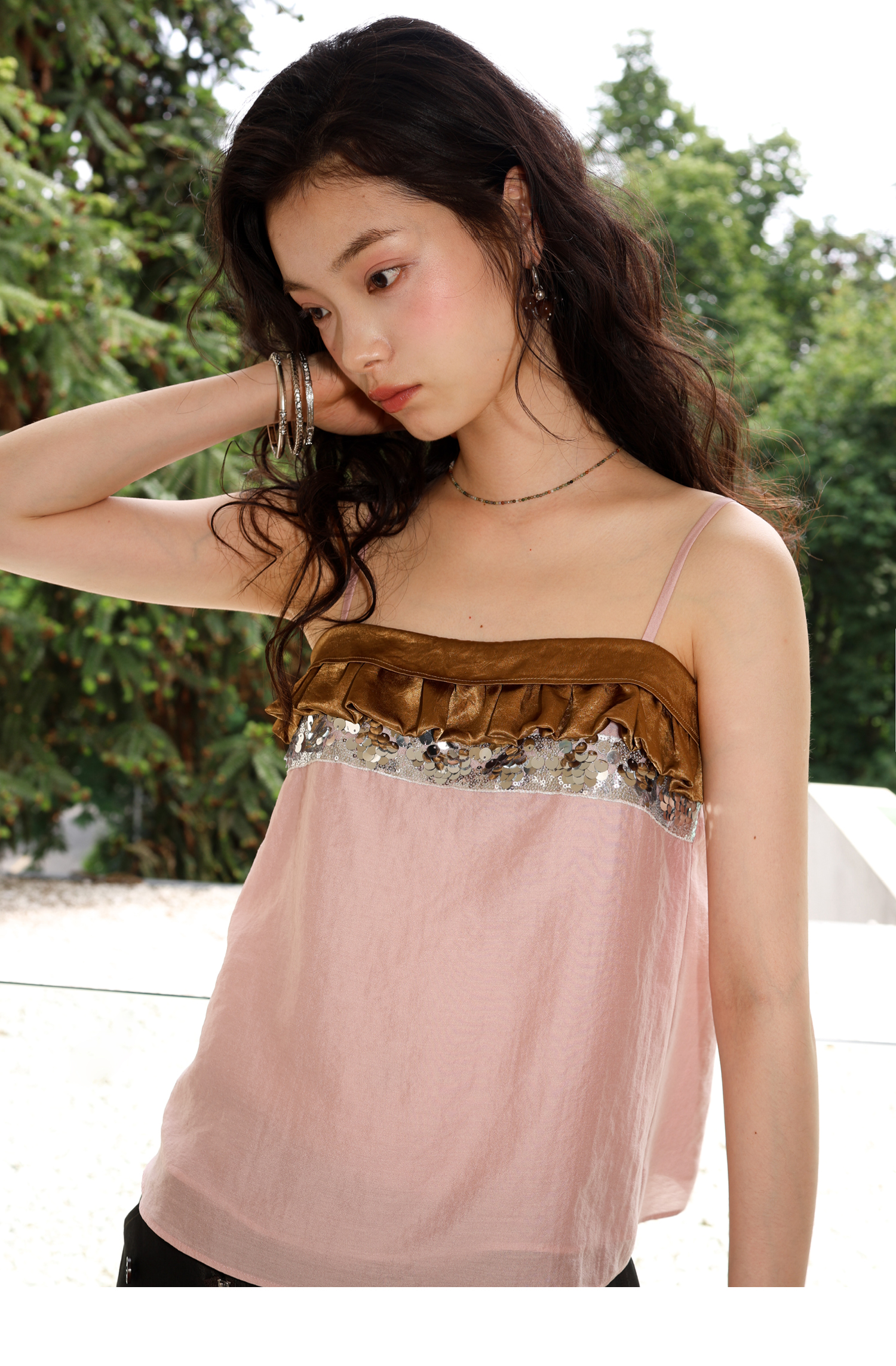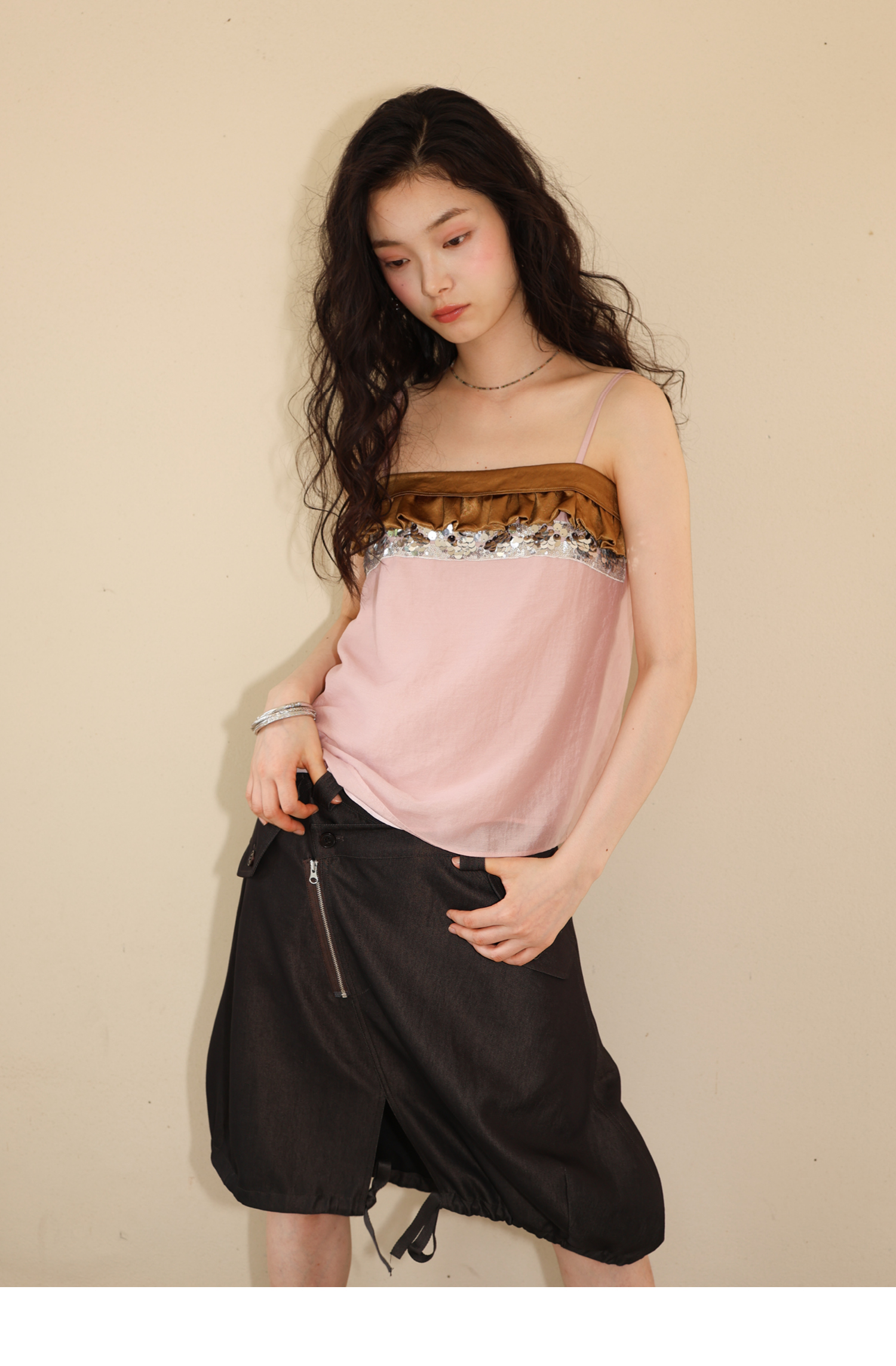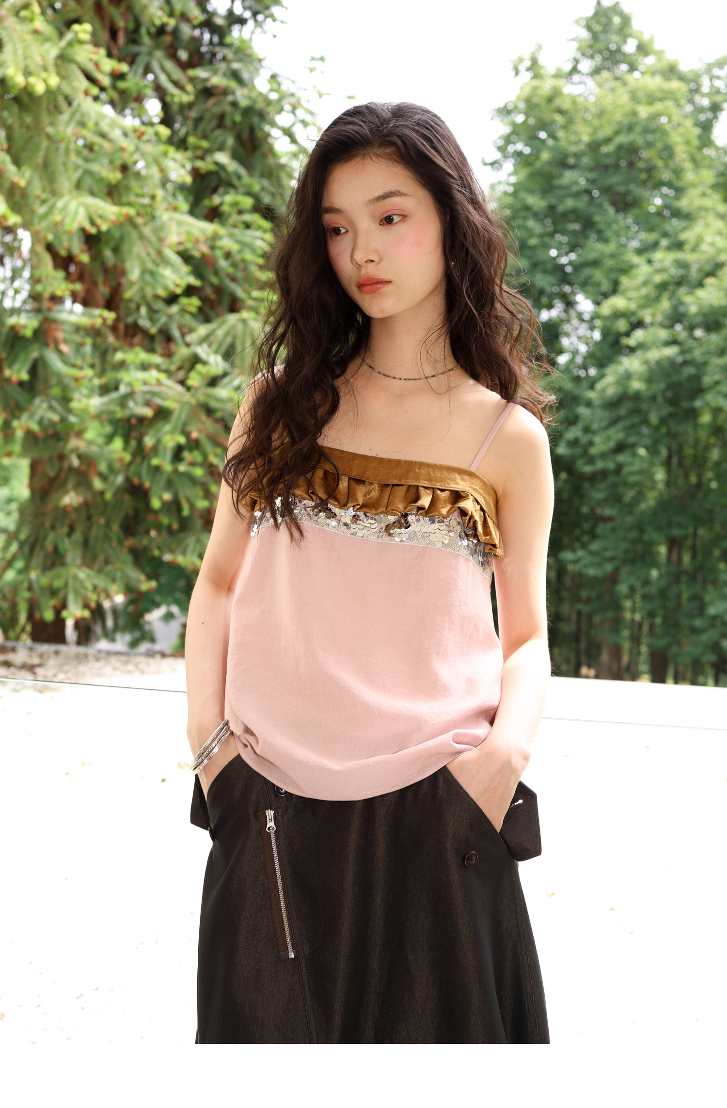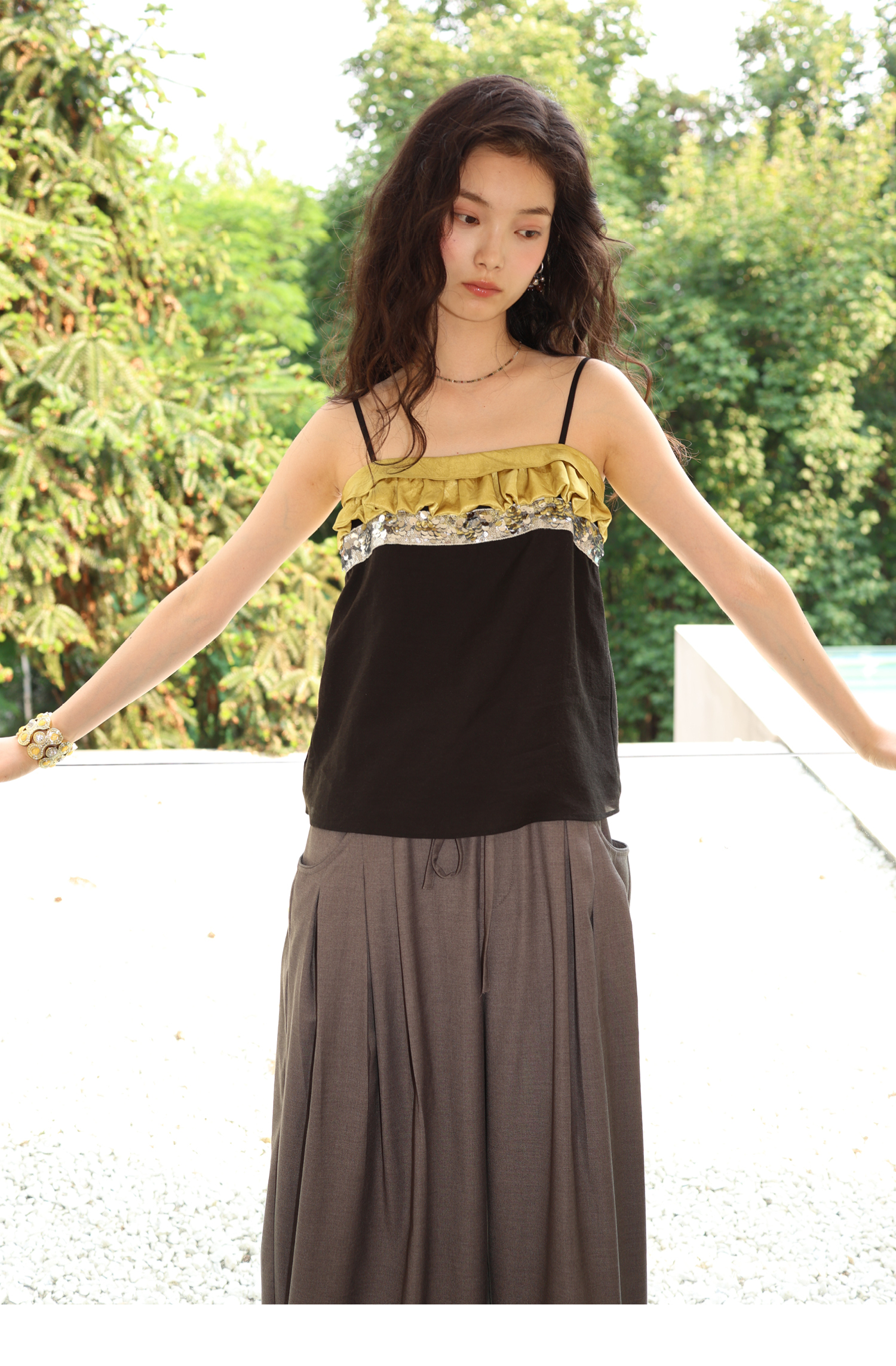 素舶 醋酸混纺光泽感透气撞色亮片织带吊带背心